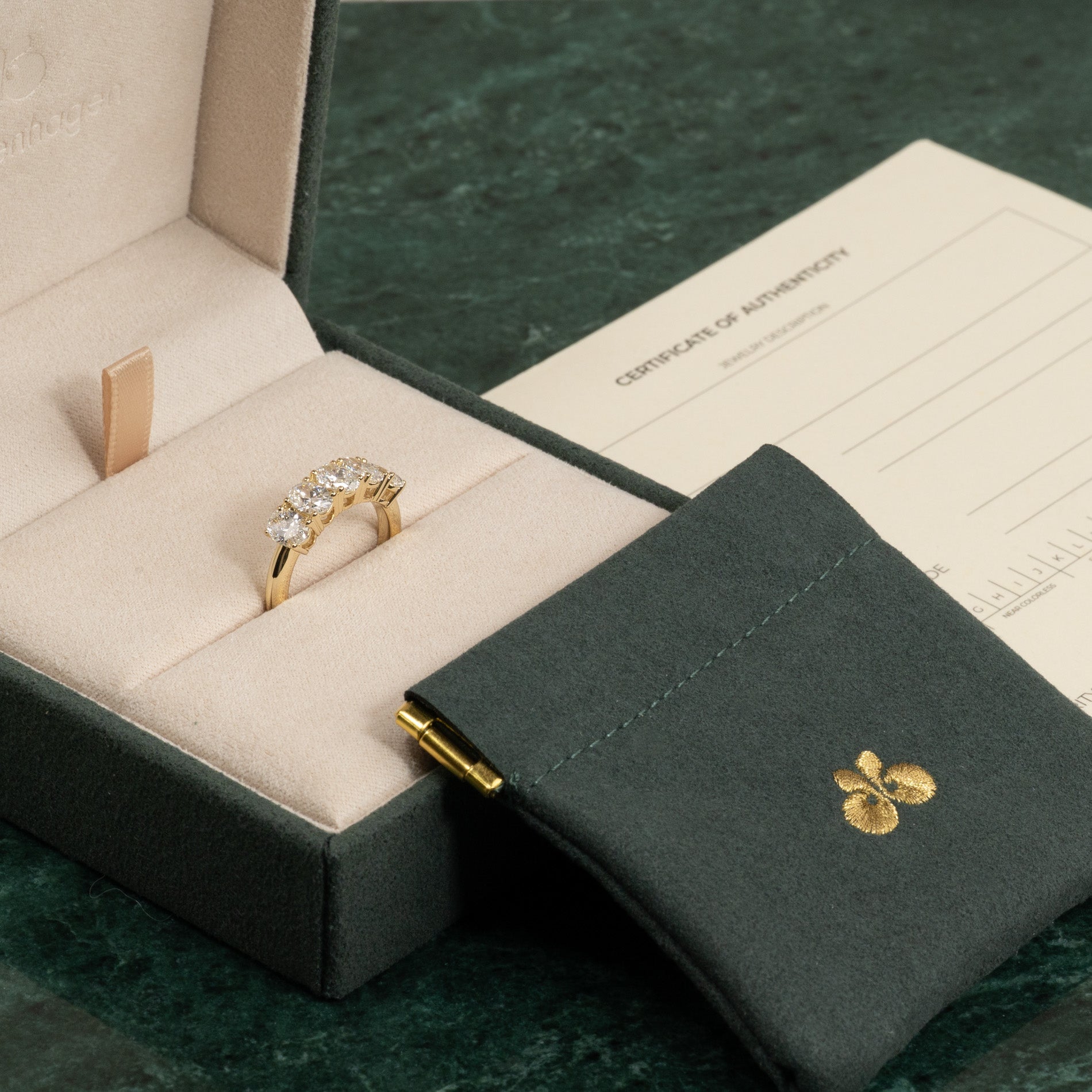 Når du mottar smykket, vil det være i vår gaveeske, bundet med et vakkert matchende silkebånd, klar til å gis som gave. Inne i esken finner du en smykkeboks, en pose og et ekthetsbevis.