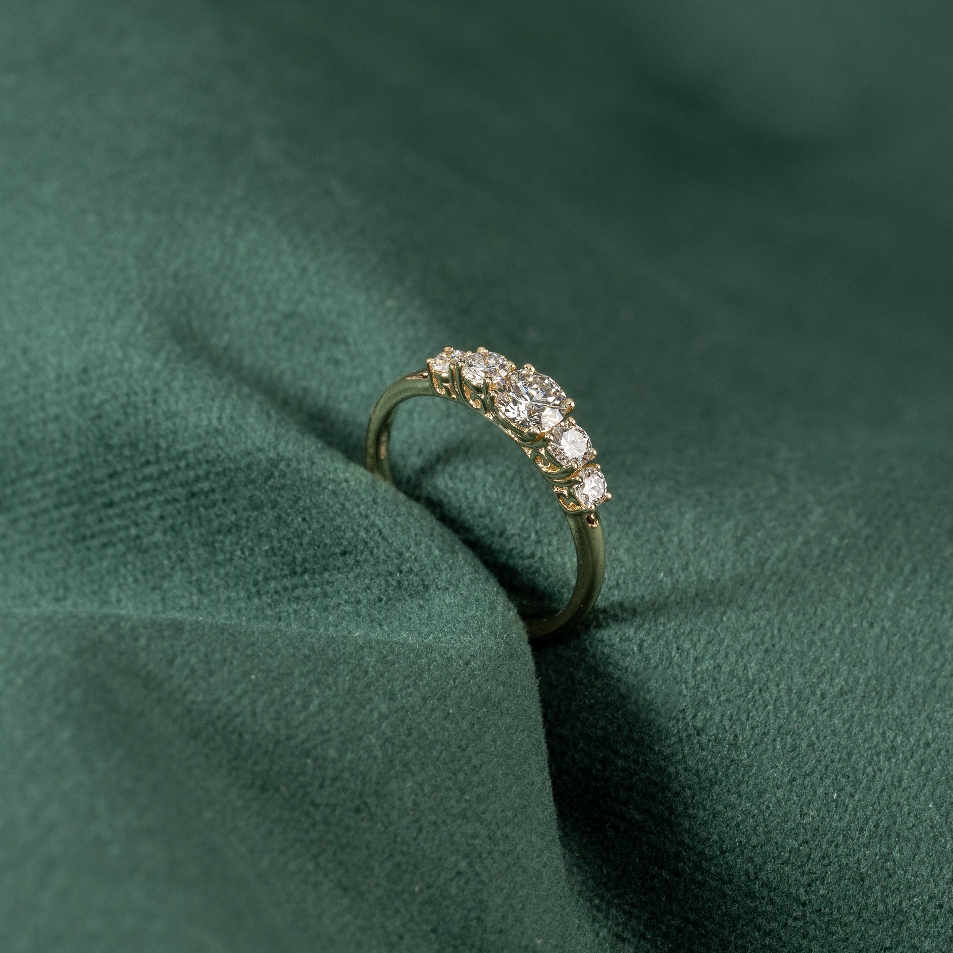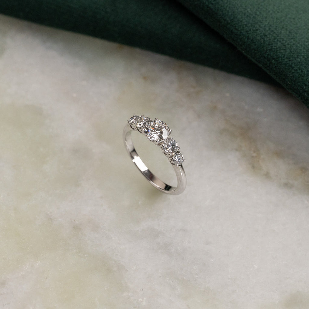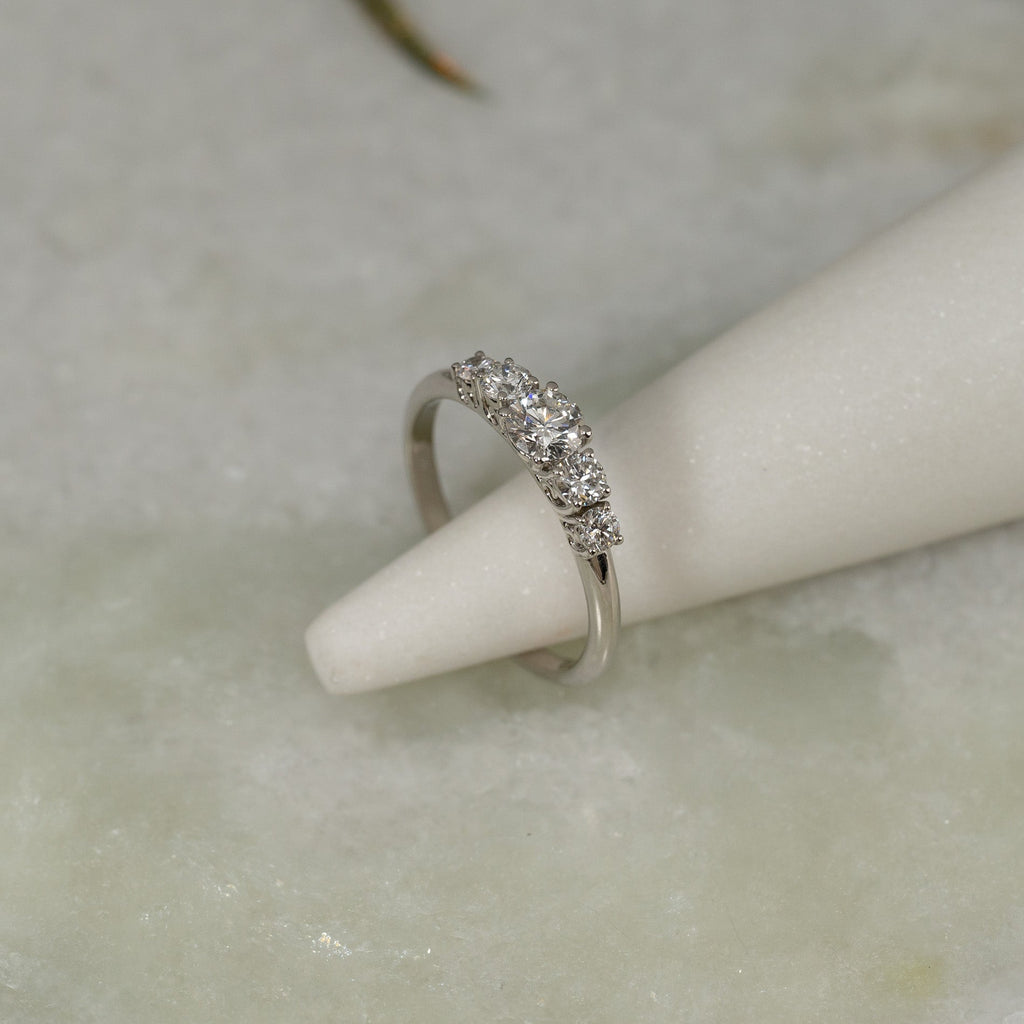 Ring med fem lab-grown diamanter. Ringen er designet med de fem diamantene i graderte størrelser rundt om senterstenen. Omfatningen er utformet som en trellis-omfatning, hvor grepene er vakkert og dekorativt flettet sammen mellom stenene.