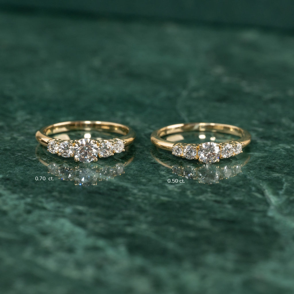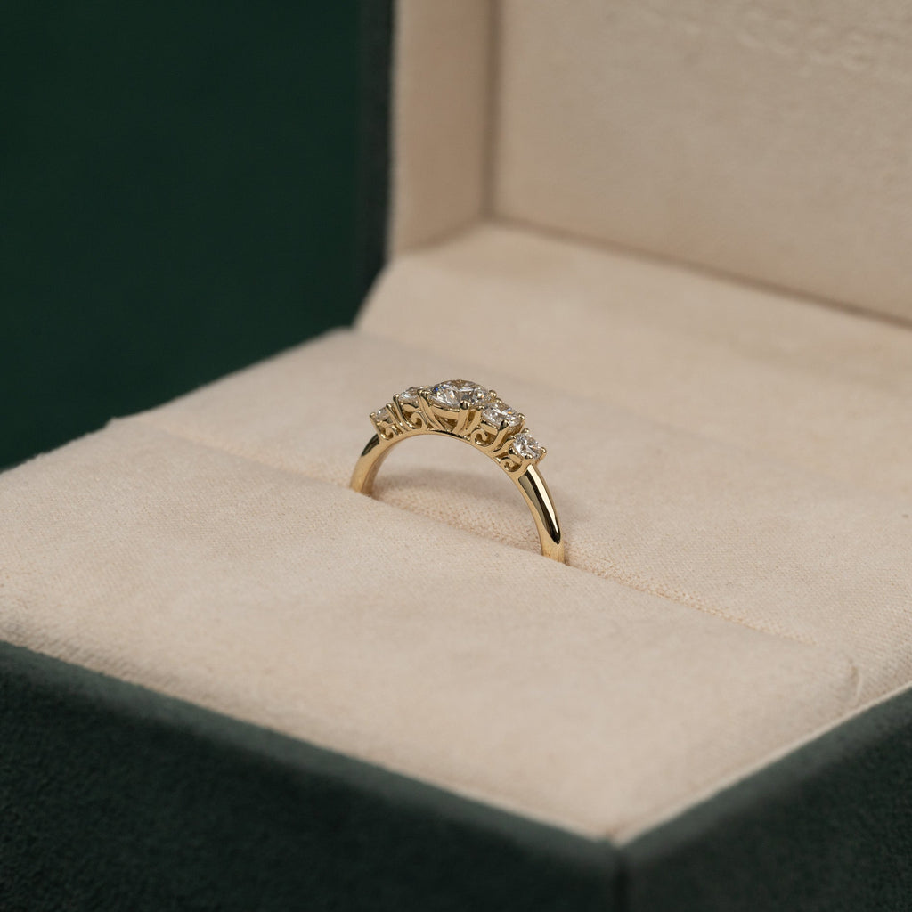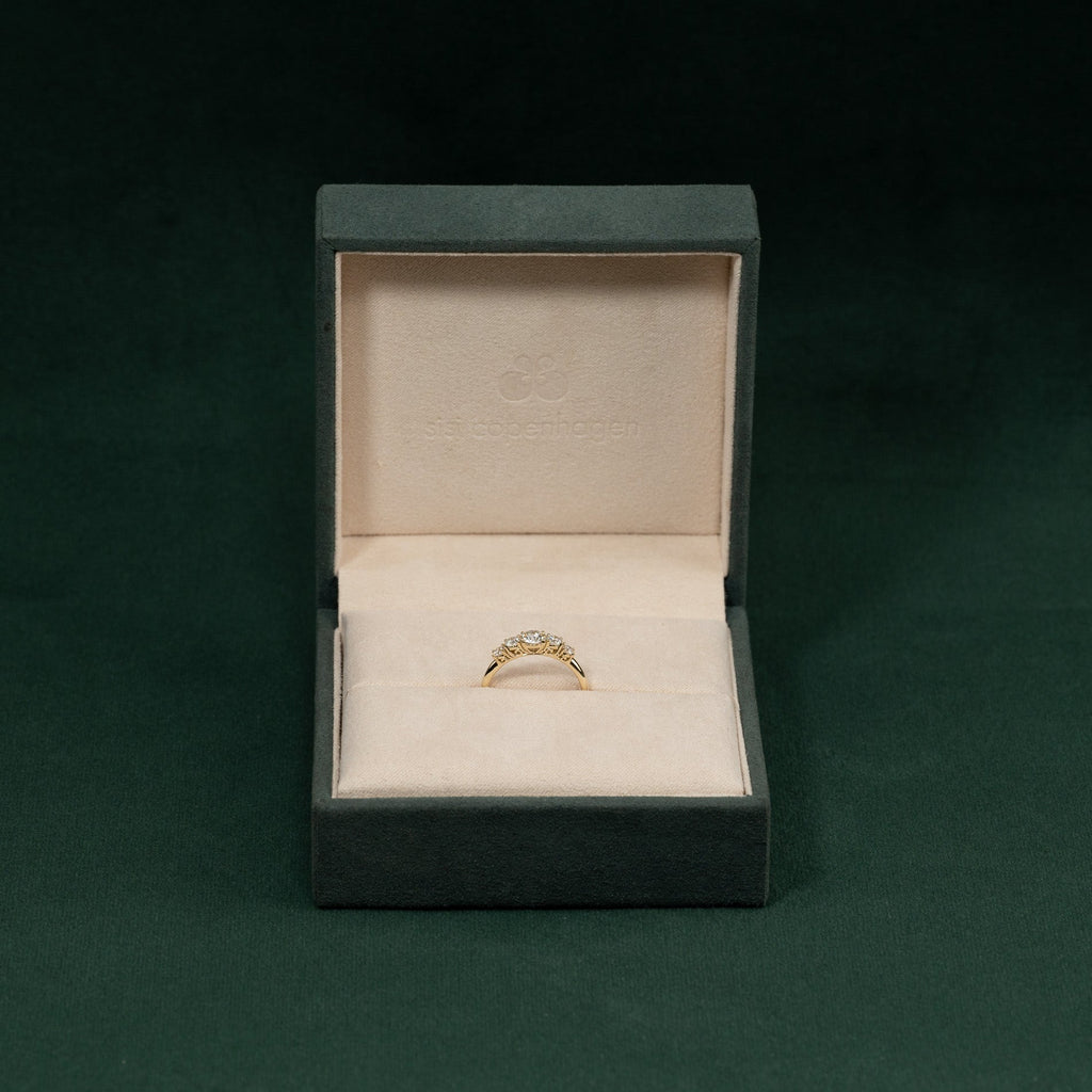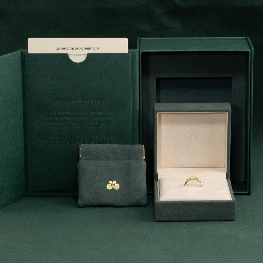 Ringen er i 14 karat massivt gull med fem etiske lab-grown diamanter på totalt 0,7 ct. Diamantene har fargen E/F (River-Top Wesselton) og klarheten VVS-VS. Smykket er laget med omtanke; diamantene er produsert med blant annet solenergi, og gullet er 100% sertifisert resirkulert.