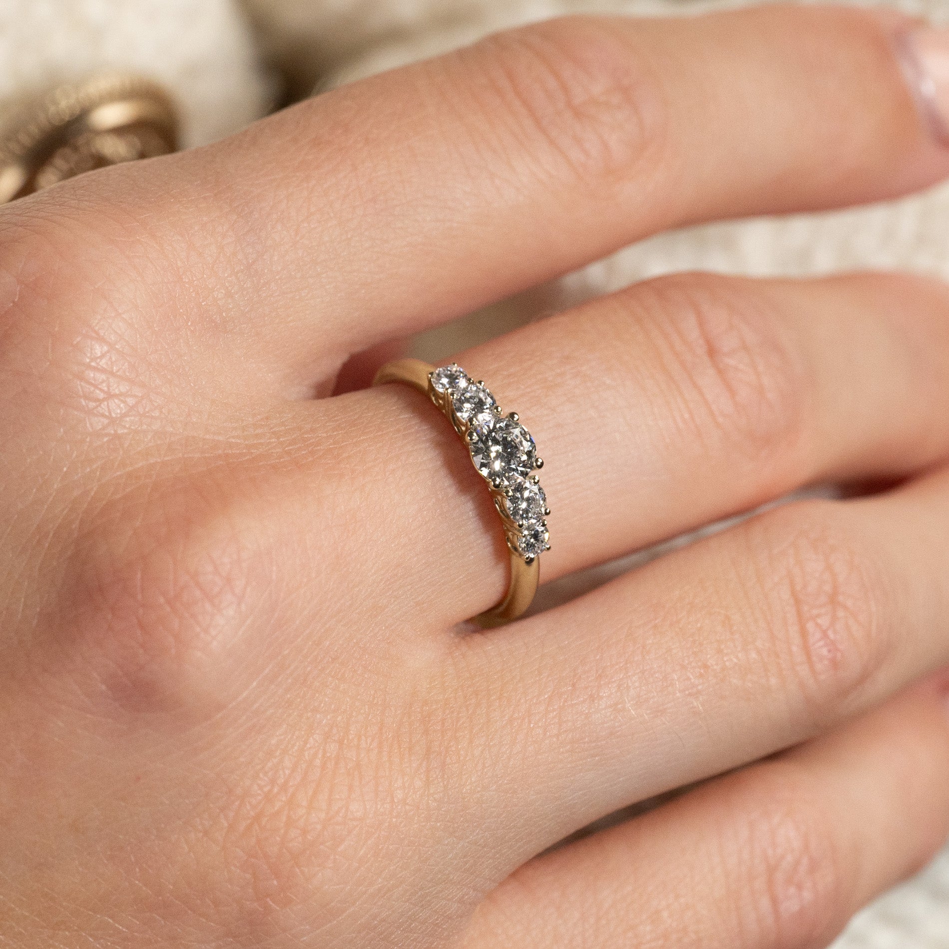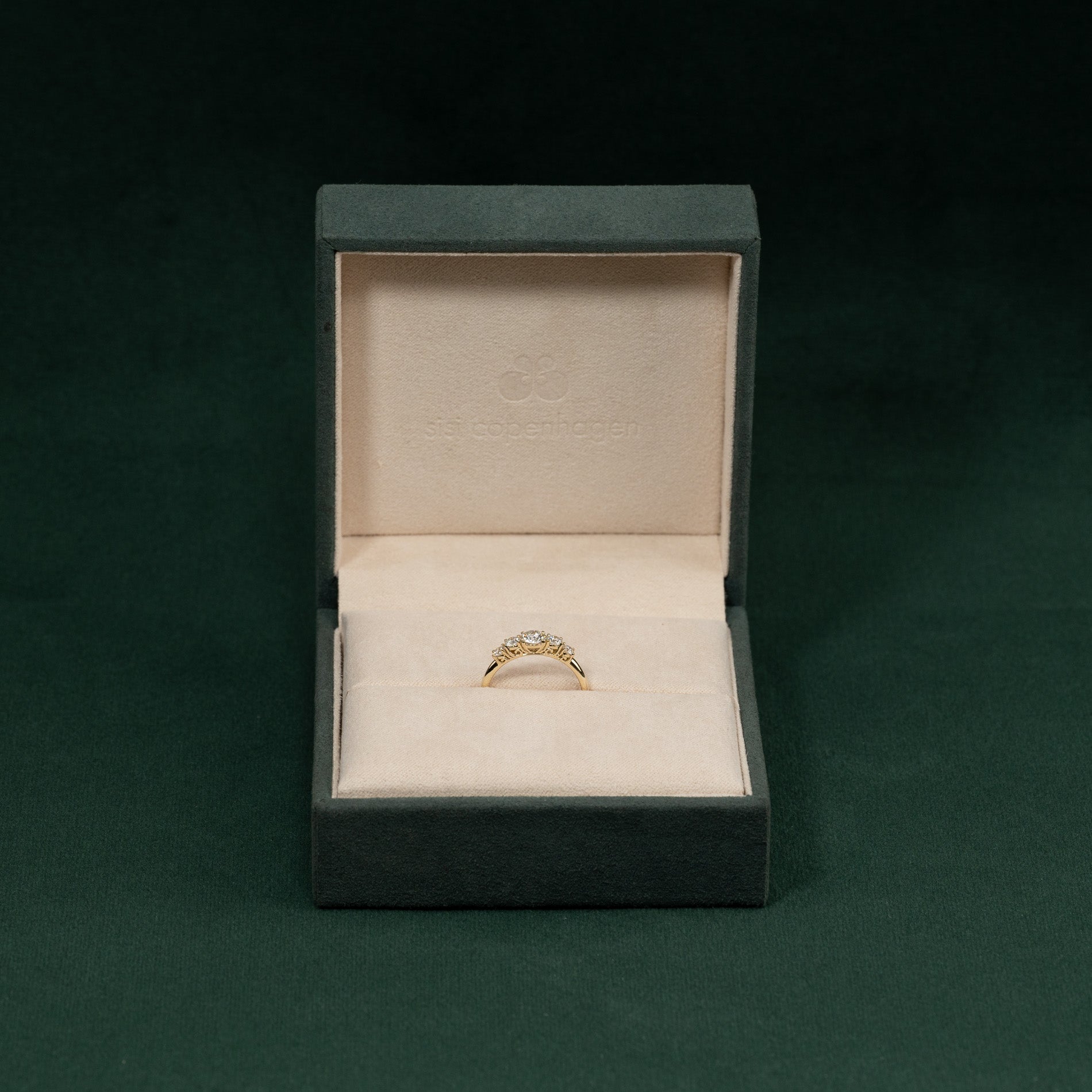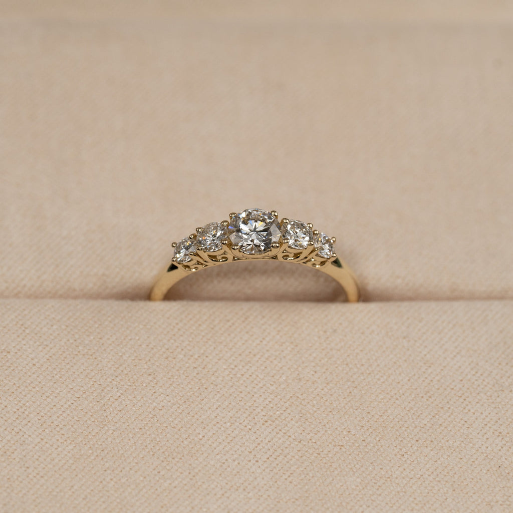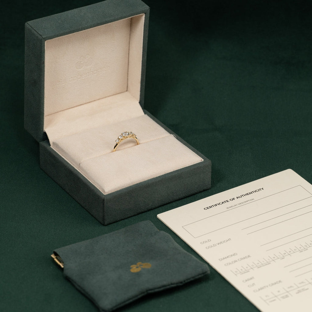 Ringen er i 14 karat massivt gull med fem etiske lab-grown diamanter på totalt 0,7 ct. Diamantene har fargen E/F (River-Top Wesselton) og klarheten VVS-VS. Smykket er laget med omtanke; diamantene er produsert med blant annet solenergi, og gullet er 100% sertifisert resirkulert.
