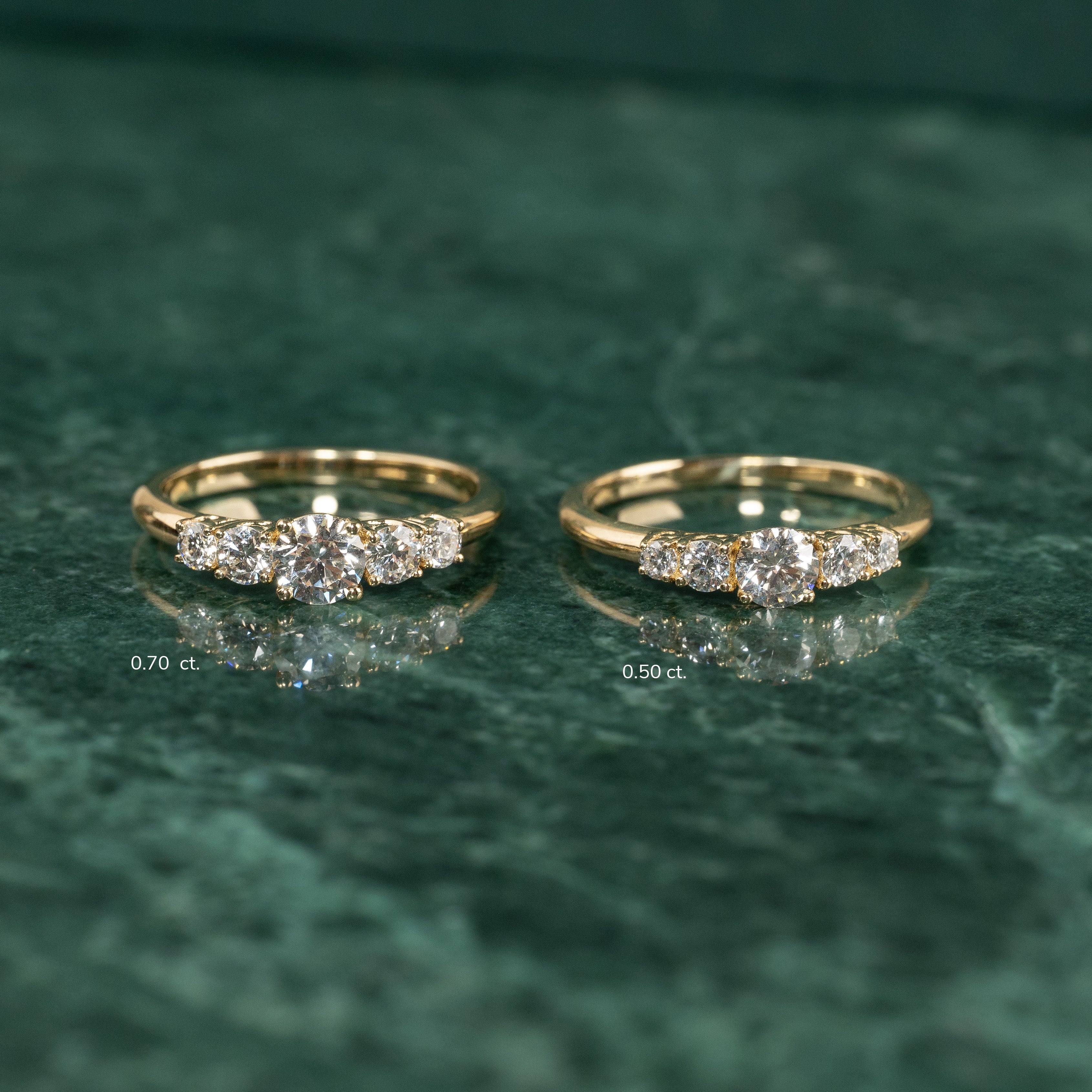 Ring i 14 karat gull med fem lab-grown diamanter på totalt 0,7 ct. Av dette er centerstenen på 0,4 ct.