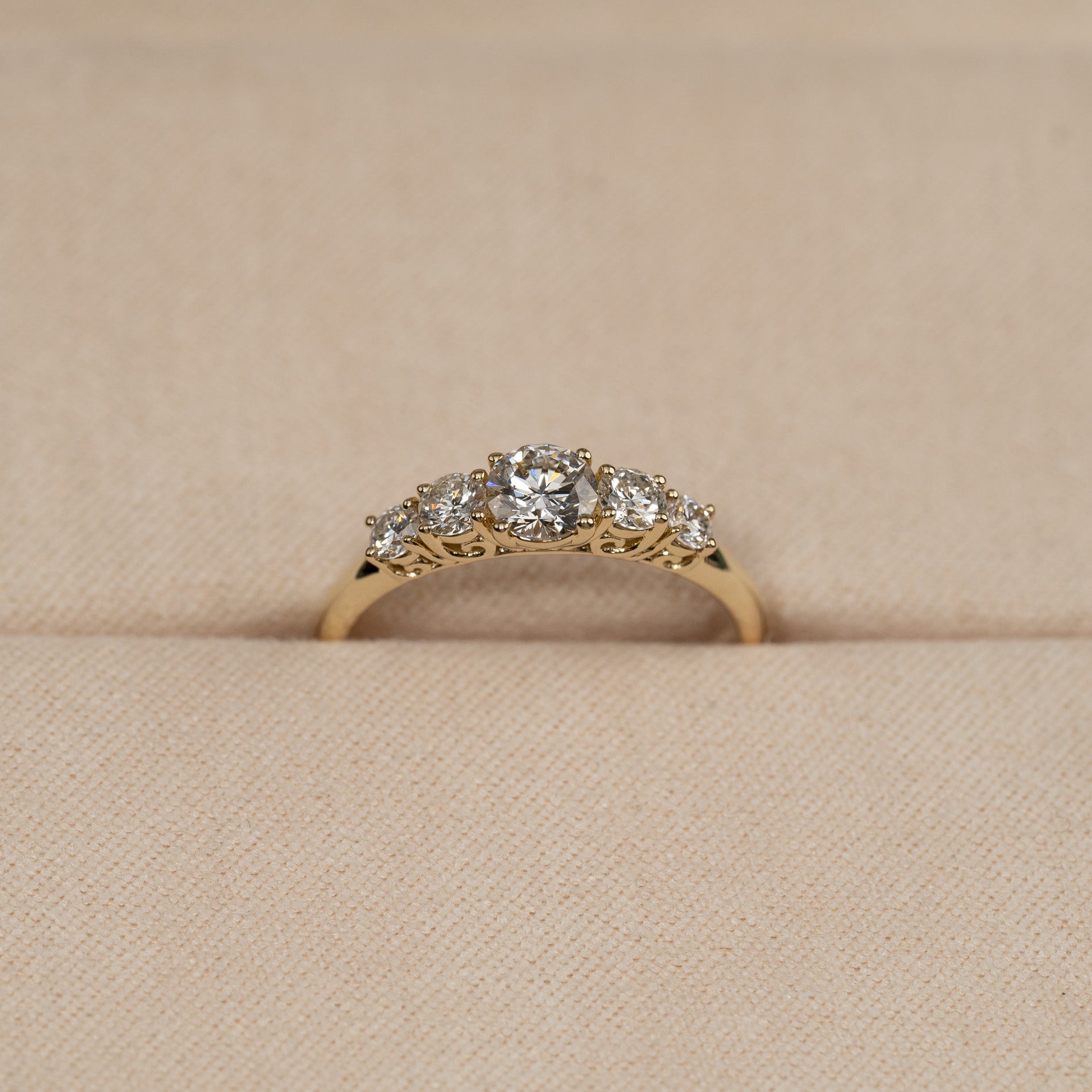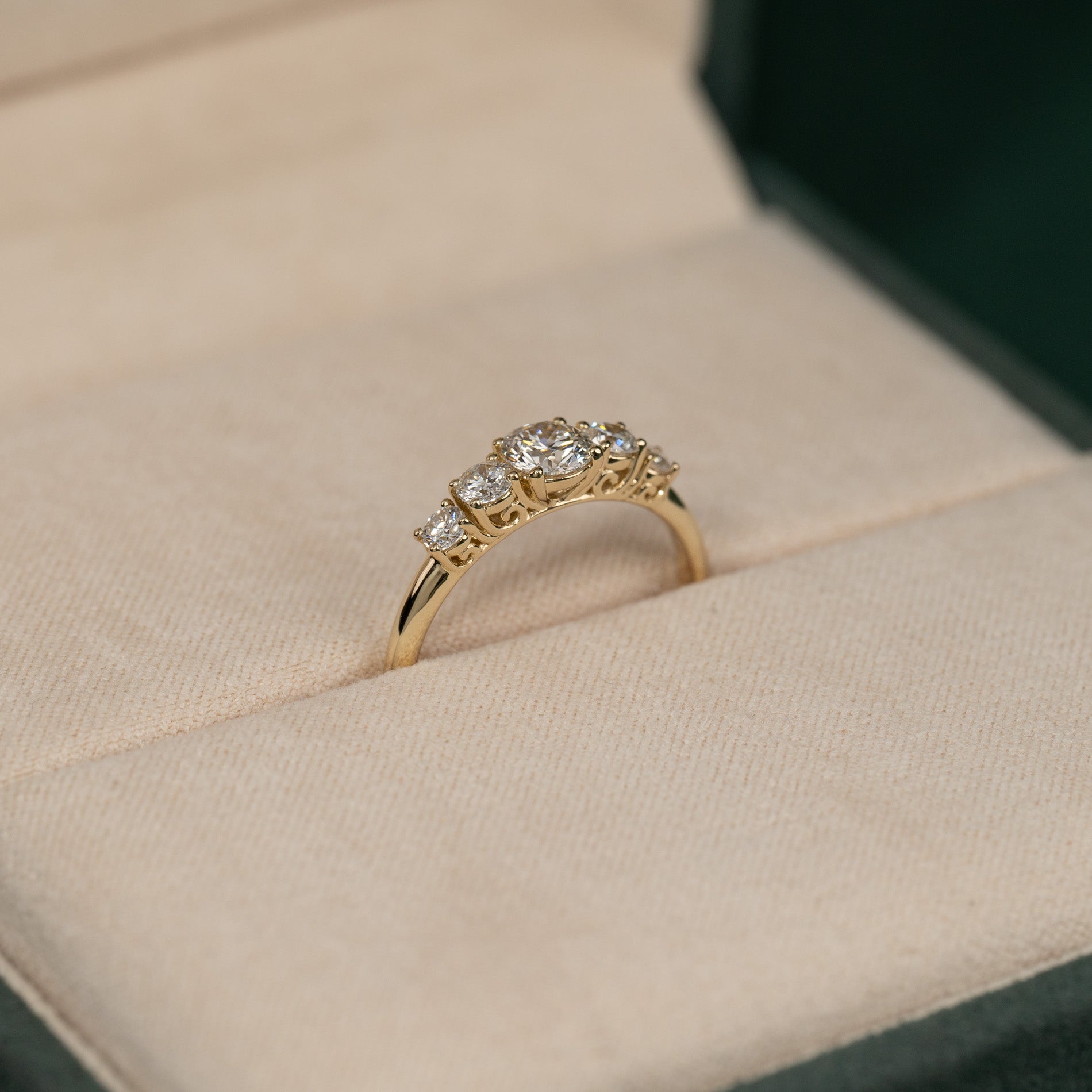 Ringen er designet med de fem diamantene i gradert størrelse rundt centerstenen. Fatningen er designet som en trellis-fatning, der kloene vakkert og dekorativt flettes mellom stenene – et klassisk og tidløst smykke. Ringen er egnet som en fin og romantisk forlovelsesring.