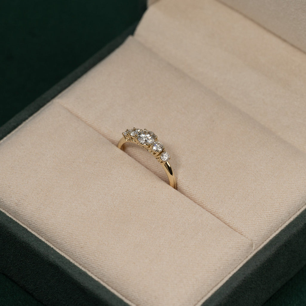 Ringen er i 14 karat massivt gull med fem lab-grown diamanter på totalt 0,7 ct. Diamantene har fargen E/F (River) og klarheten VVS. Smykket er laget med omtanke; diamantene er produsert med blant annet solenergi, og gullet er 100% sertifisert resirkulert.