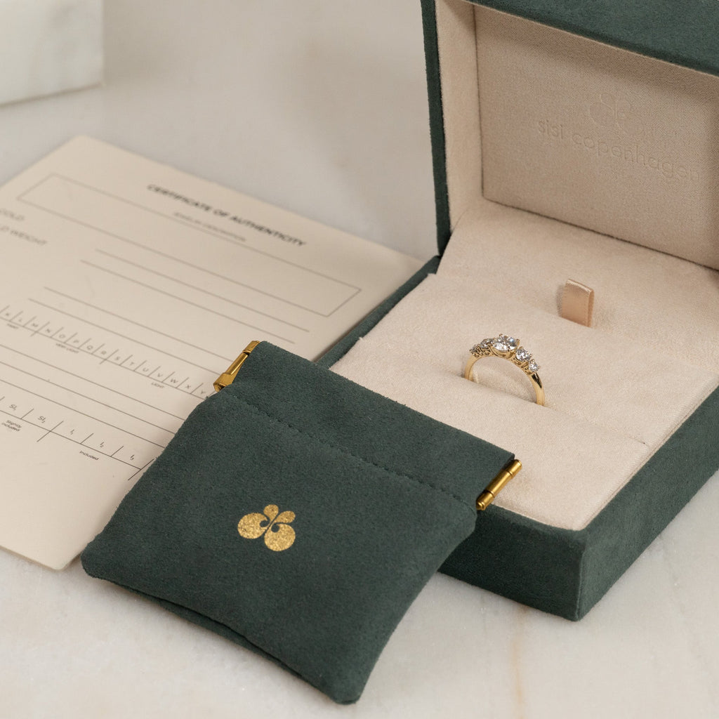 Når du mottar smykket, vil det være i vår gaveeske, bundet med et vakkert matchende silkebånd, klar til å gis som gave. Inne i esken finner du en smykkeboks, en pose og et ekthetsbevis.