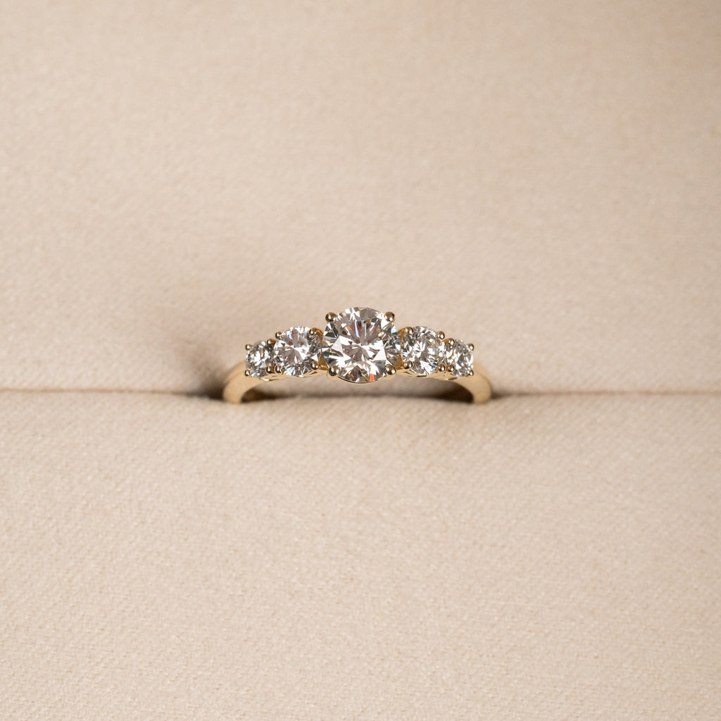 Ringen er designet med de fem diamantene i graderende størrelser rundt midtsteinen. Innfatningen er utformet som en espalierfatning der spissene er vakkert og dekorativt flettet sammen mellom steinene - et klassisk og tidløst smykke. Ringen egner seg godt som en fin og romantisk forlovelsesring.