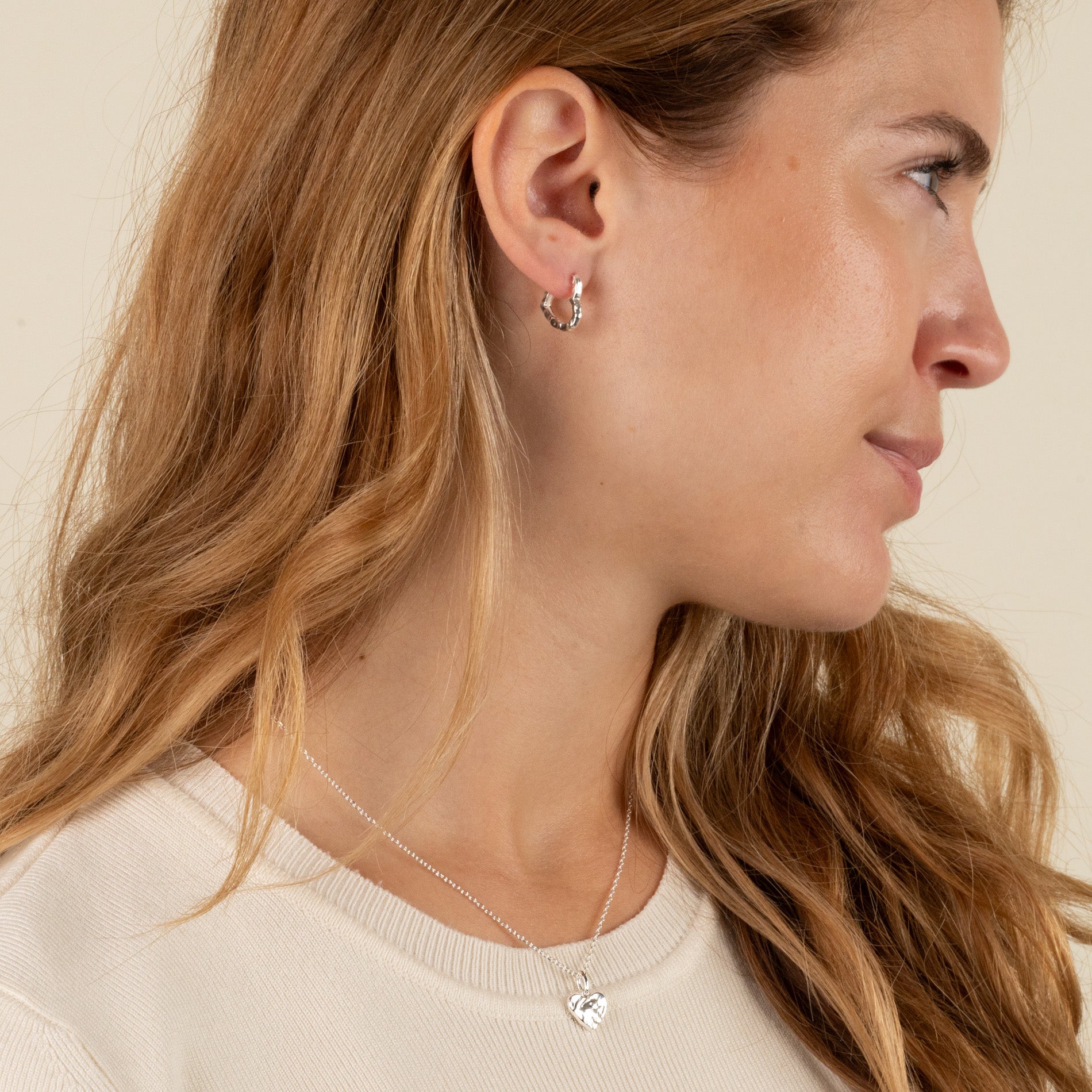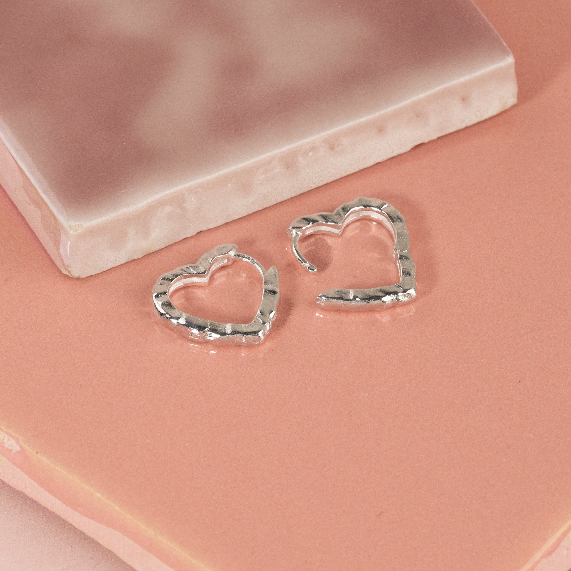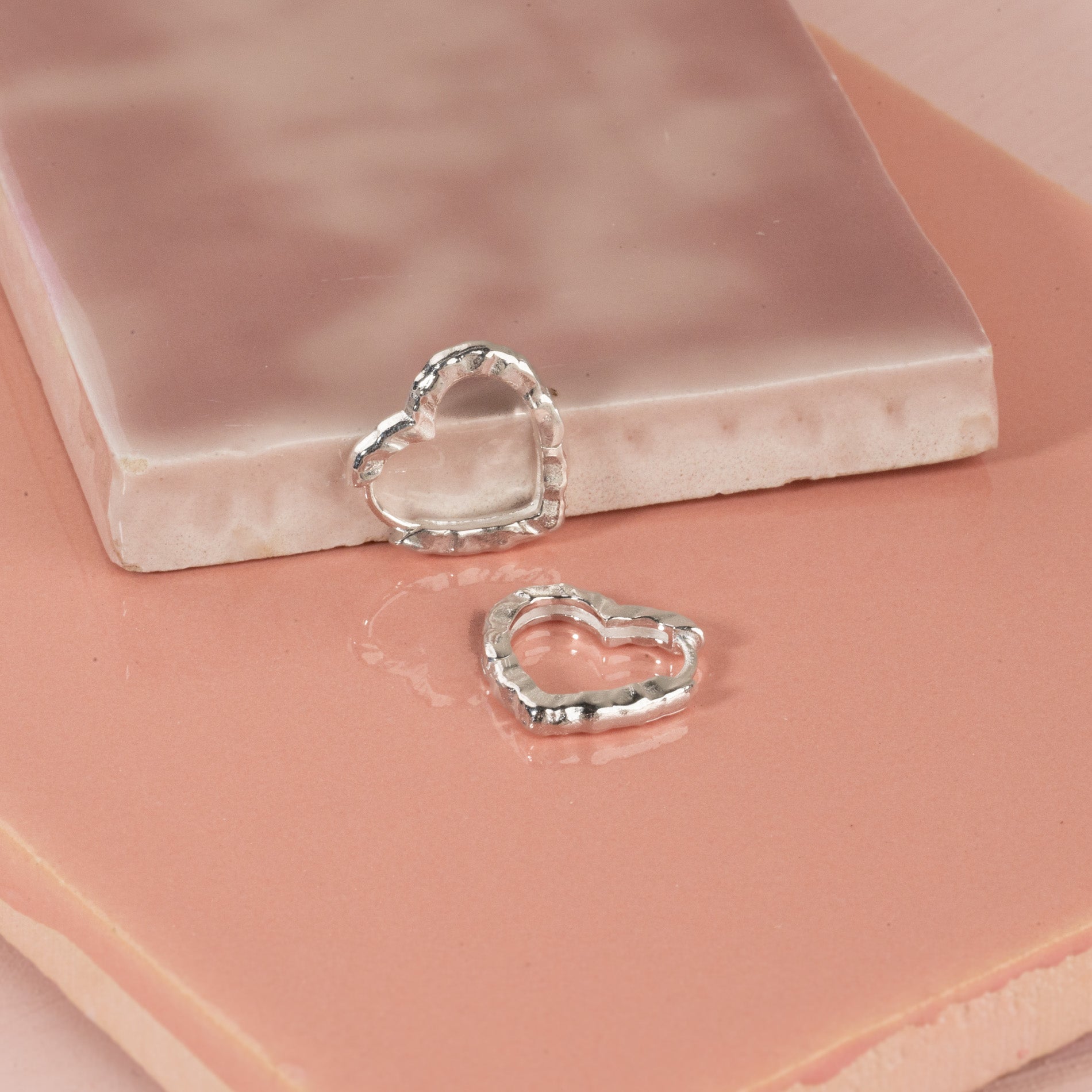 Disse creolene har et hjerteformet design med en overflate inspirert av smeltet metall. Øredobbene er et fint symbol på kjærlighet, med unike detaljer og et moderne og rått utseende. Selve creolen har en diameter på 15 mm.
