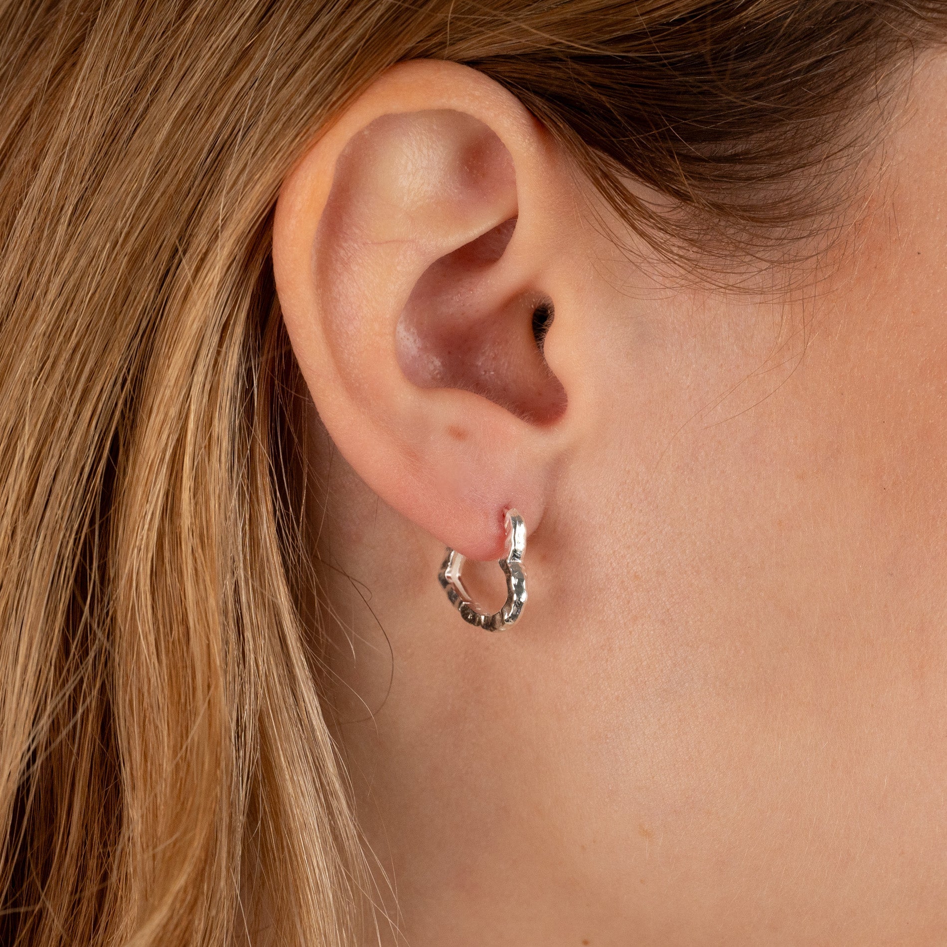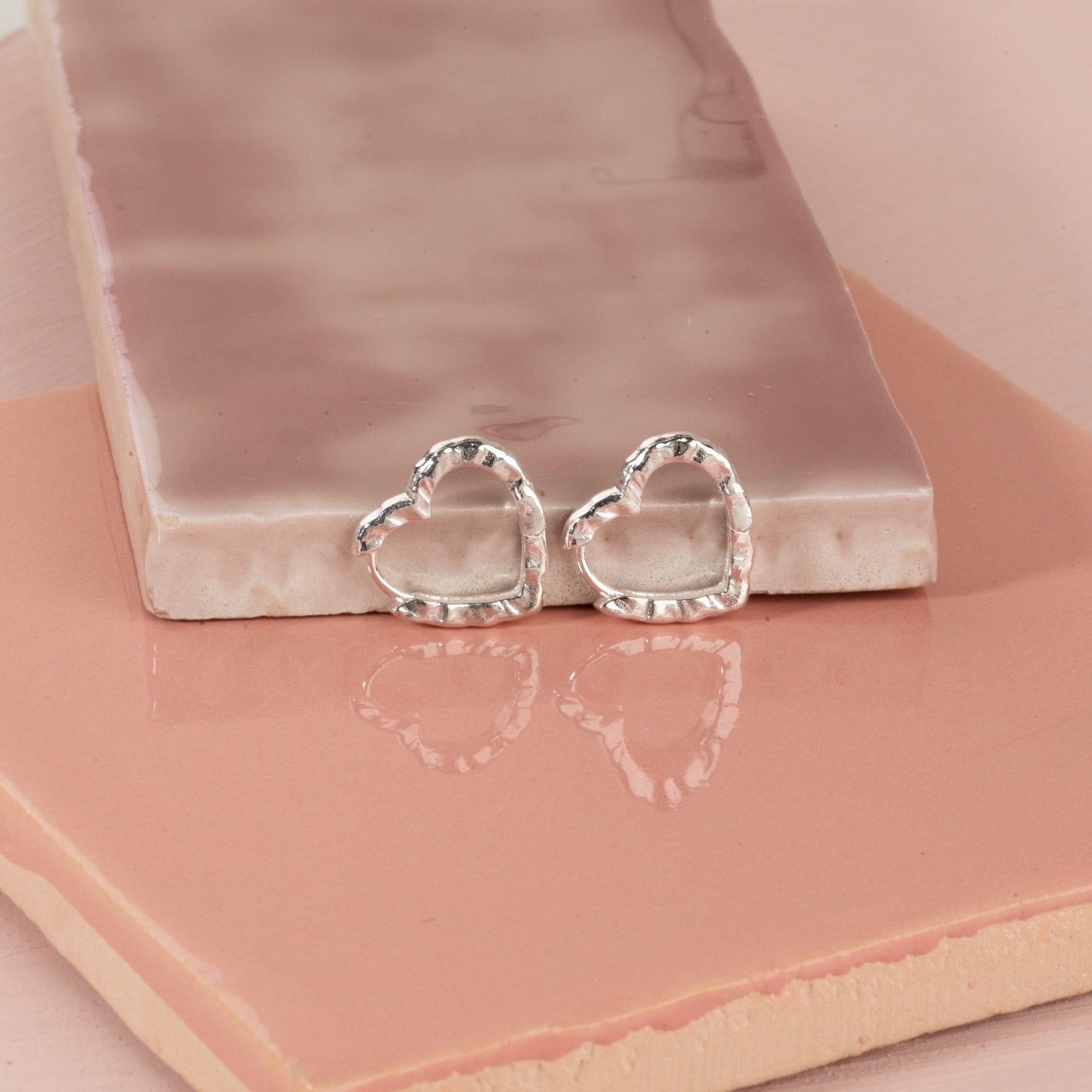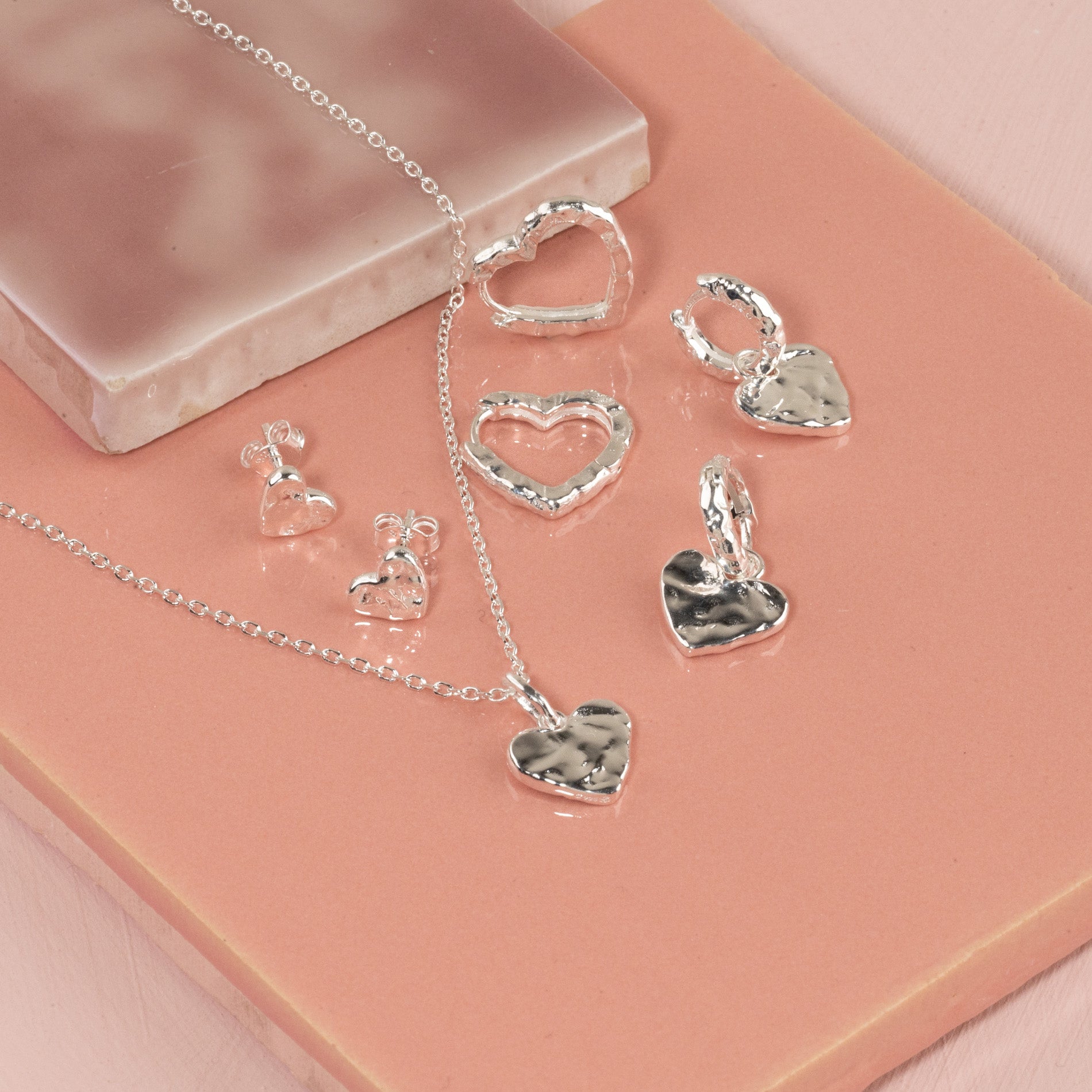 Disse creolene har et hjerteformet design med en overflate inspirert av smeltet metall. Øredobbene er et fint symbol på kjærlighet, med unike detaljer og et moderne og rått utseende. Selve creolen har en diameter på 15 mm.