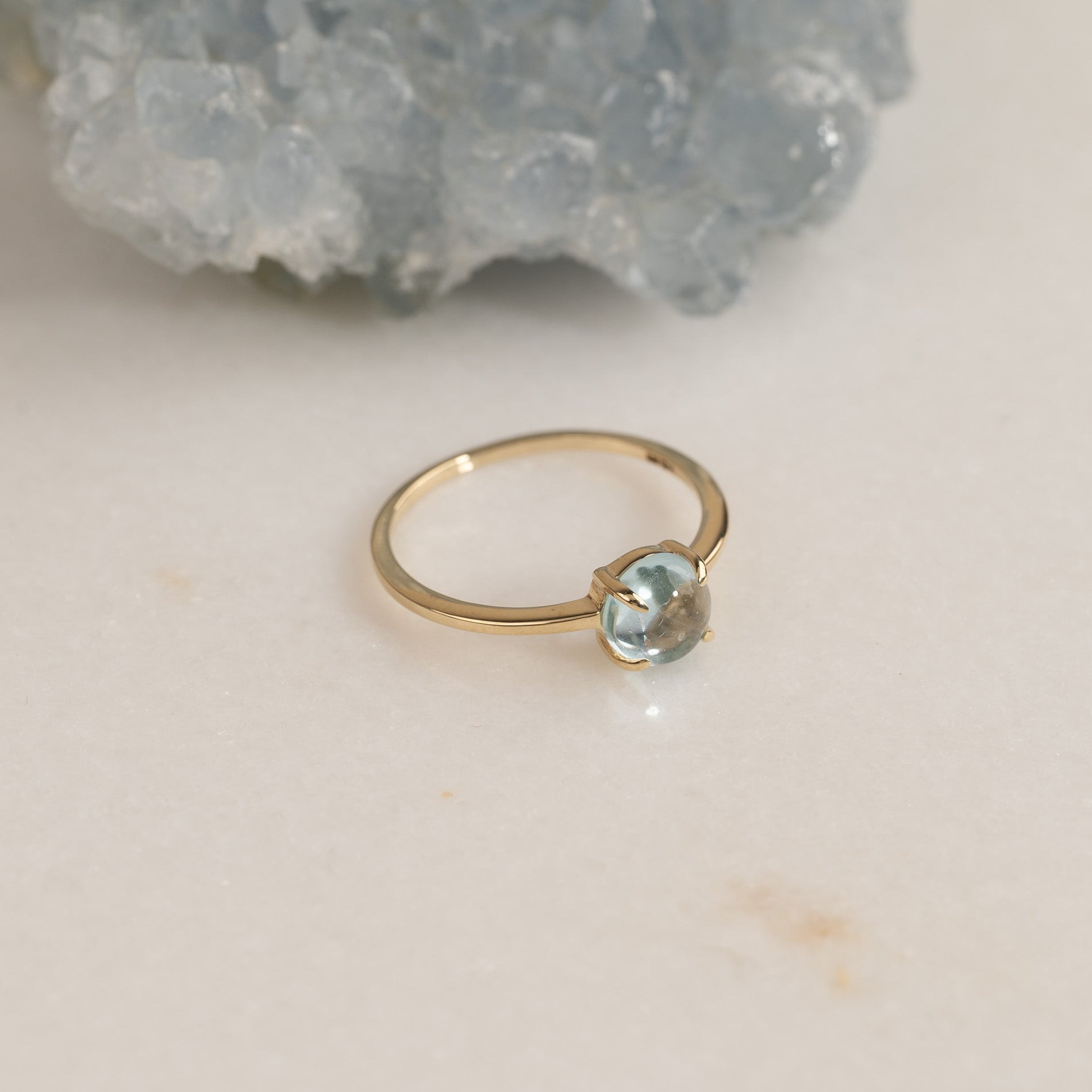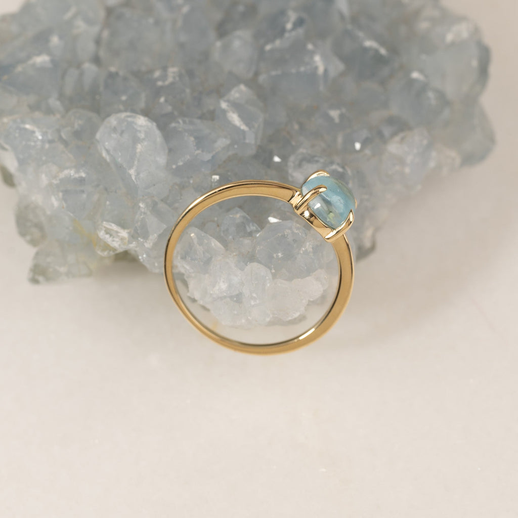 Ring i 100% resirkulert 9 karat massivt gull med en vakker cabochon-slipt blå topas.