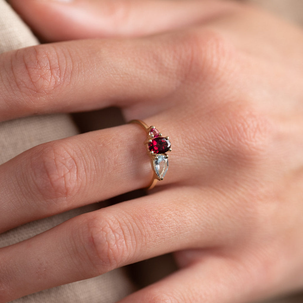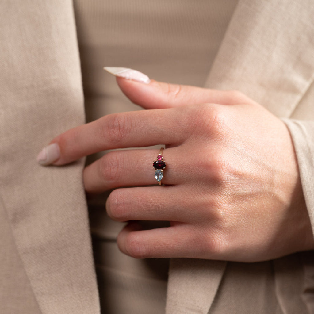 De vakre halvedelstenene gir ringen en vakker og iøyenfallende detalj. Stenene har ulike former, som gir en liten kant ringen. Den lyseblå, mørkerøde og rosa fargen fremhever et helt unikt design og skiller seg ut.