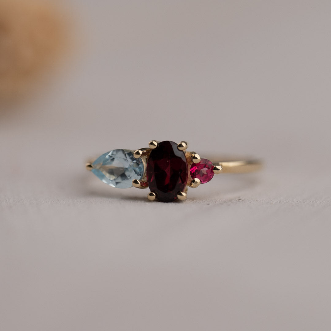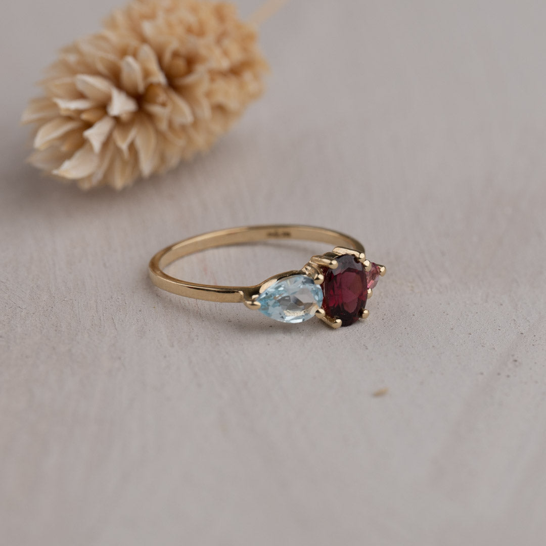 Ring inn 9 karat gull. Ringen har en blå topas, en rød rodonitt og en rosa topas.