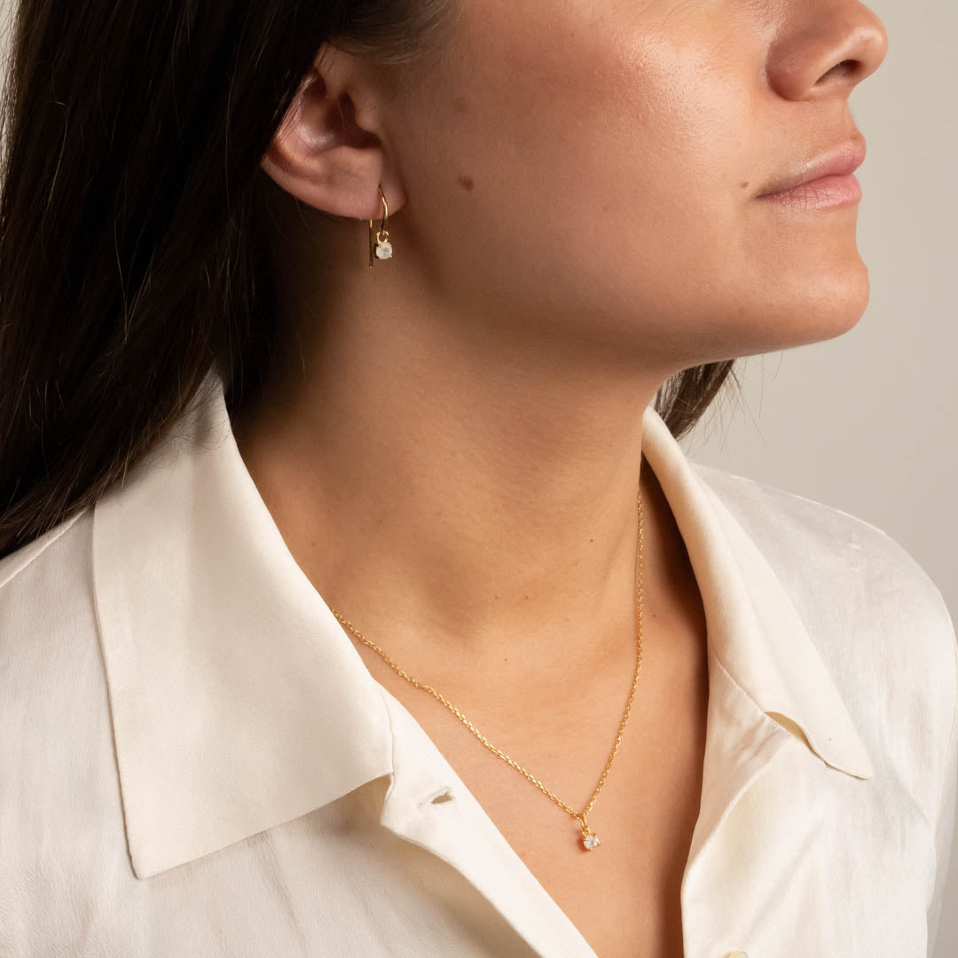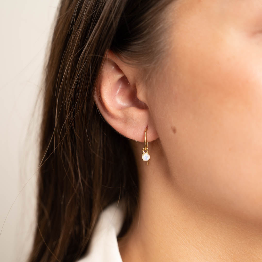 Øreringer i 18 karat forgylt 925 sterlingsølv med månestensbesatt anheng. Stenen måler ø 4mm og er satt i en klassisk omfatning. De fine øreringene er tidløse klassikere for både hverdag og fest, og kan bæres alene eller med flere øreringer.