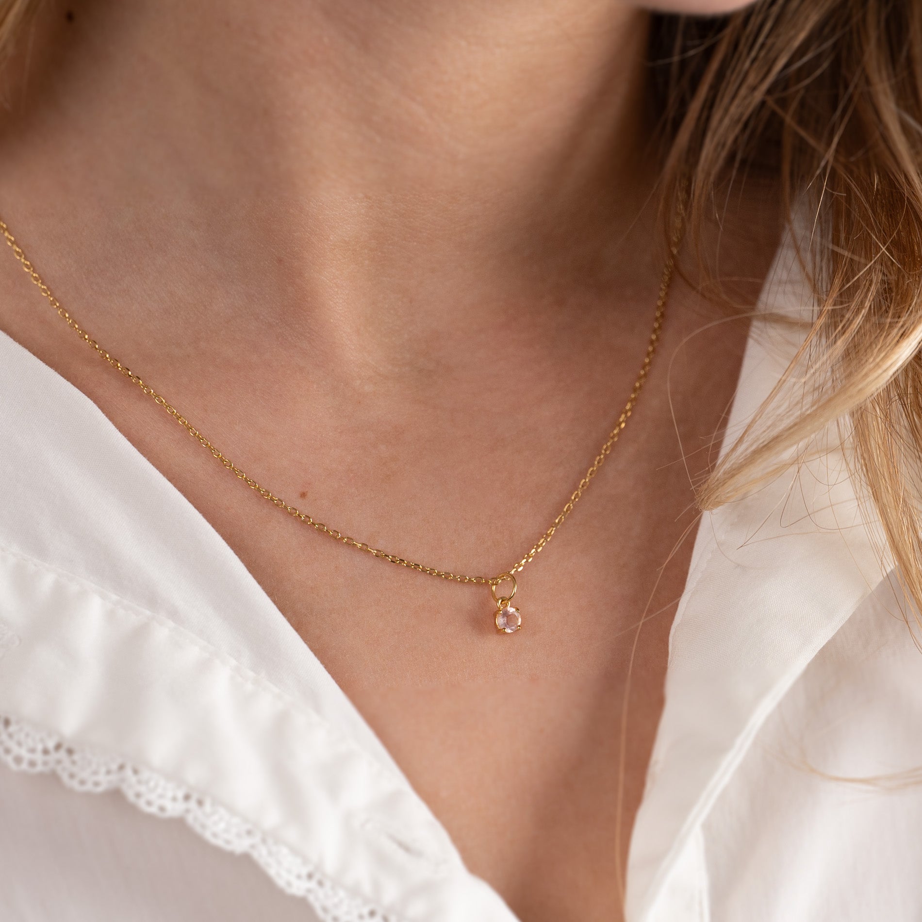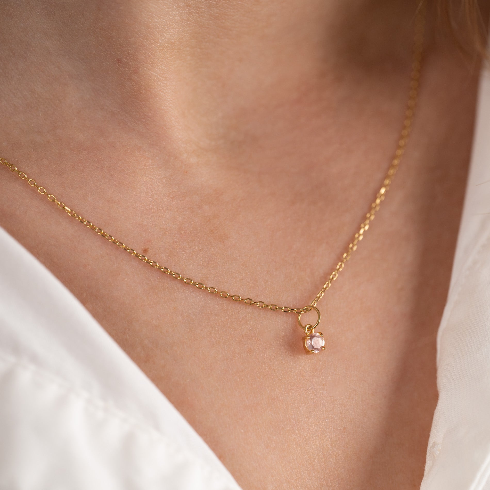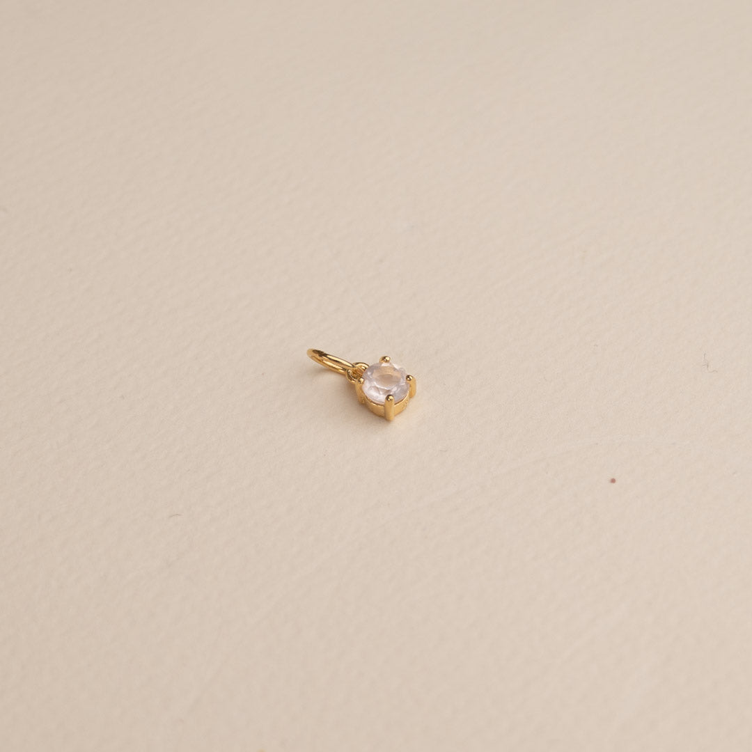 Anheng i 18 karat forgylt 925 sterlingsølv med rosenkvarts. Steinen måler ø 4 mm, og er satt i en klassisk omfatning.