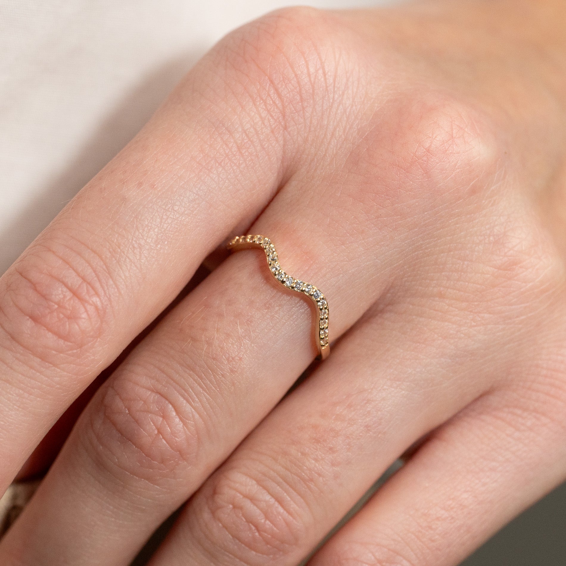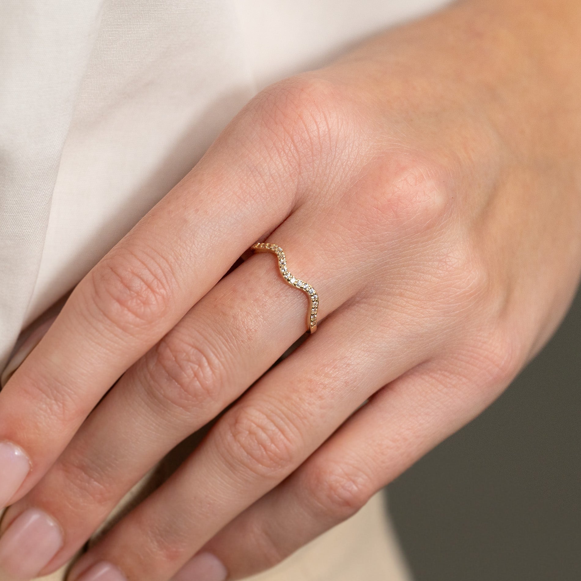 Ringen har en lett bølgende form og et enkelt design som gir et feminint uttrykk med de elegante klare zirkoner som sitter langs fronten og glimrer i lyset.