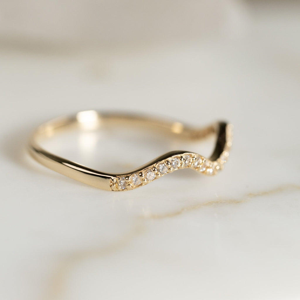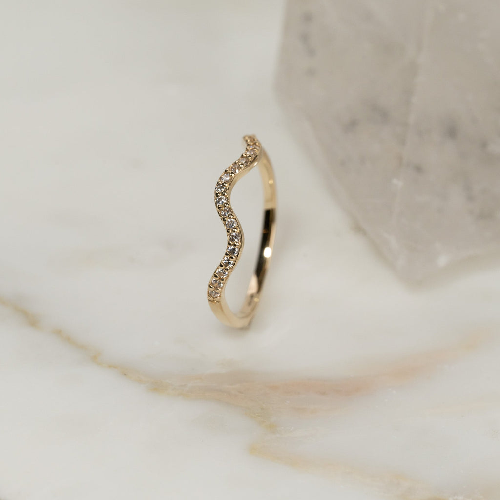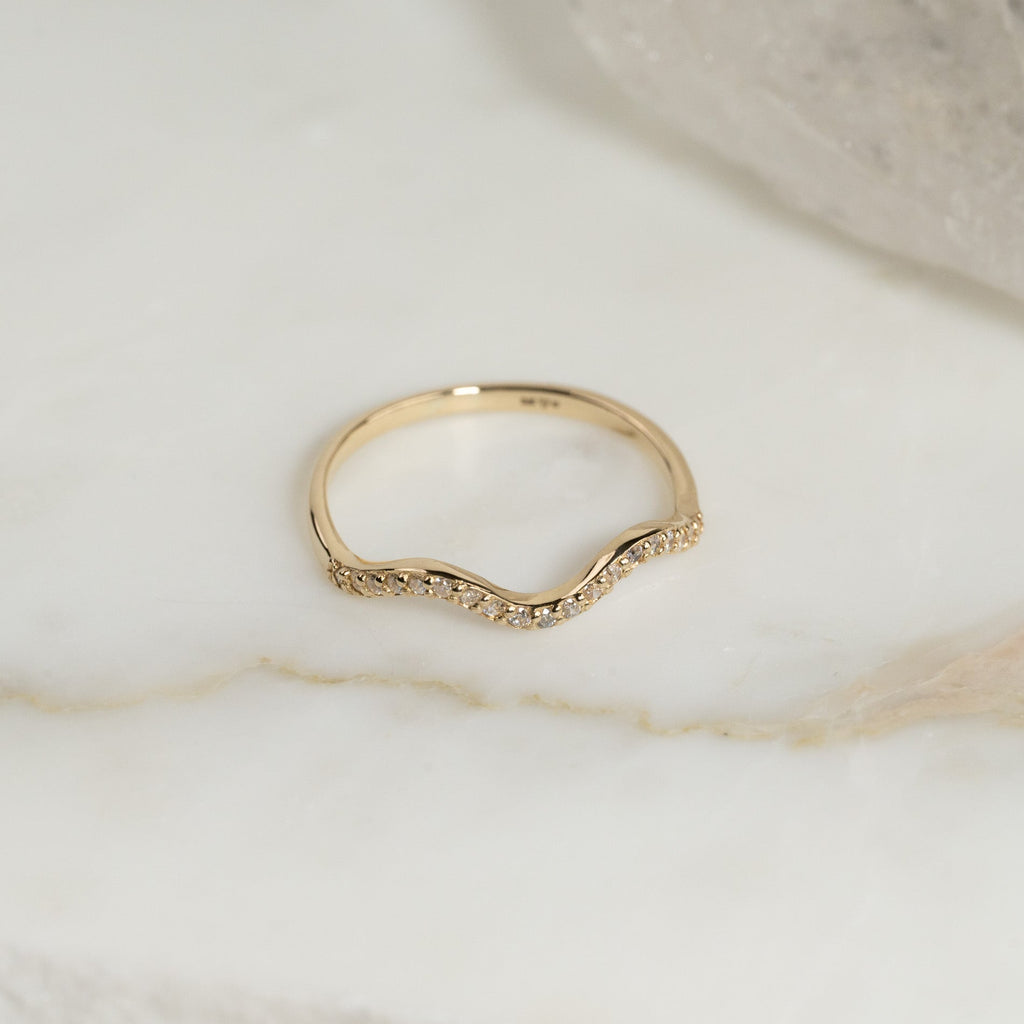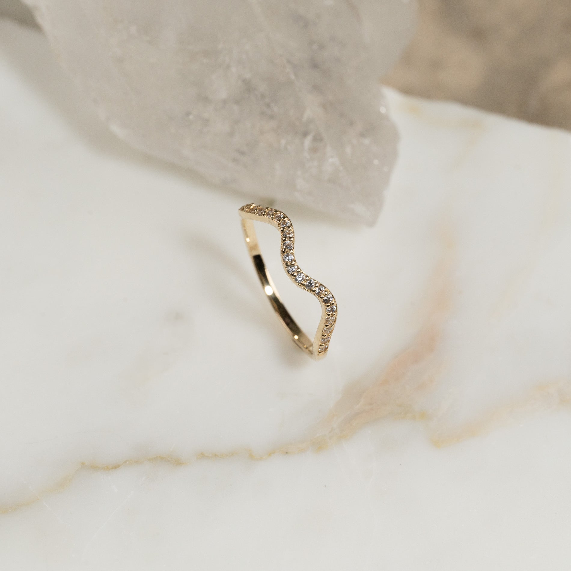 Bølgende ring i 100% resirkulert 9 kt. Gull med klare zirkoner.