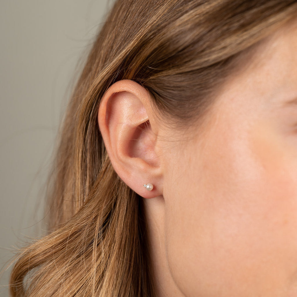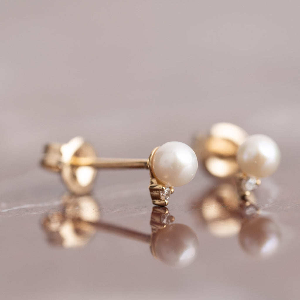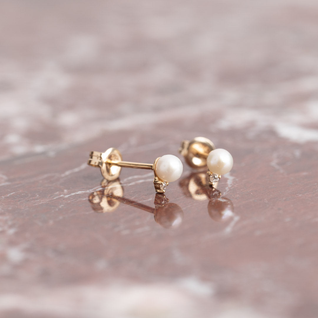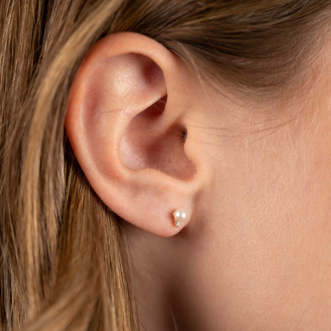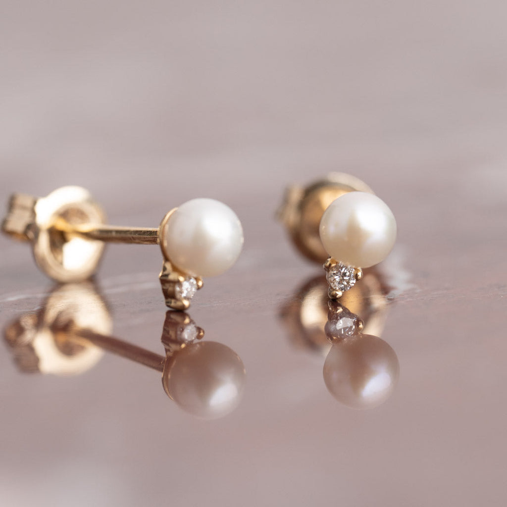 Våre øreringer Gina er laget av 100% resirkulert massivt gull med hvite ferskvannsperler og ekte diamanter. Øredobbene er designet med en liten rund, hvit ferskvannsperle på ca. 4mm, med en liten diamant nedenfor. Totalt er øreringene ca. 6x4mm store.