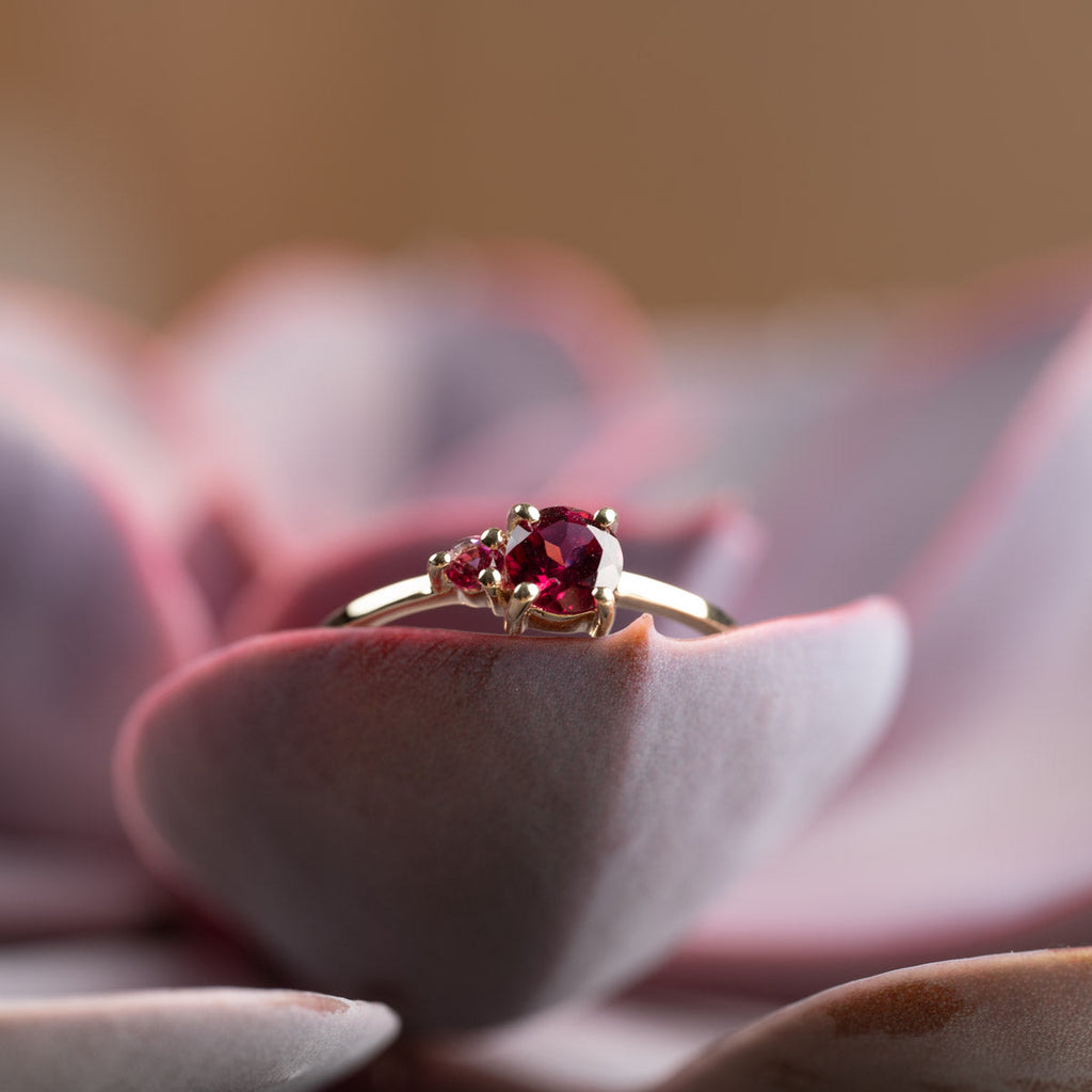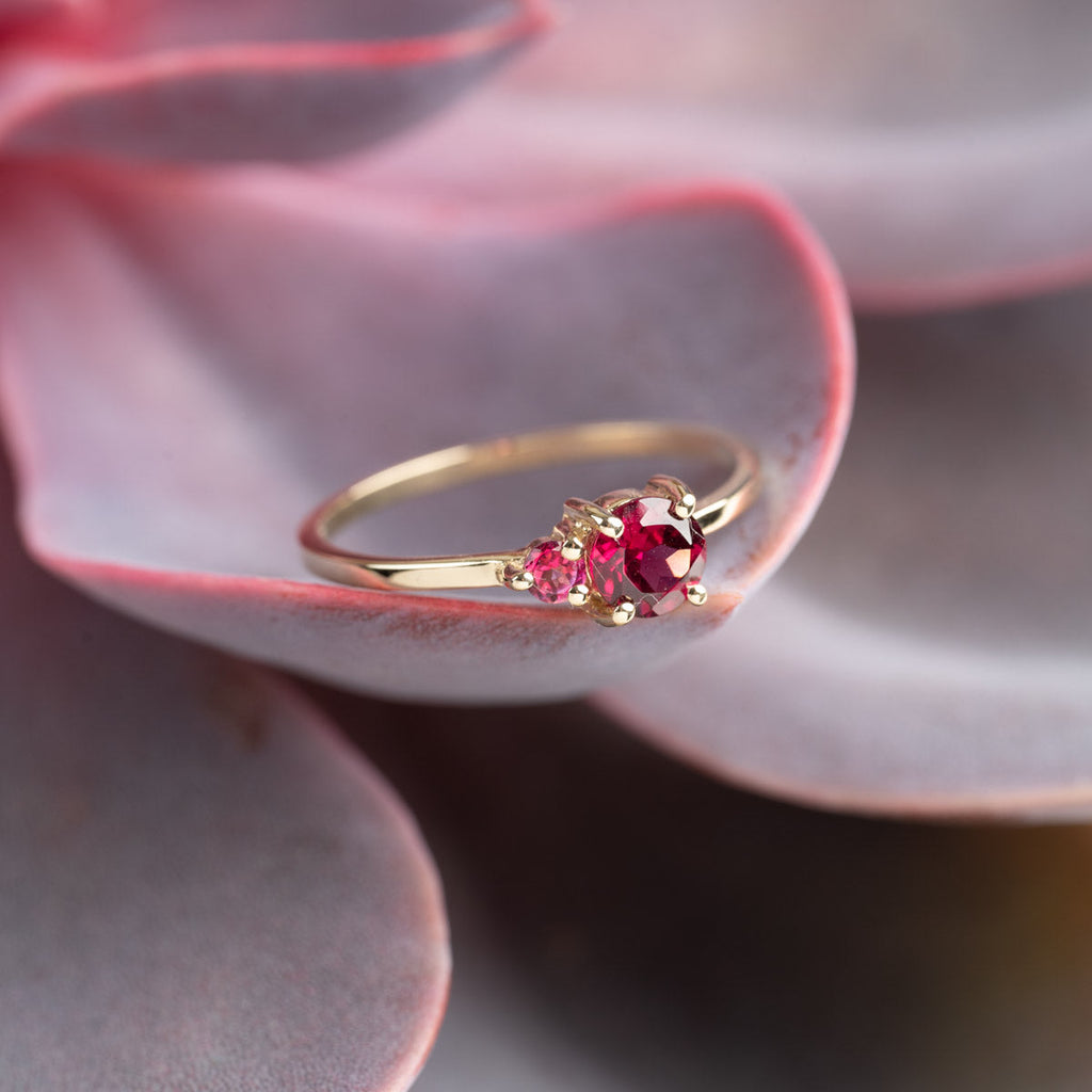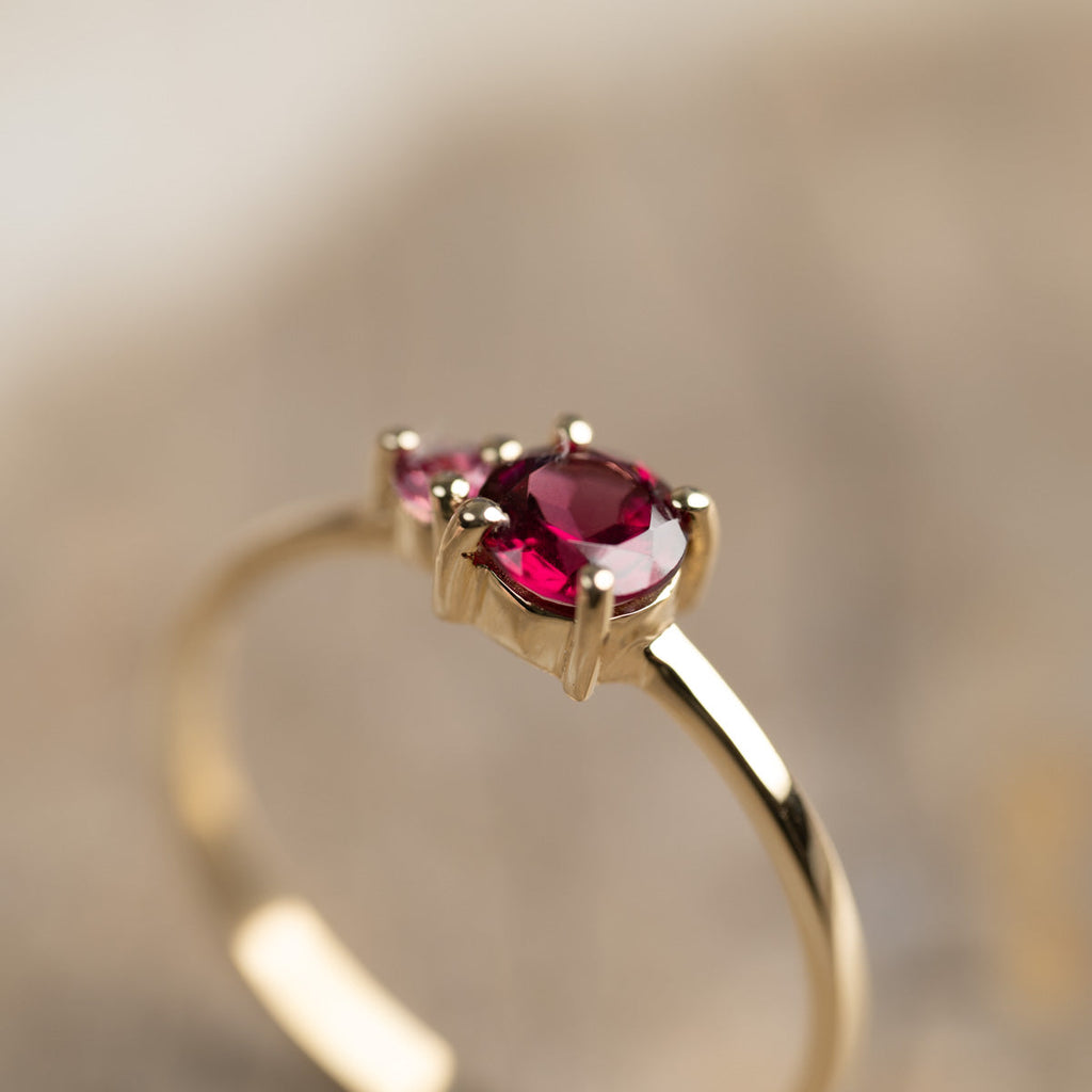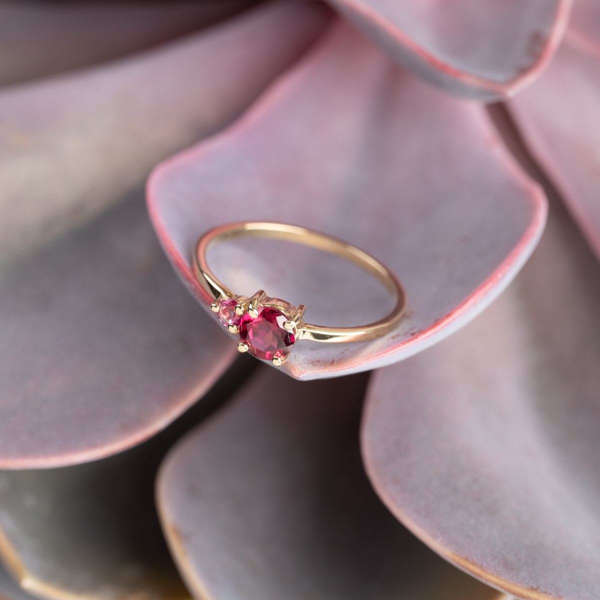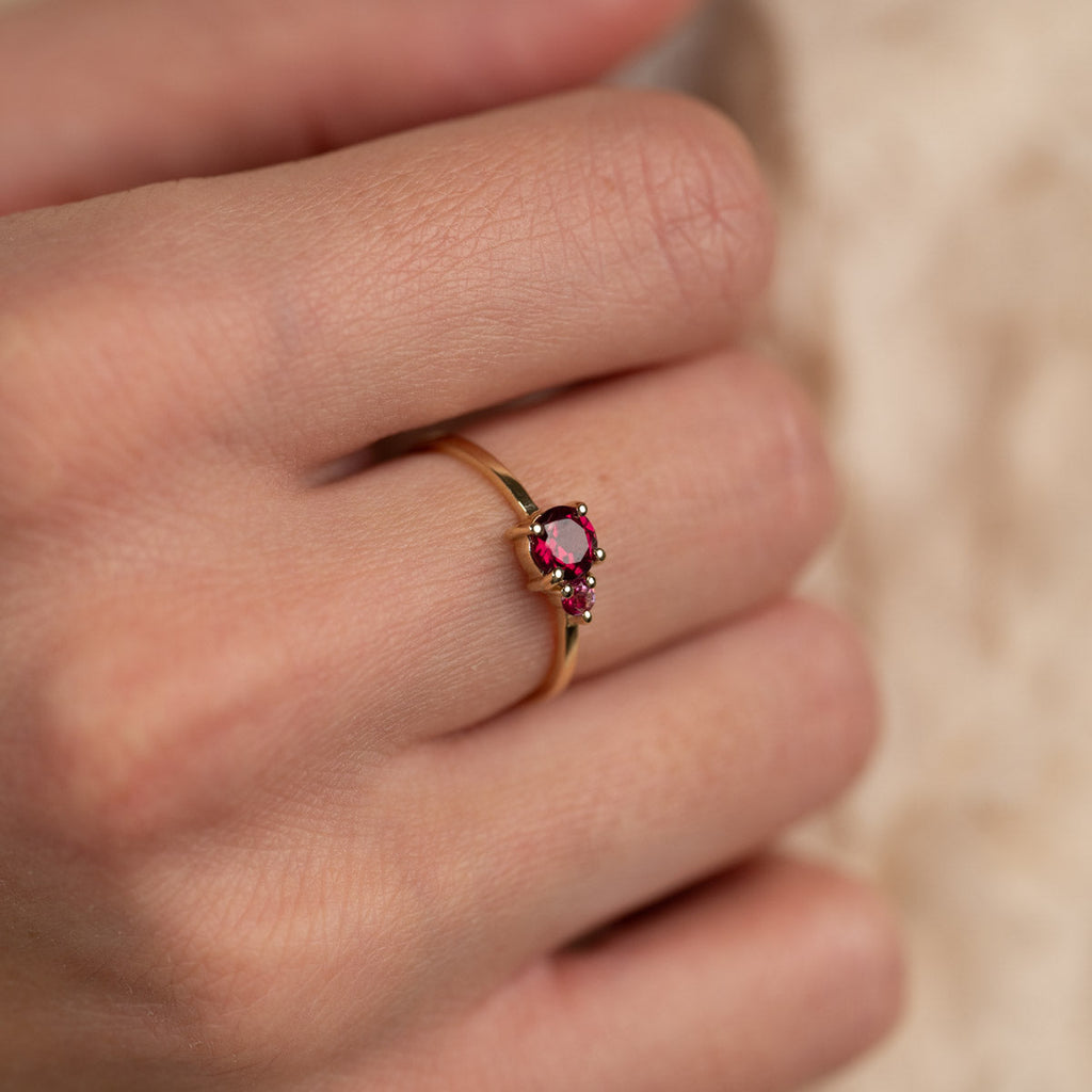 Ringen er laget i 100% resirkulert 9 karat massivt gull. Ringen er besatt med en bringebærfarget rhodolitt, og en rosa topas, som begge er nydelige edelstener.