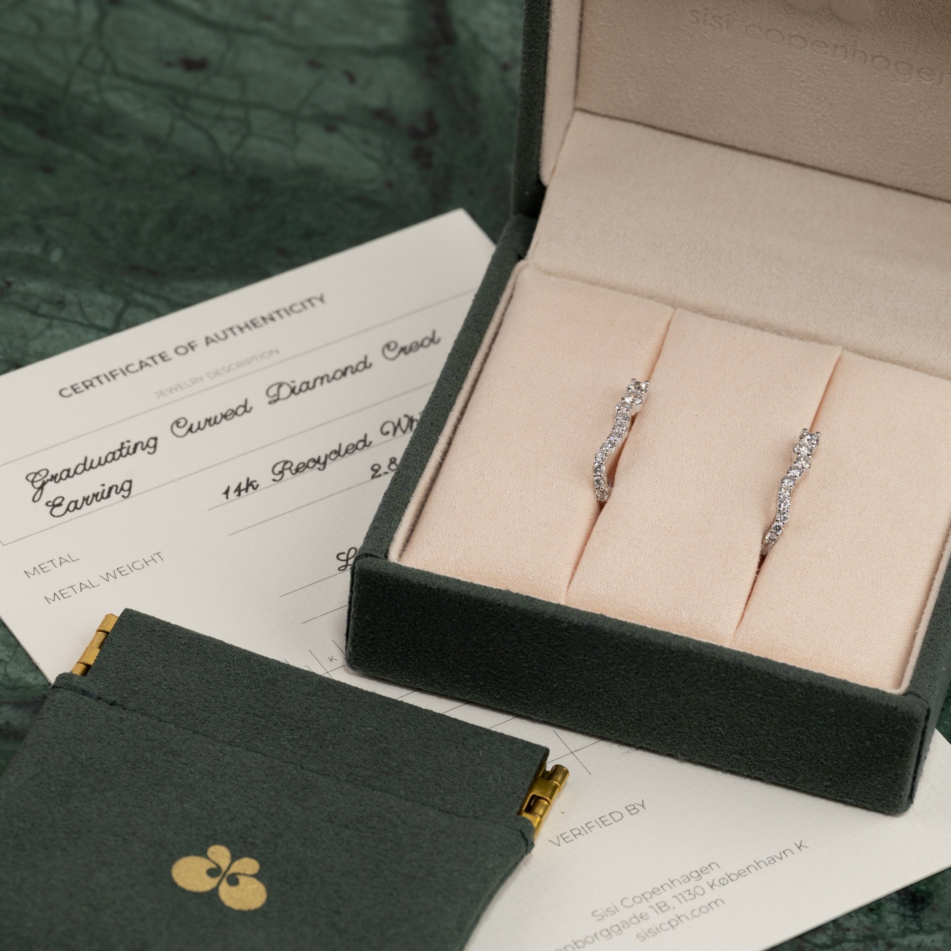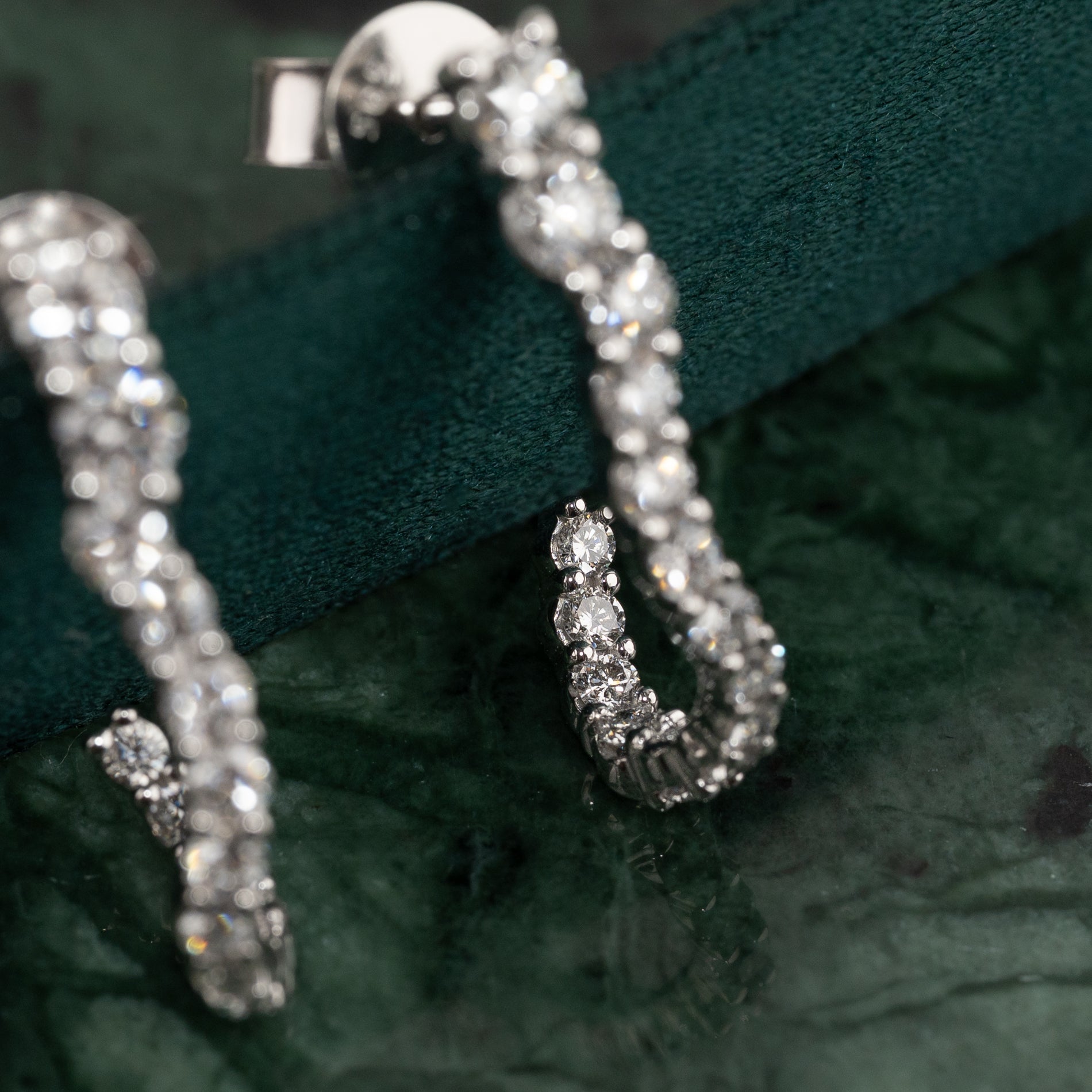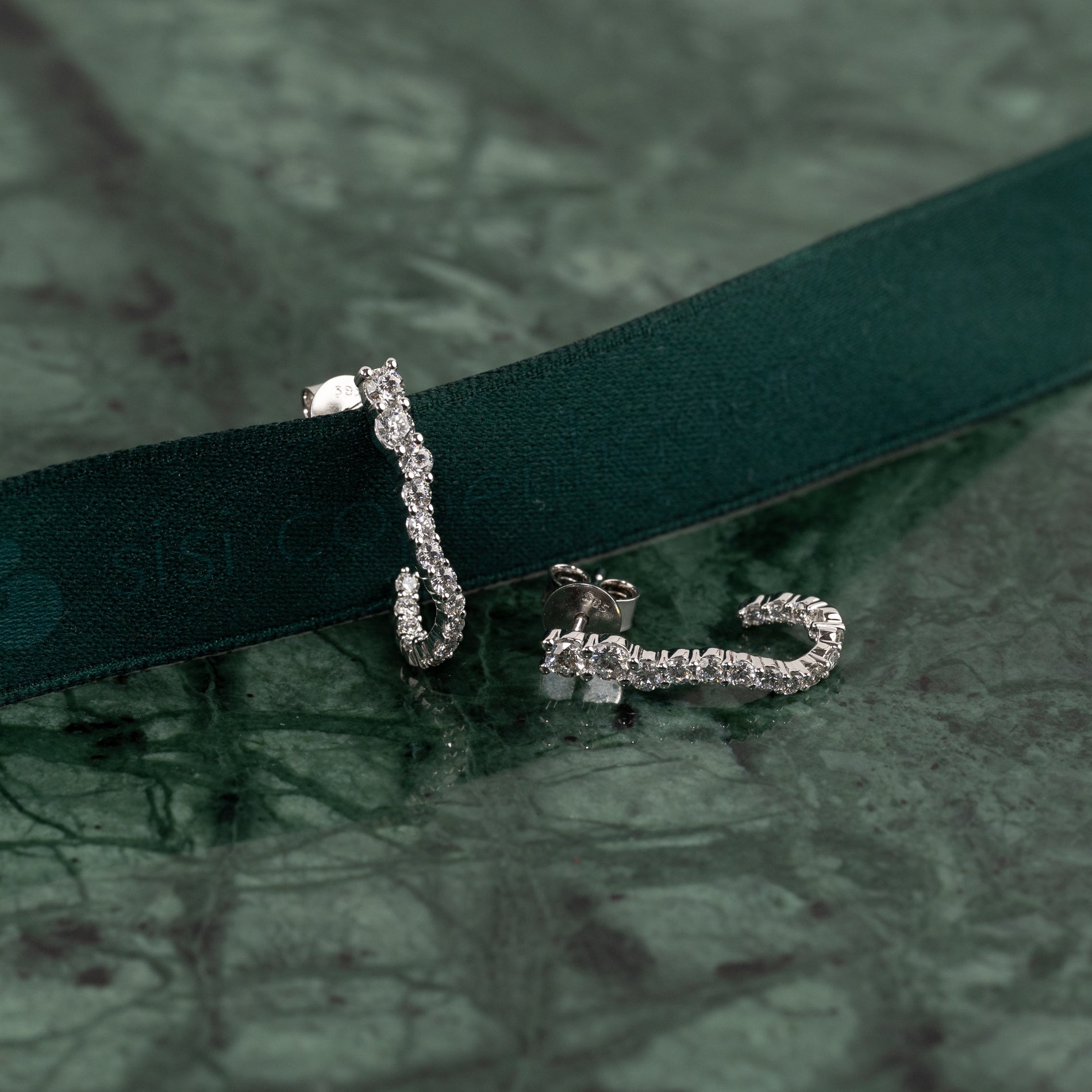 Øredobbene er laget i 14 karat massivt hvitt gull med lab-grown diamanter med en total caratvekt på 0,9 ct. De 30 diamantene har ulike størrelser som følger creolens organiske, buede form på en vakker måte.
