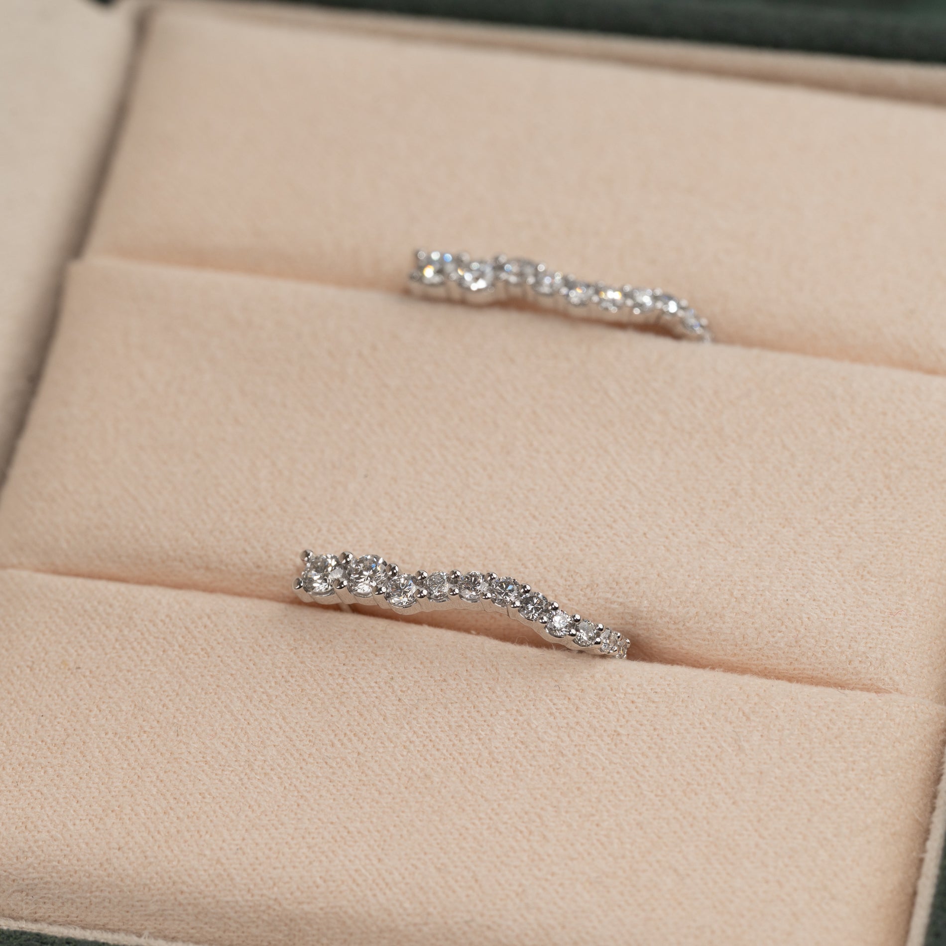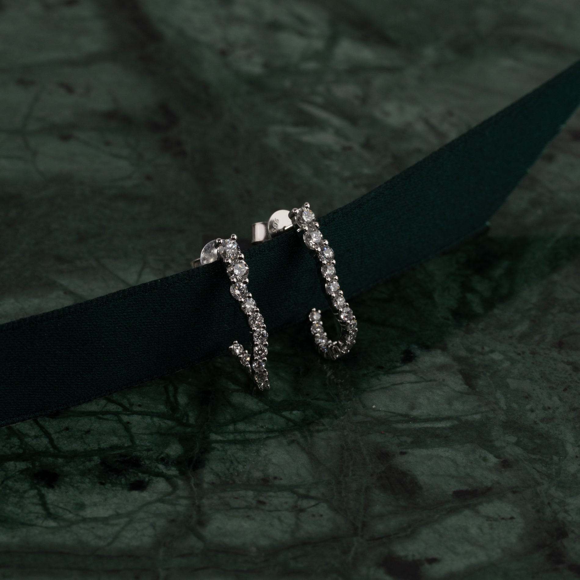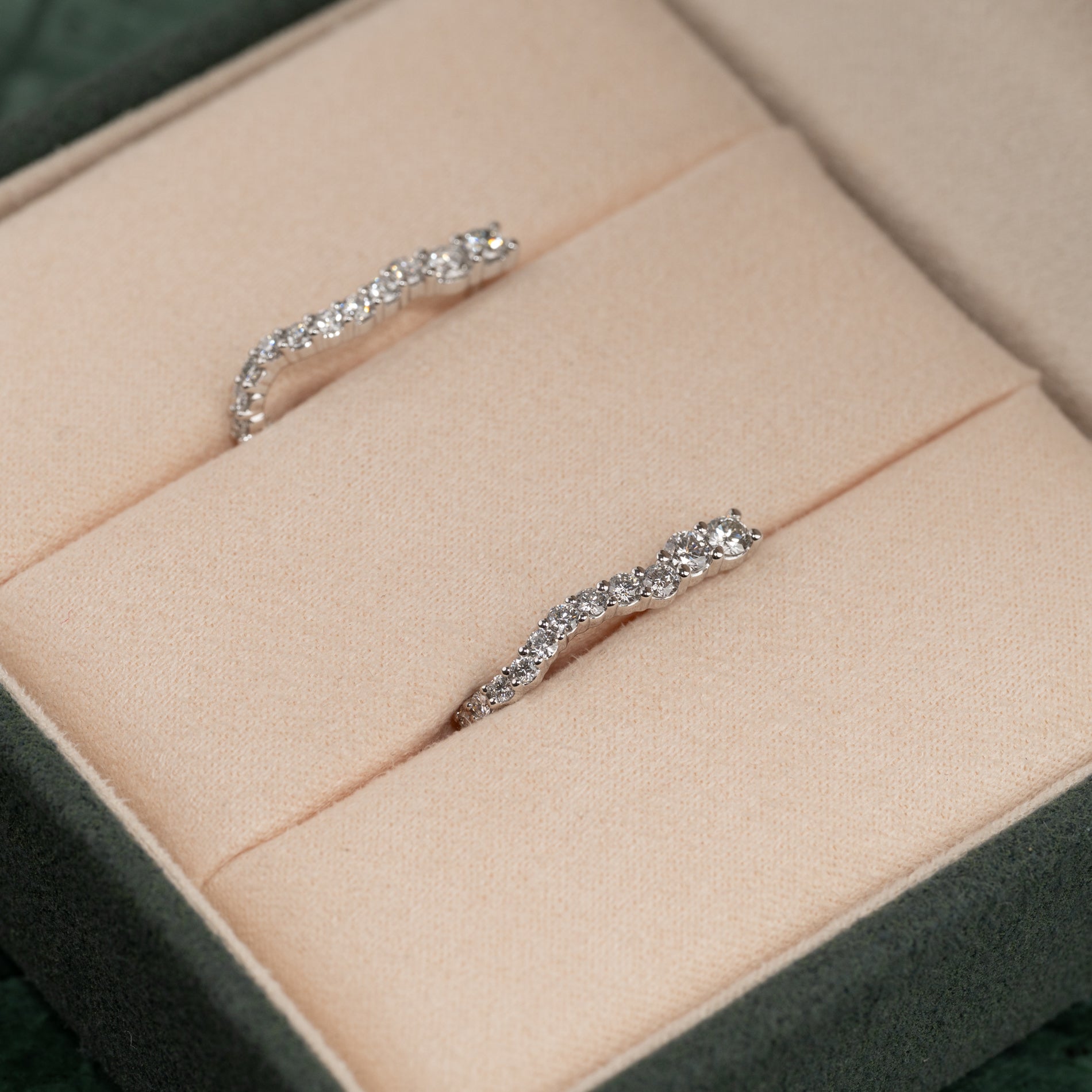 Øredobbene er laget i 14 karat massivt hvitt gull med lab-grown diamanter med en total caratvekt på 0,9 ct. De 30 diamantene har ulike størrelser som følger creolens organiske, buede form på en vakker måte.