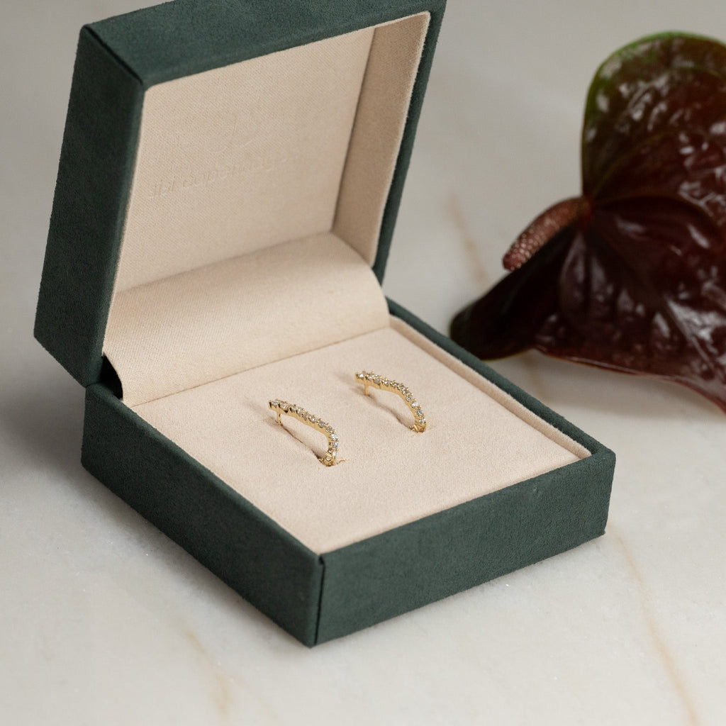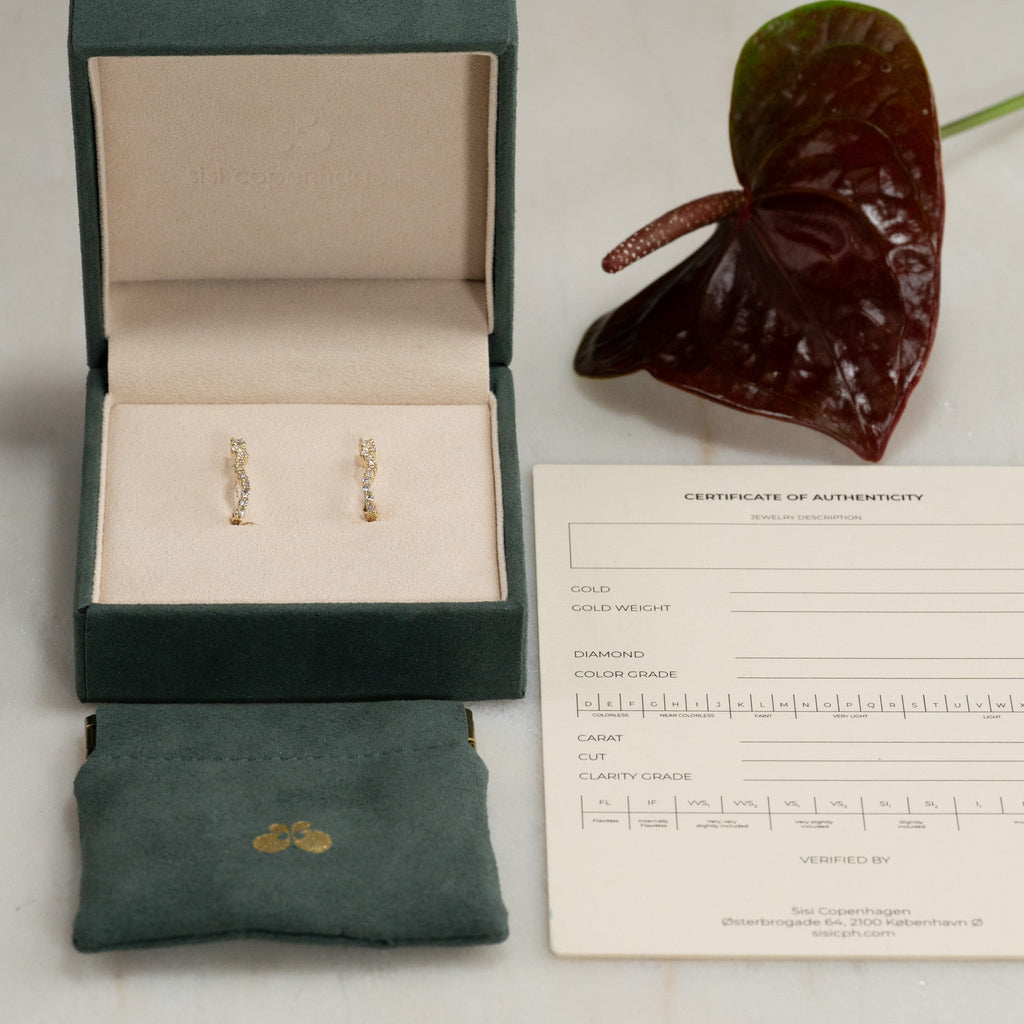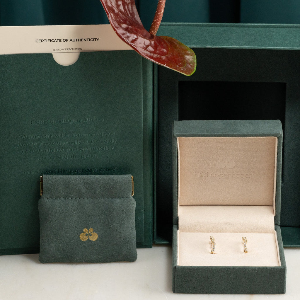 Øreringene er laget av massivt 14 karat gull og besatt med laboratoriedyrkede diamanter med en total vekt på 0,9 ct. De 30 diamantene varierer i størrelse og følger creolens buede form. Diamantene har fargen E/F (River) og klarheten VVS. Hver detalj er skapt med omtanke – diamantene er produsert ved hjelp av solenergi, og gullet er 100 % sertifisert resirkulert.