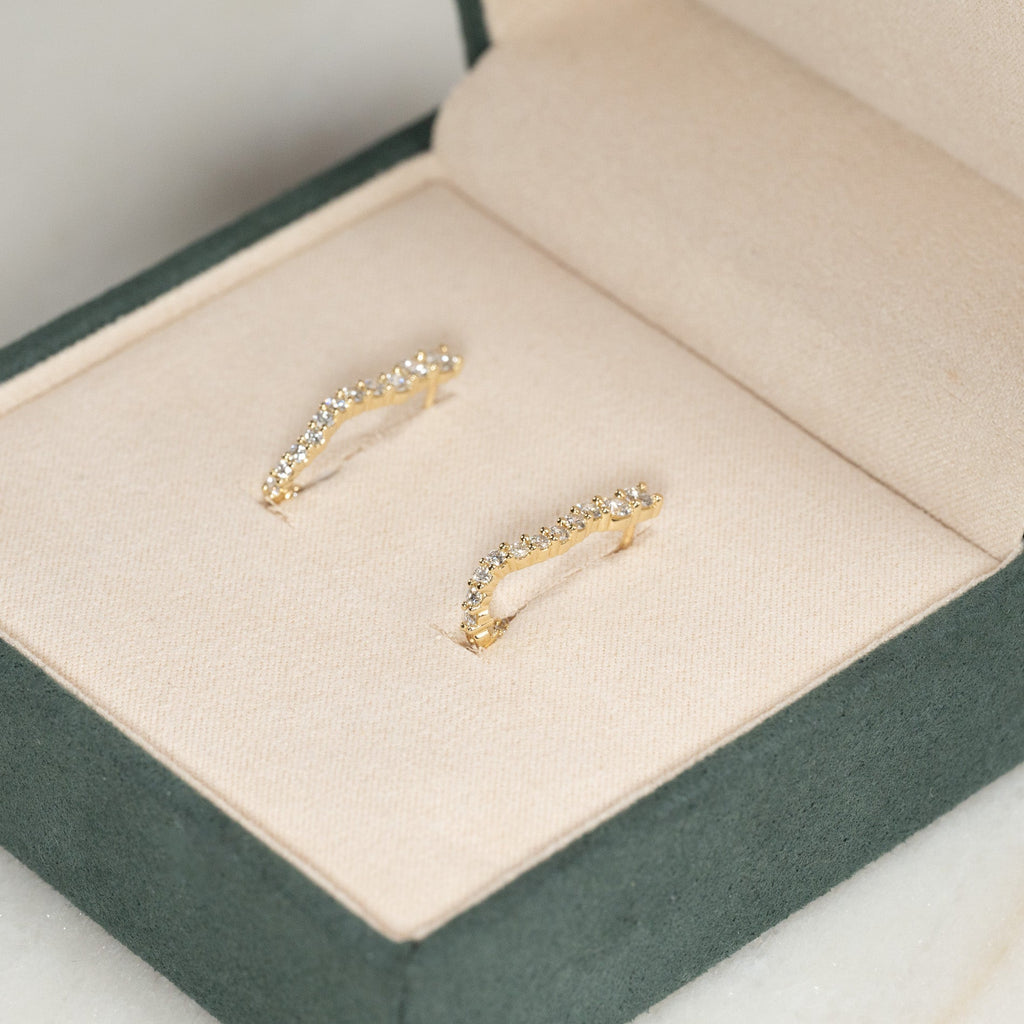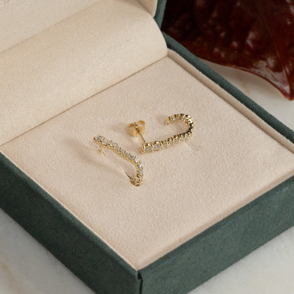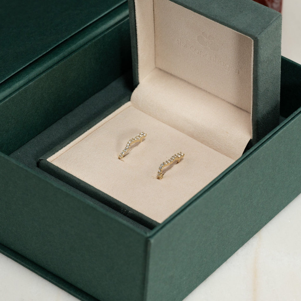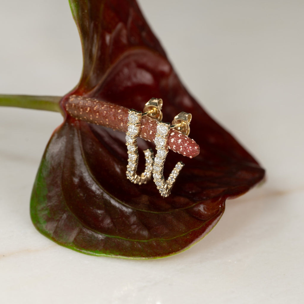 Øreringene er laget av massivt 14 karat gull og besatt med laboratoriedyrkede diamanter med en total vekt på 0,9 ct. De 30 diamantene varierer i størrelse og følger creolens buede form. Diamantene har fargen E/F (River) og klarheten VVS. Hver detalj er skapt med omtanke – diamantene er produsert ved hjelp av solenergi, og gullet er 100 % sertifisert resirkulert.