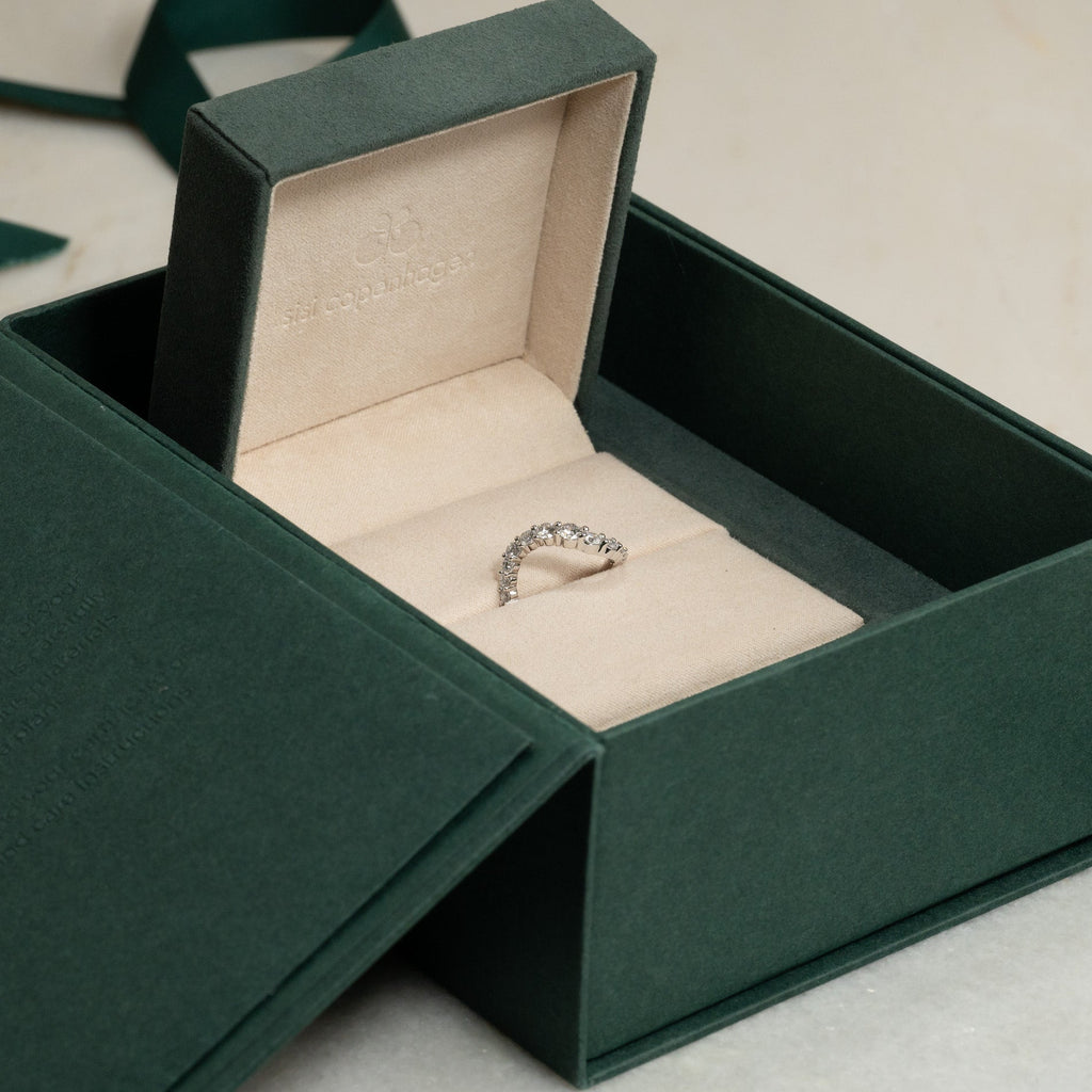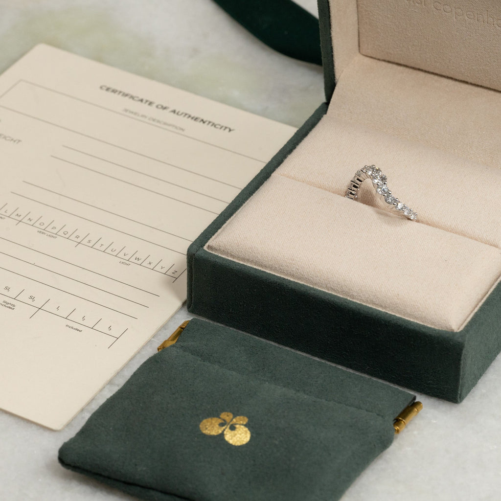 Når du mottar smykket, vil det være i vår gaveeske, bundet med et vakkert matchende silkebånd, klar til å gis som gave. Inne i esken finner du en smykkeboks, en pose og et ekthetsbevis.