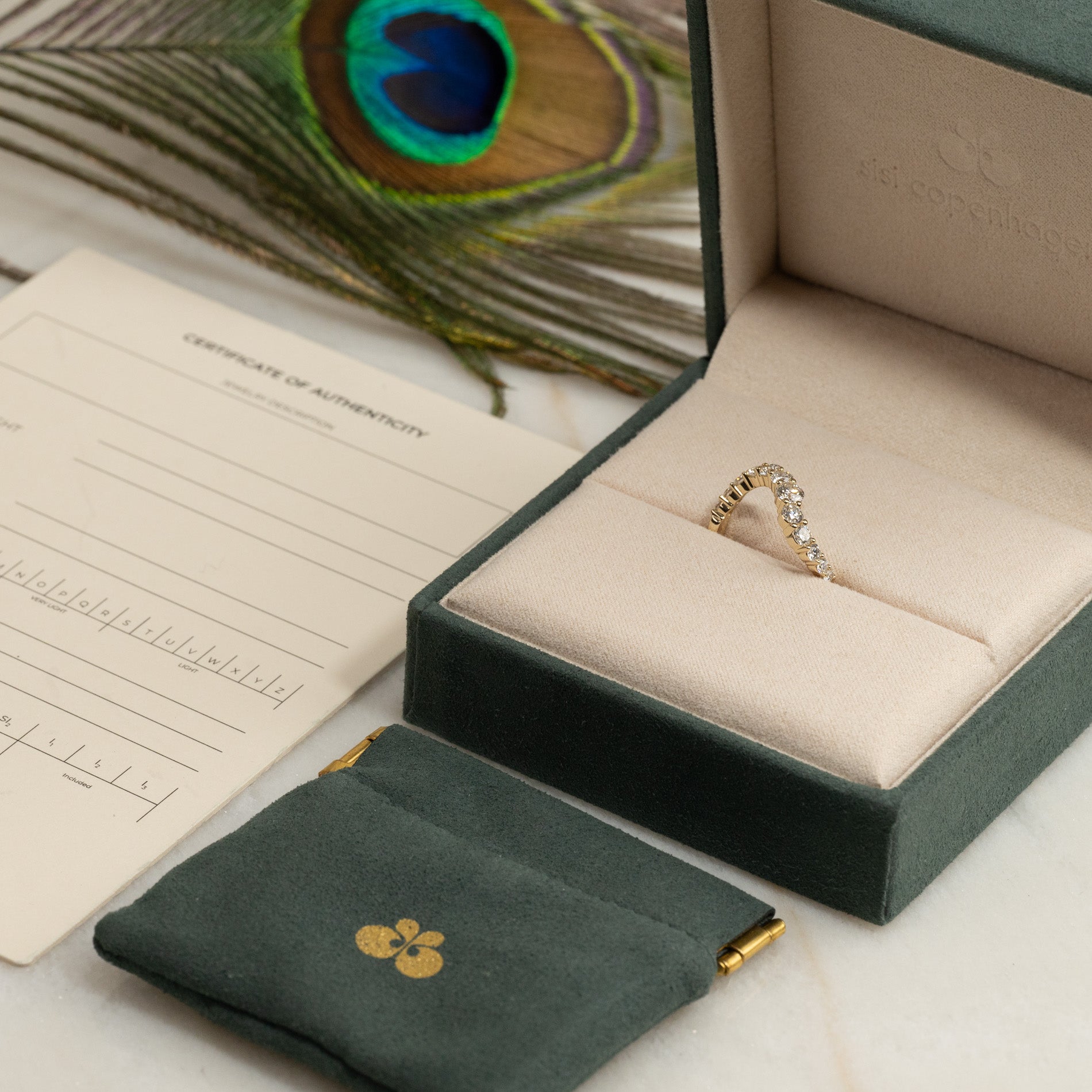 Når du mottar smykket, vil det være i vår gaveeske, bundet med et vakkert matchende silkebånd, klar til å gis som gave. Inne i esken finner du en smykkeboks, en pose og et ekthetsbevis.
