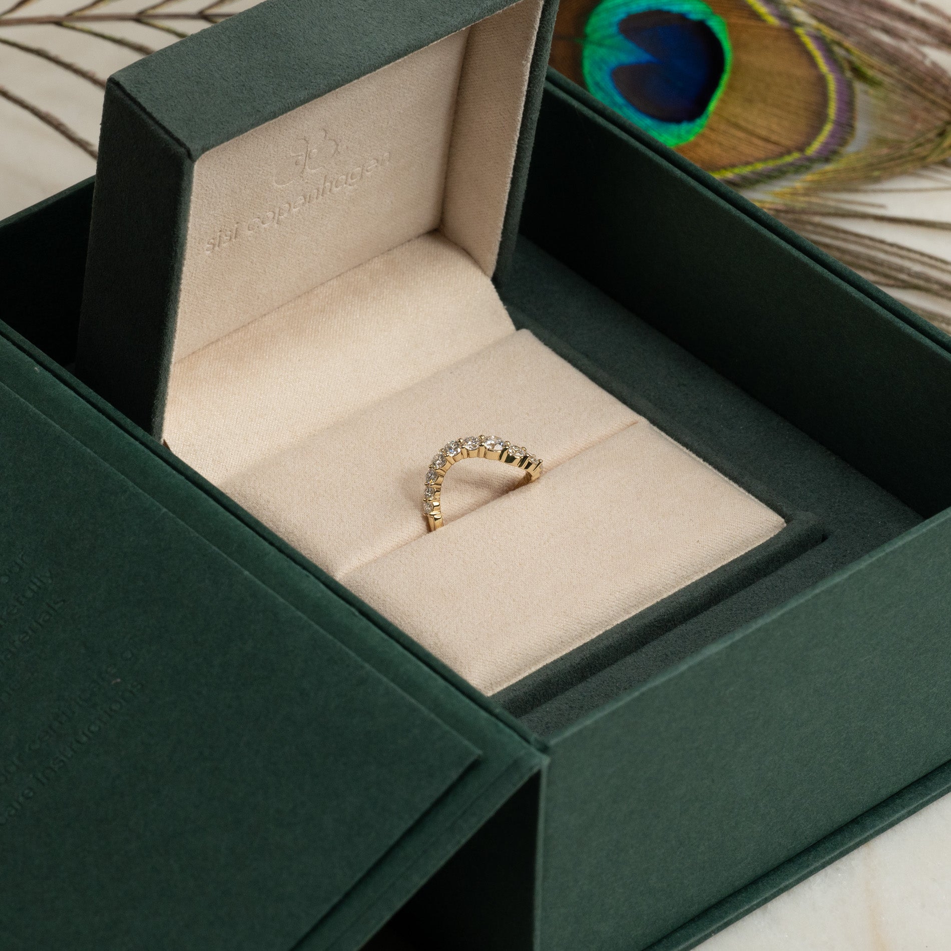 Smykket er pent og sikkert plassert i en smykkeboks som er trukket med vegansk semsket skinn.