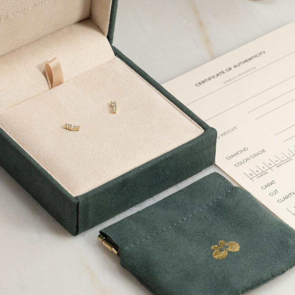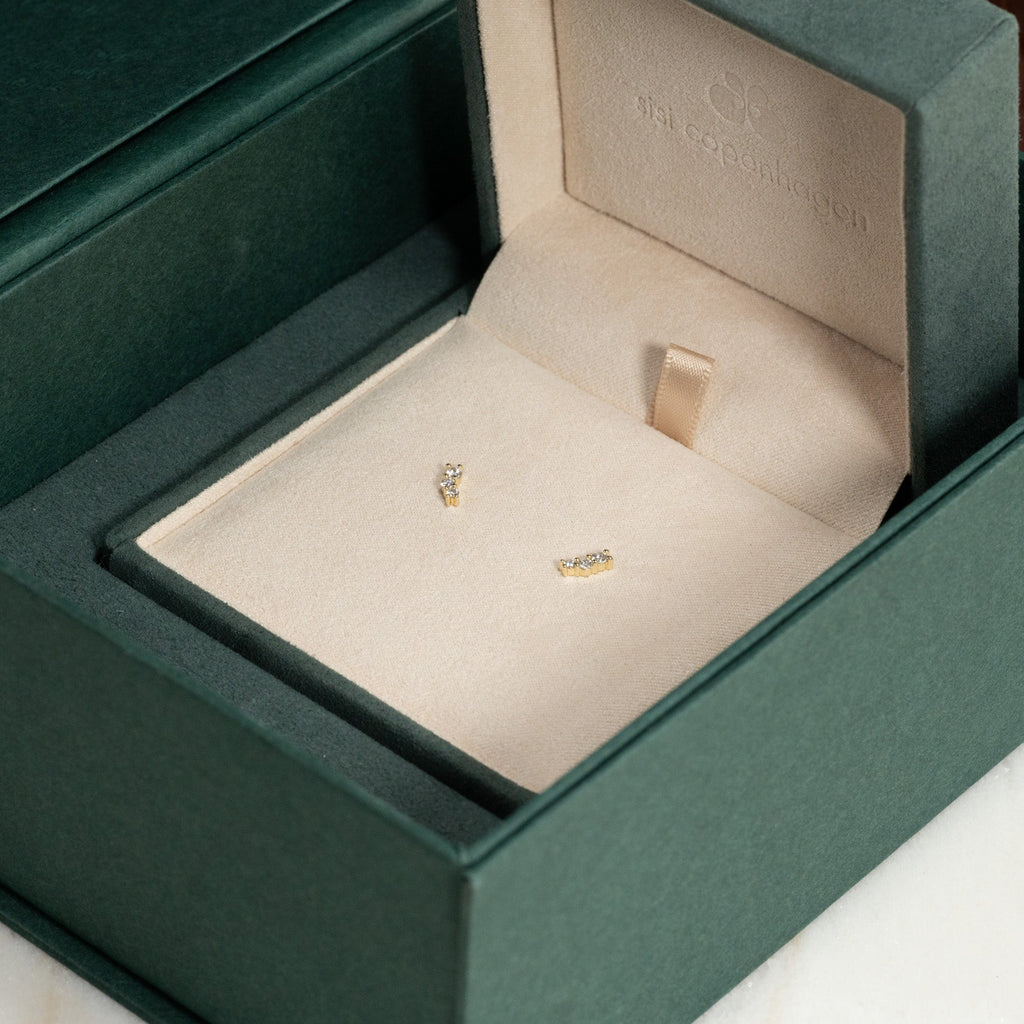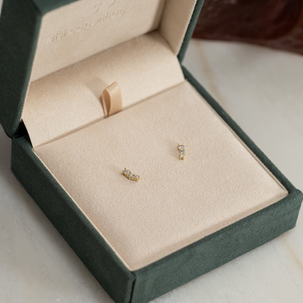 Øredobbene er laget i massivt 14 karat gull og lab-grown diamanter med en total vekt på 0,22 ct. De brillantslipte diamantene er plassert i en elegant formasjon som gir et lett uttrykk. Diamantene har fargen E/F (River) og klarheten VVS. Øredobbene er skapt med omtanke, diamantene er produsert ved hjelp av grønn energi fra sol og vind, og gullet er 100 % sertifisert resirkulert.
