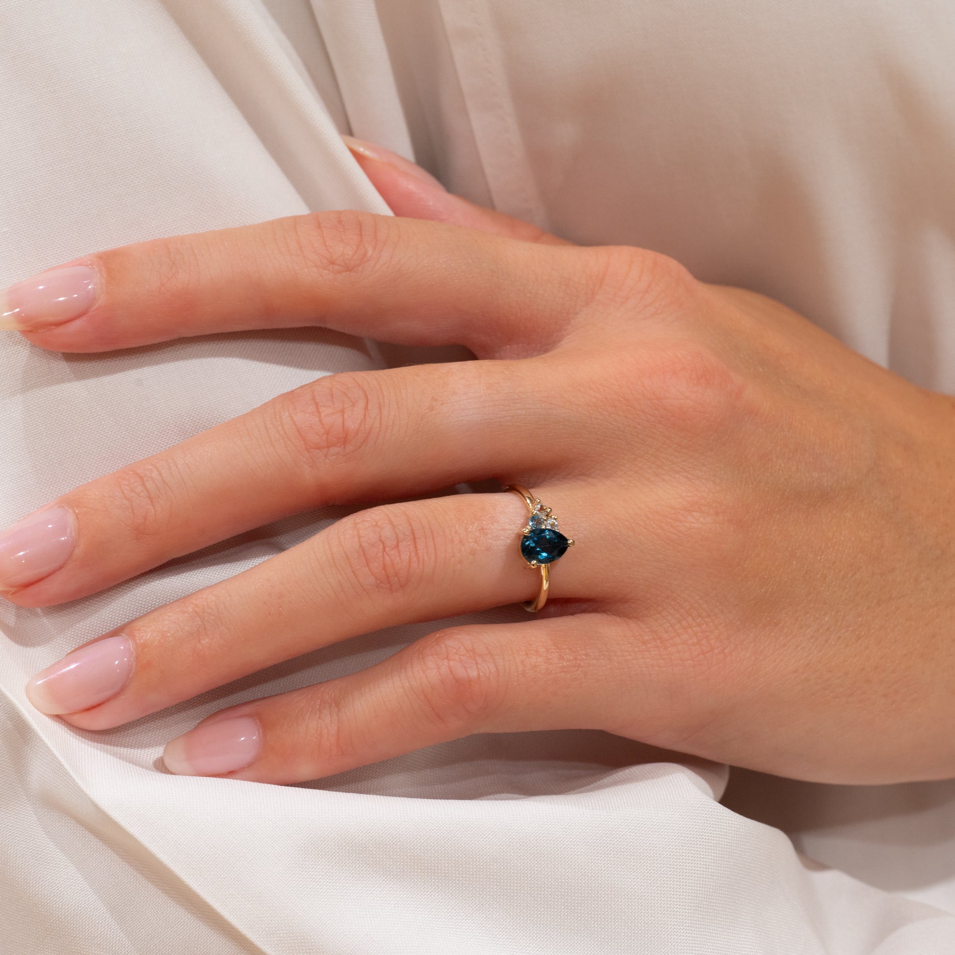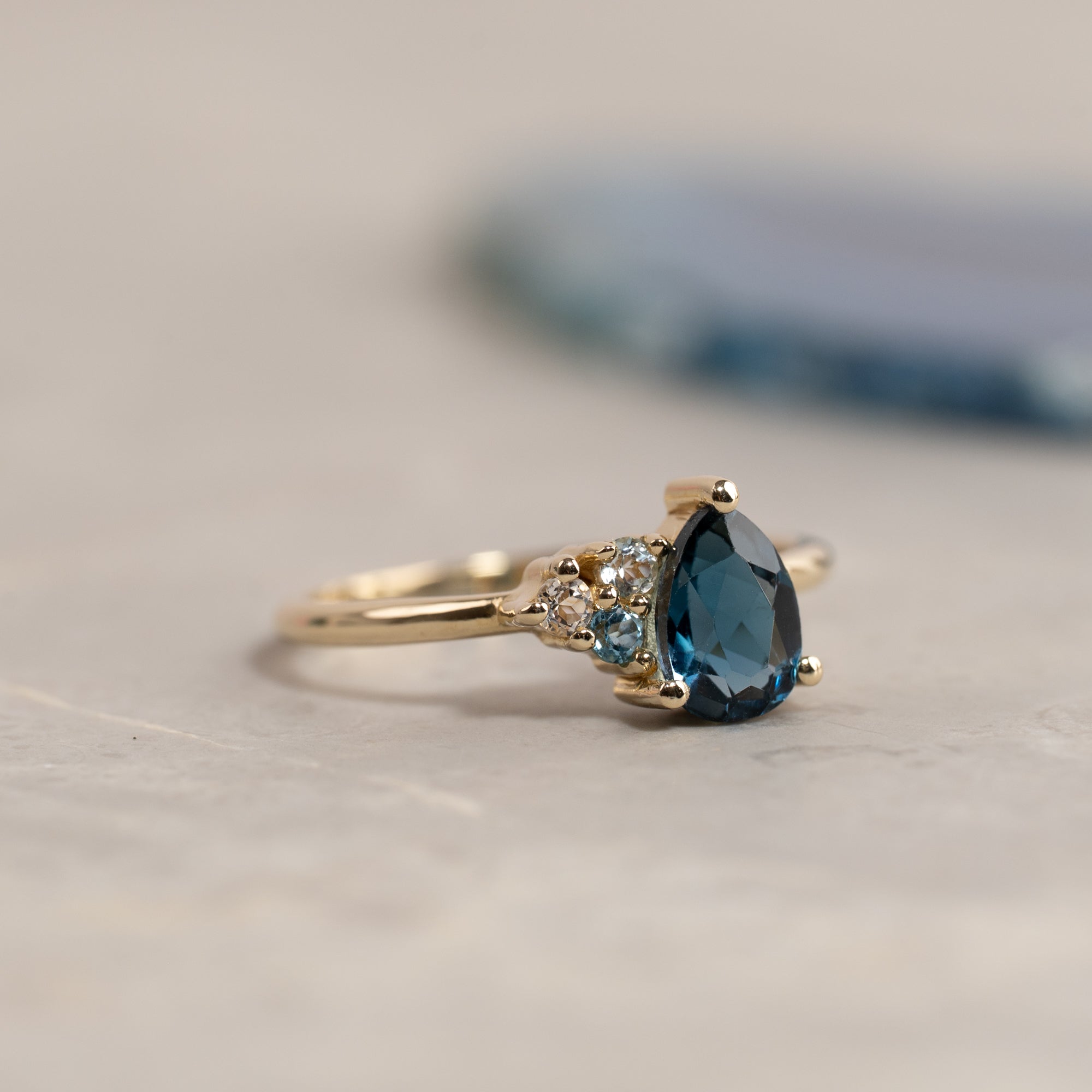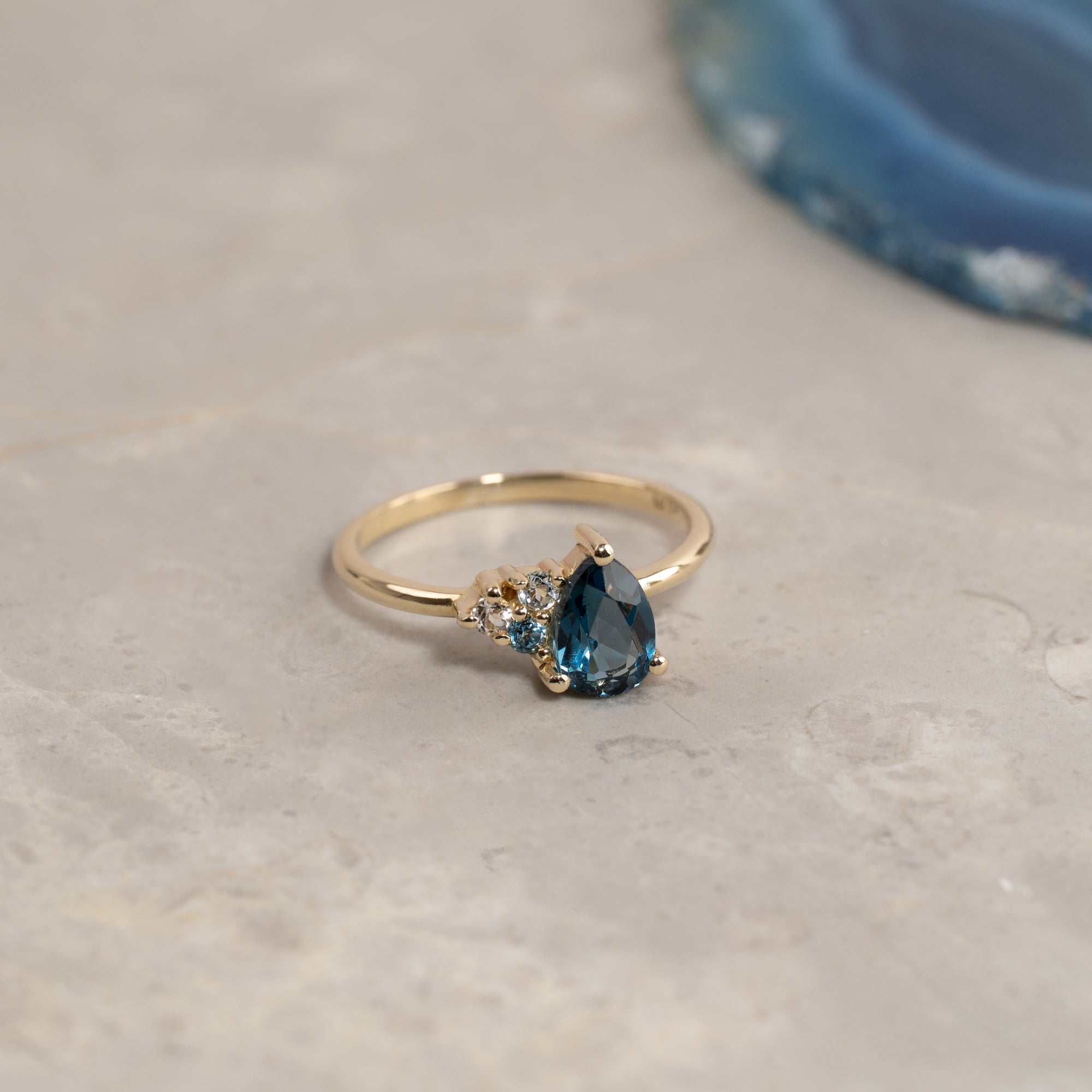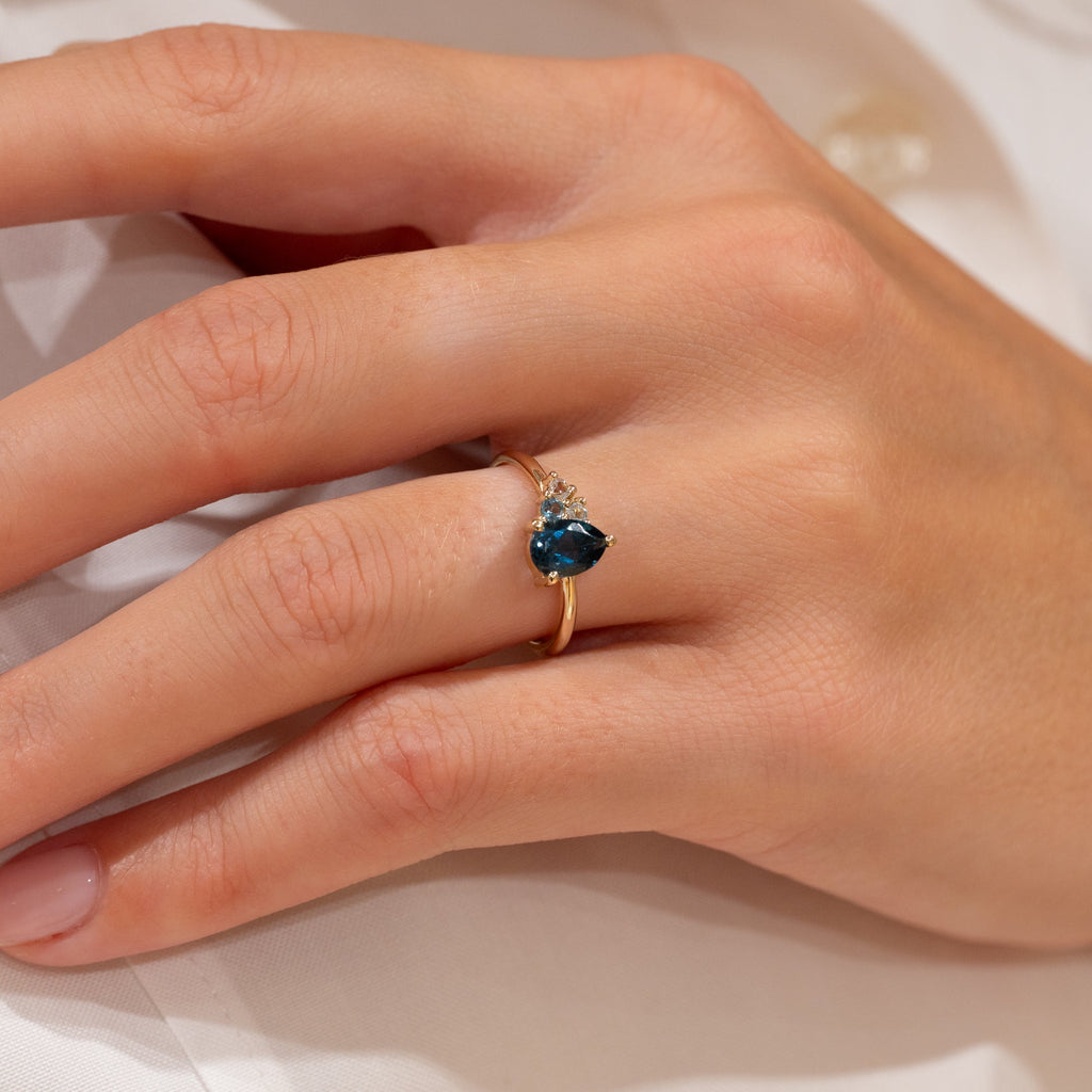 Den mørkeblå topasen er dråpeformet og sitter tett sammen med de tre andre stenene, noe som gir ringen et utrolig vakkert og unikt uttrykk. Den elegante ringen passer like godt til både hverdag og fest, og kan bæres alene eller kombineres med flere ringer.