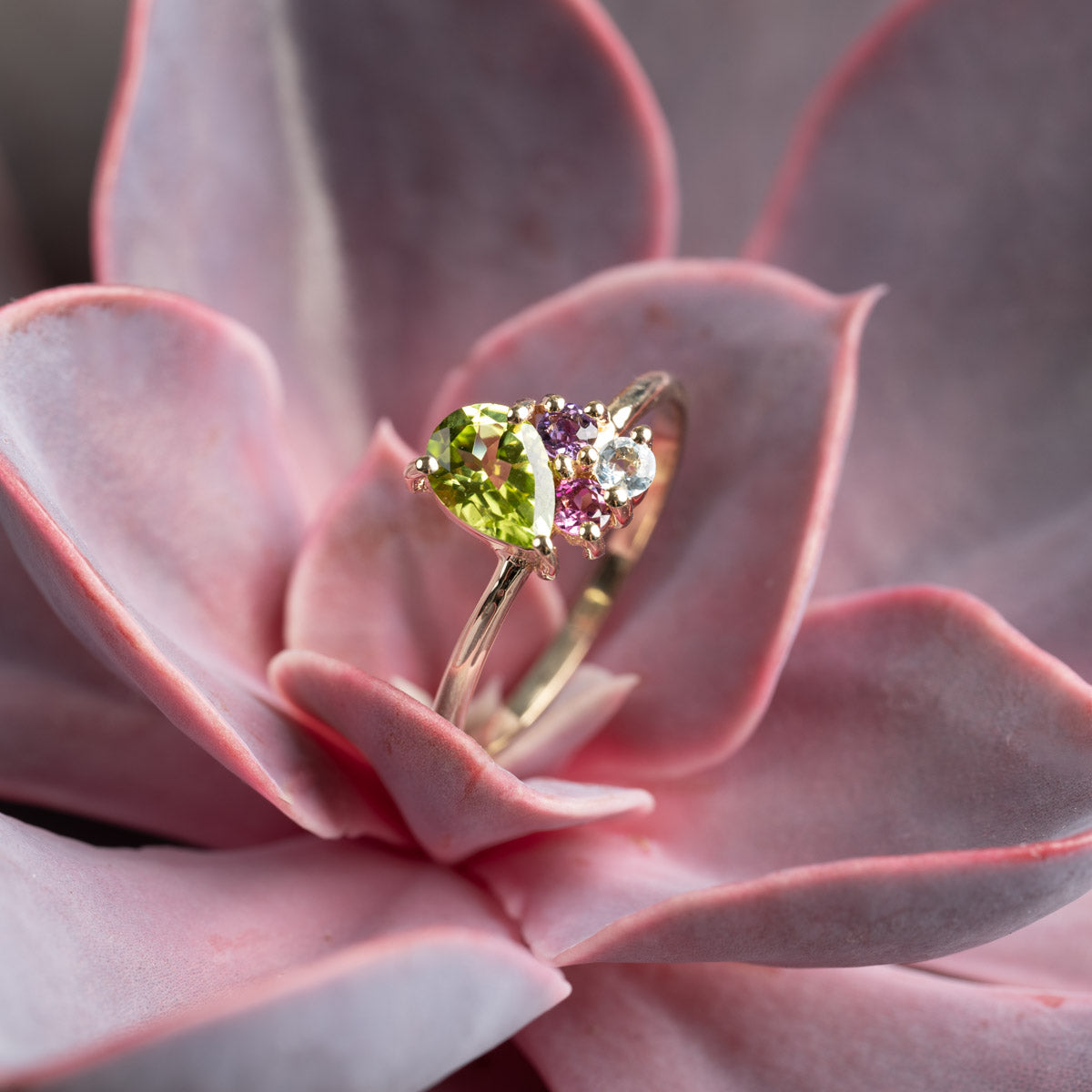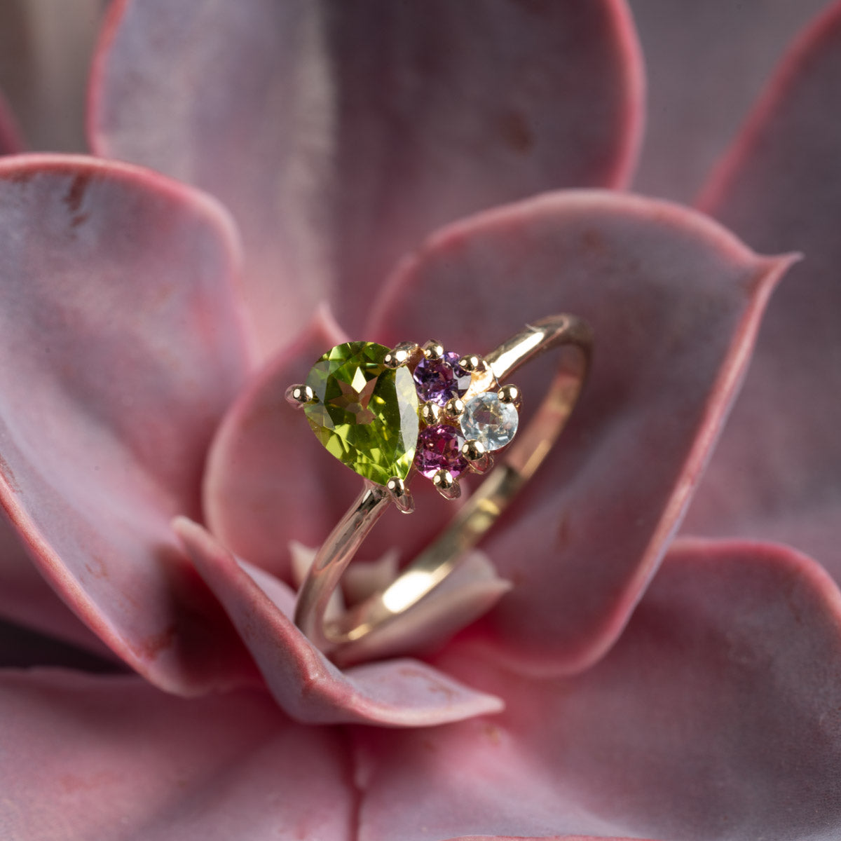 Ring laget i 100% resirkulert 9 karat massivt gull, med fire ulike edelsten. Selve ringen består av en nydelig lysegrønn peridot, en blå og en rosa topas, samt en flott mørkelilla ametyst.