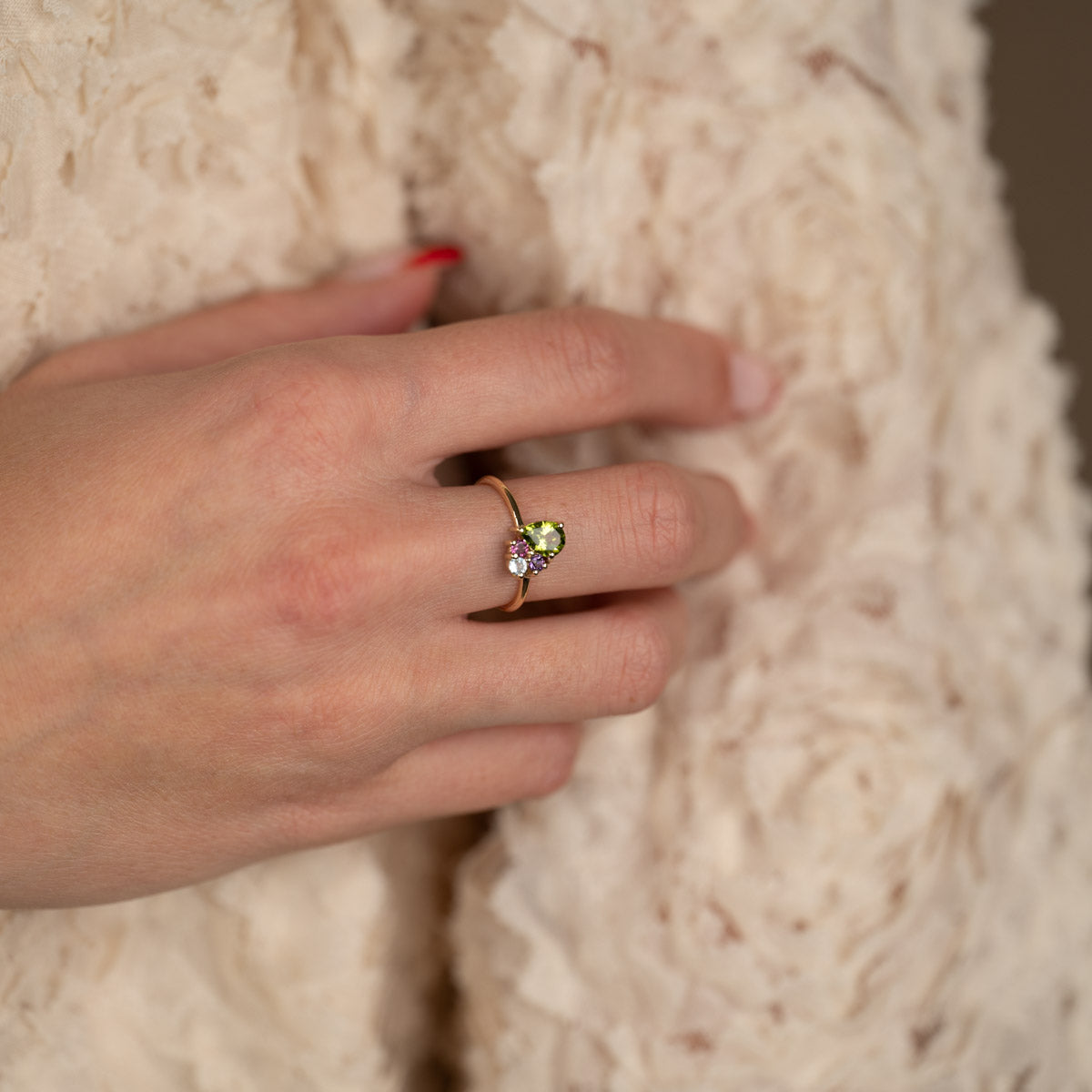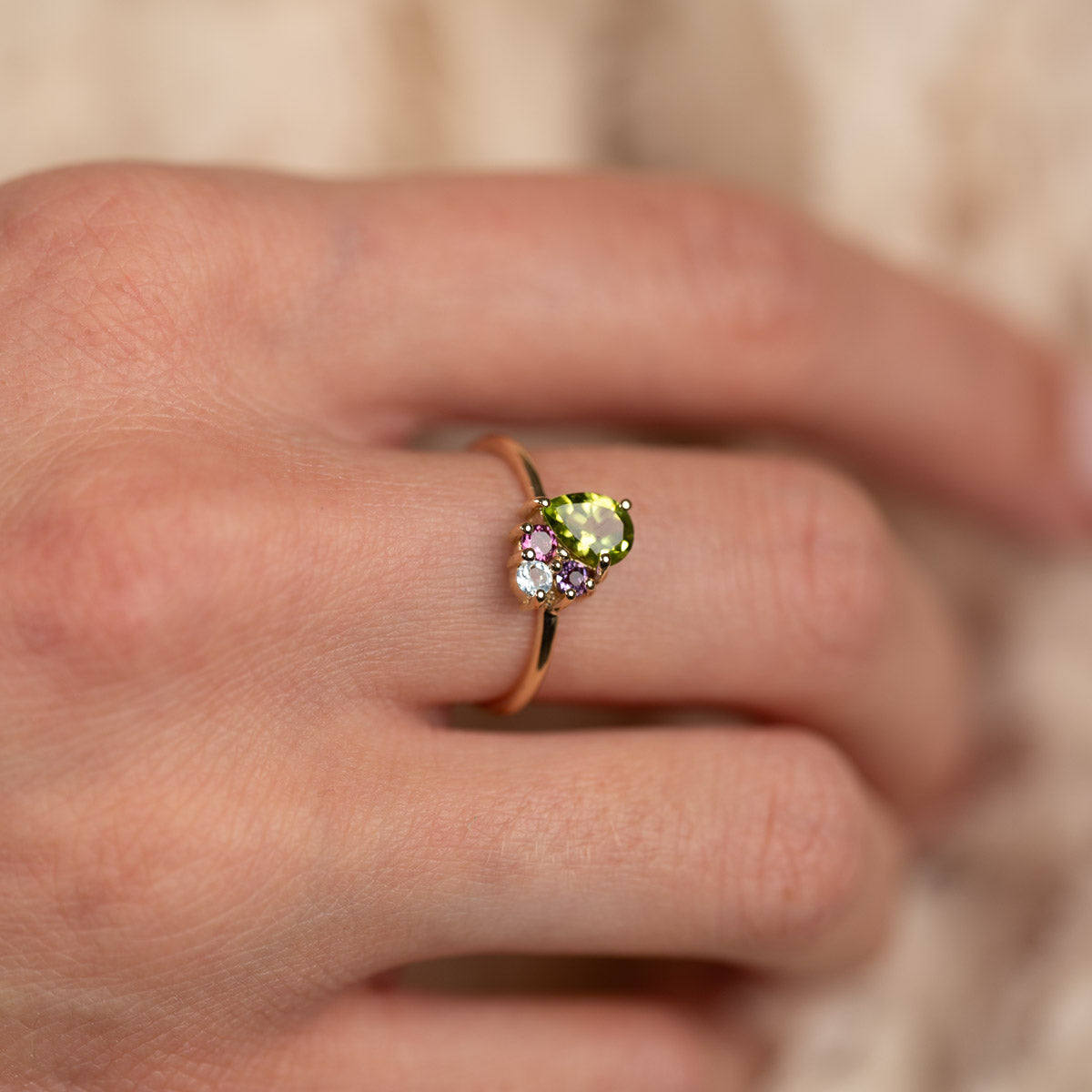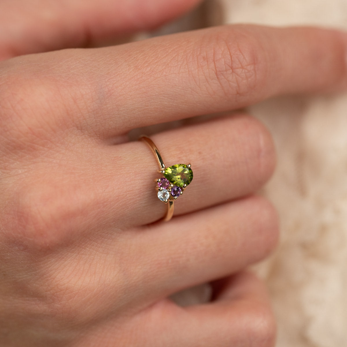 Den grønne peridoten er dråpeformet og sitter tett inntil de tre andre stenene. Den flotte ringen er en tidløs klassiker som passer godt både til hverdag og fest, og kan fint kombineres med andre ringer eller bæres alene.