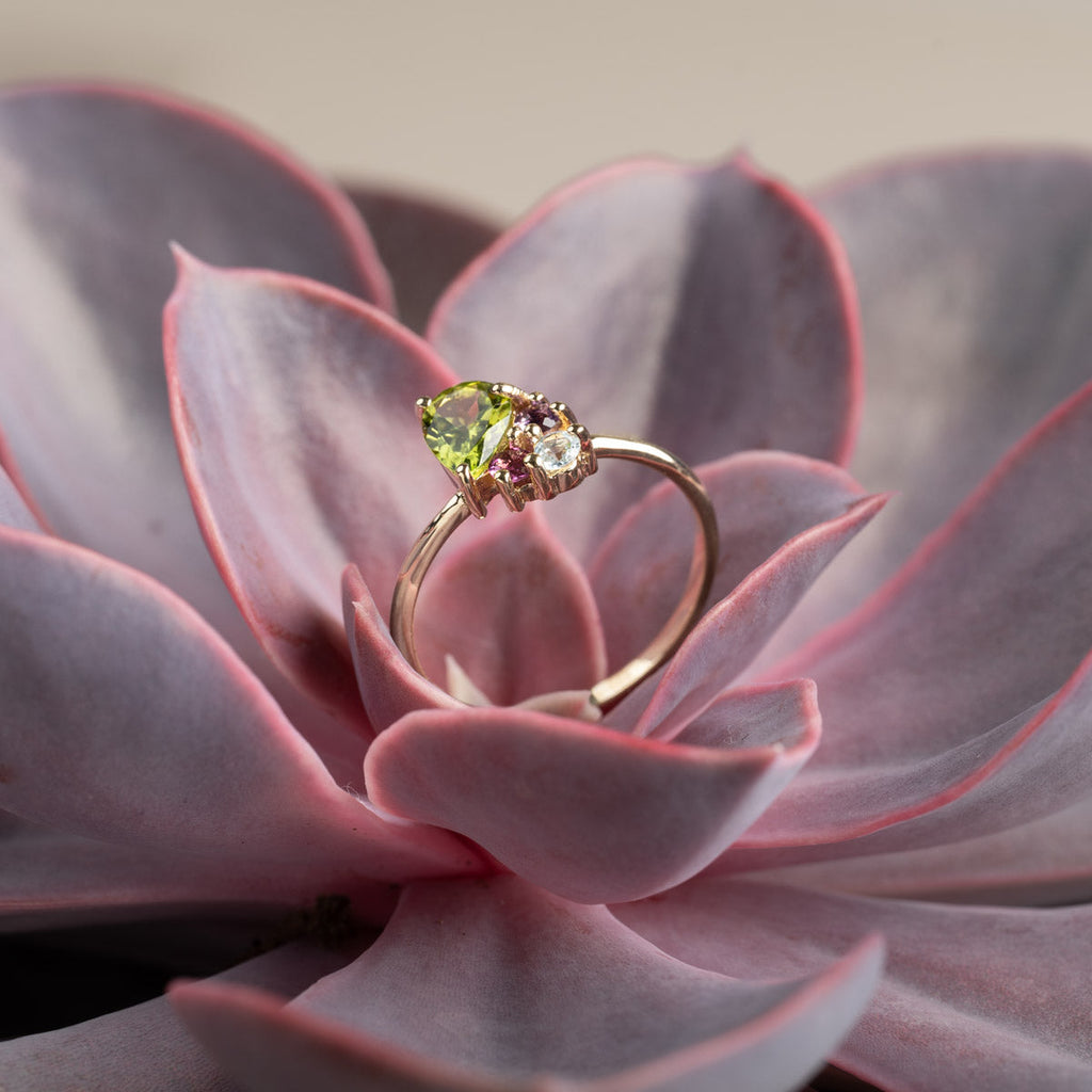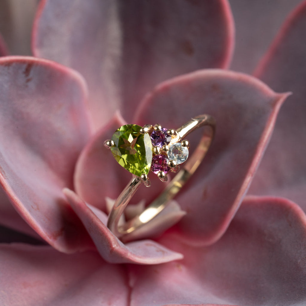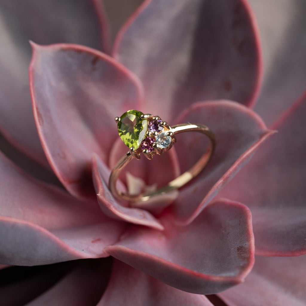 Den grønne peridoten er dråpeformet og sitter tett inntil de tre andre stenene. Den flotte ringen er en tidløs klassiker som passer godt både til hverdag og fest, og kan fint kombineres med andre ringer eller bæres alene.