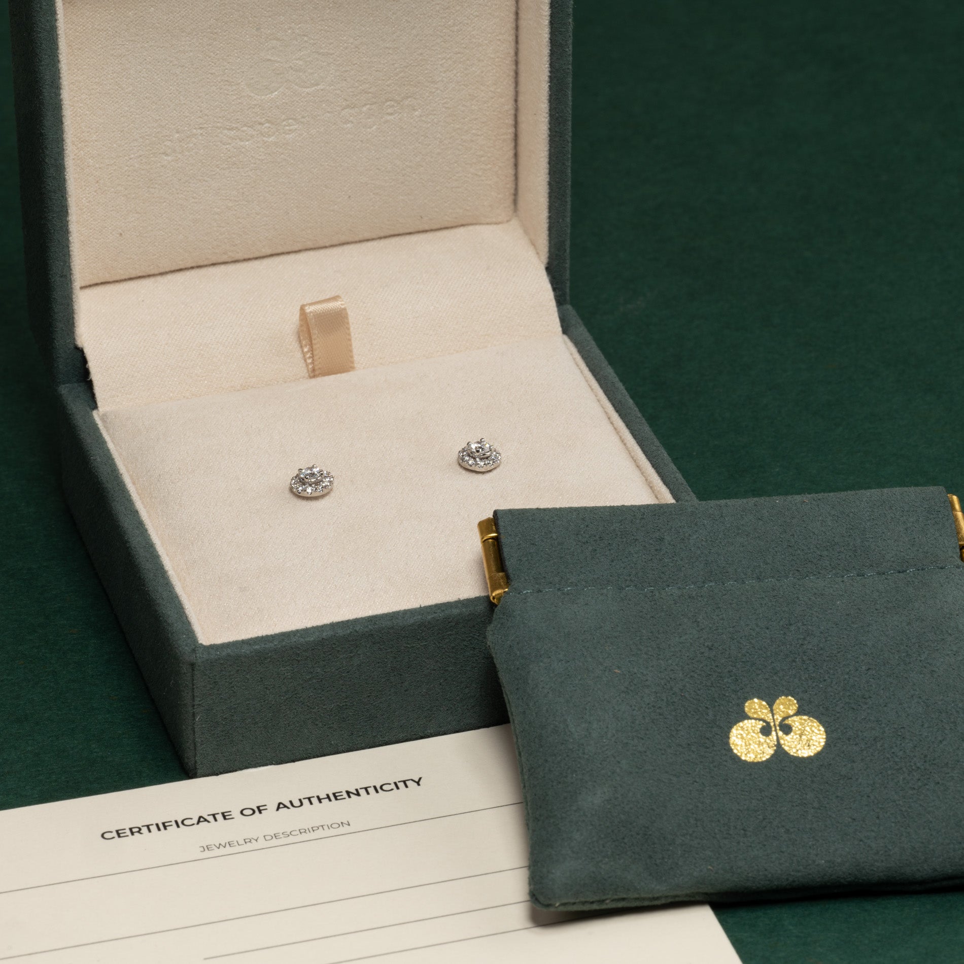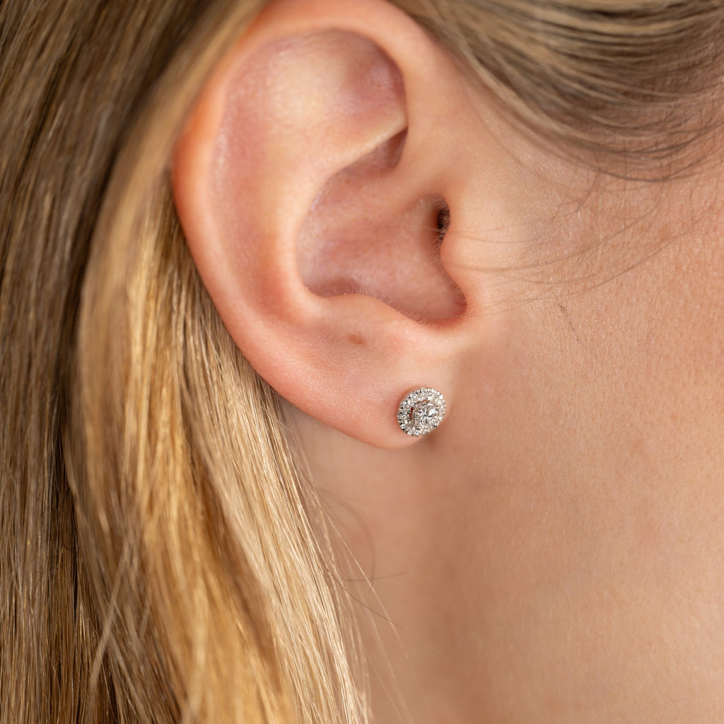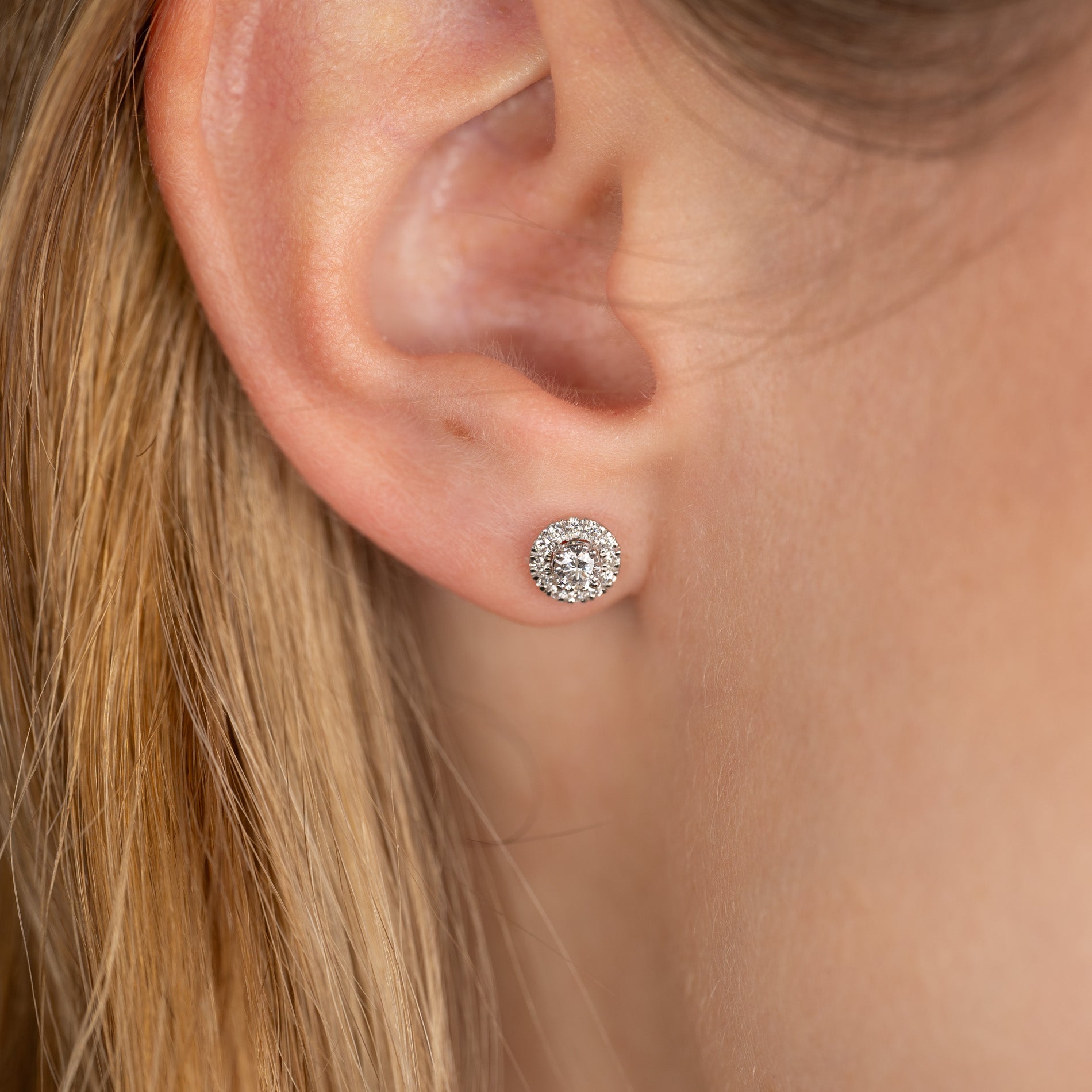 Diamantøredobber i 14 karat hvitt gull med en briljanslipt lab-grown diamant i midten, omkranset av 12 små briljanter i en halo. Halo-designet skaper et elegant og feminint uttrykk, samtidig som øredobben har litt volum.
