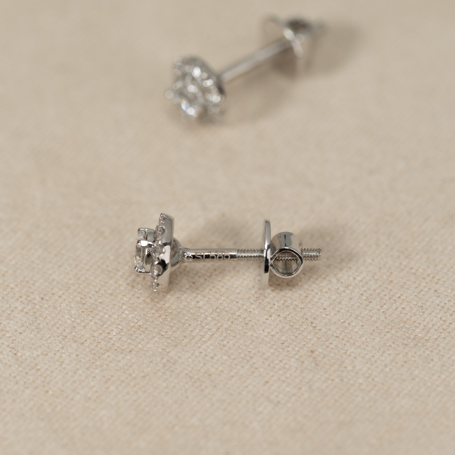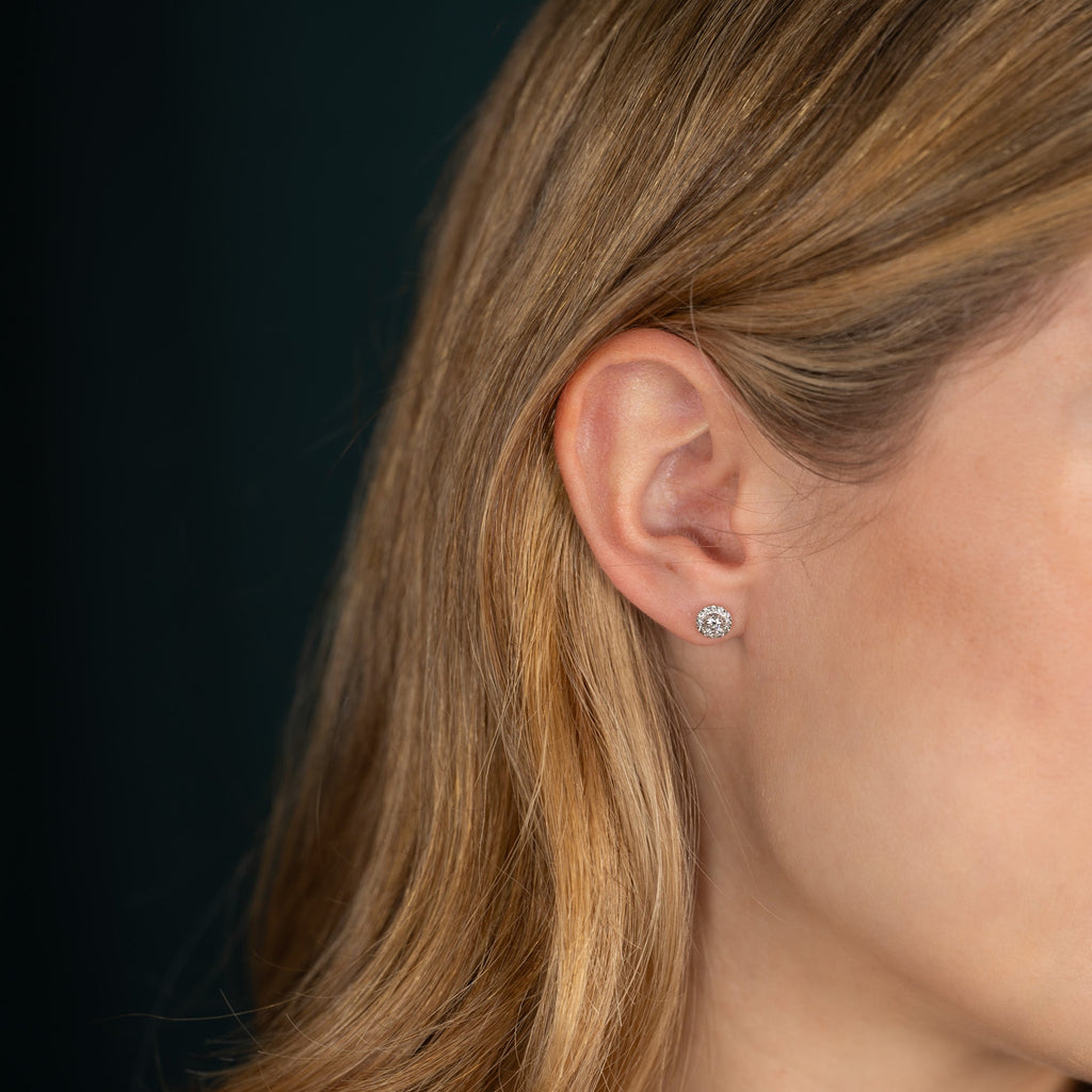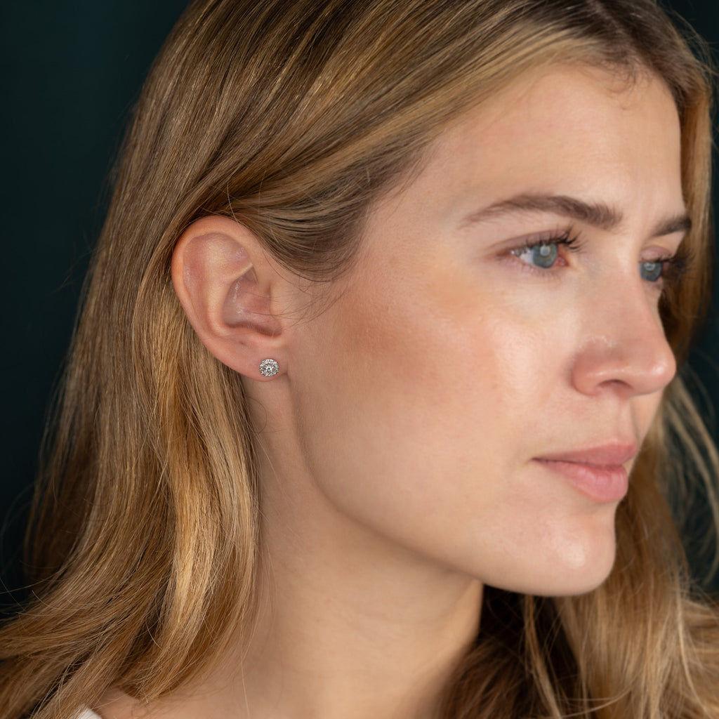 Diamantøredobber i 14 karat hvitt gull med en briljanslipt lab-grown diamant i midten, omkranset av 12 små briljanter i en halo. Halo-designet skaper et elegant og feminint uttrykk, samtidig som øredobben har litt volum.