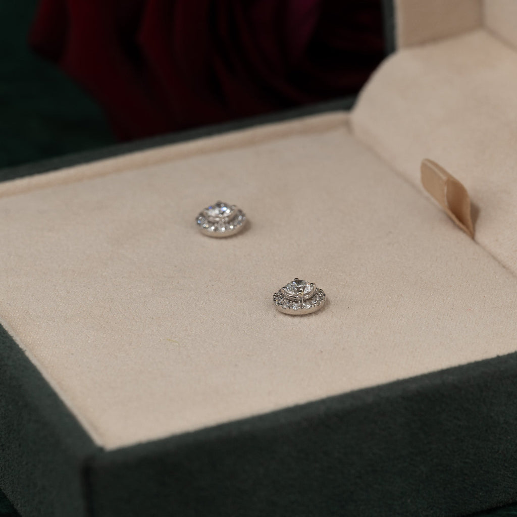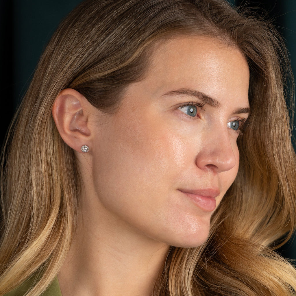 Diamantøredobber i 14 karat hvitt gull med en briljantslipt lab-dyrket diamant i midten omgitt av 12 små diamanter i en halo. Halo-designet gir et elegant og feminint smykke, der øredobben sitter tett inntil øret.