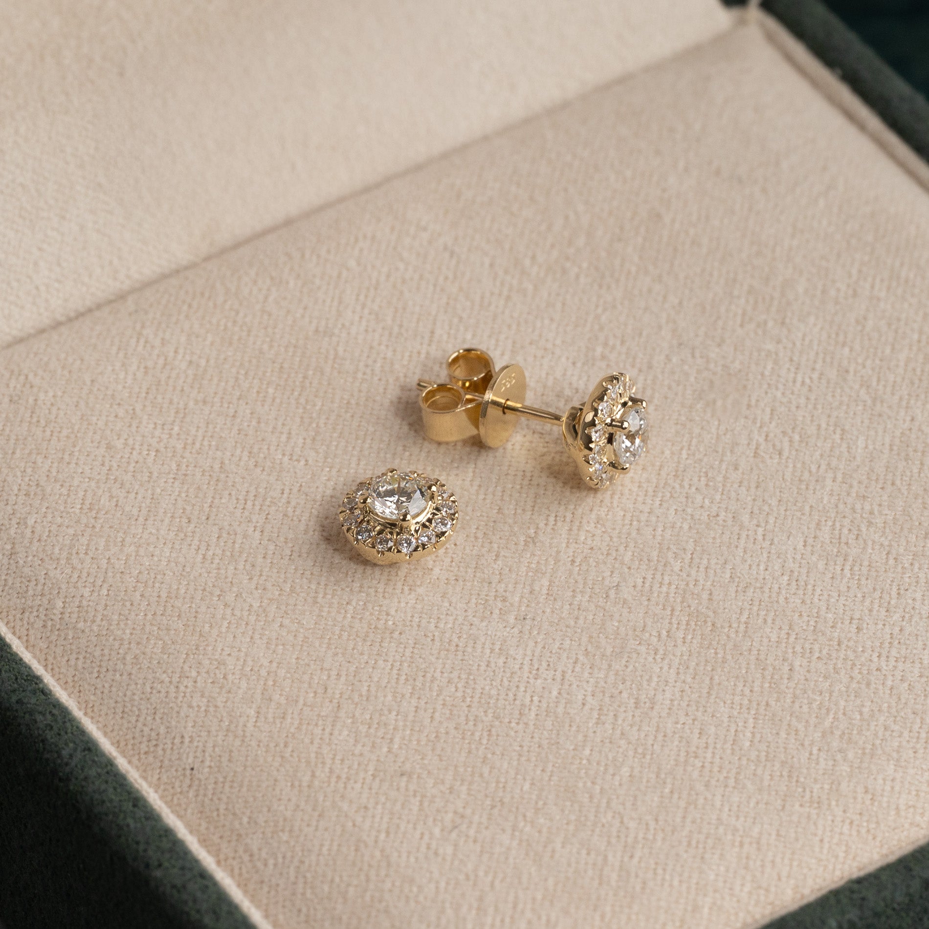 Diamantøredobber i 14 karat gull med en briljantslipt lab-dyrket diamant i midten omgitt av 12 små diamanter i en halo. Halo-designet gir et elegant og feminint smykke, der øredobben sitter tett inntil øret.