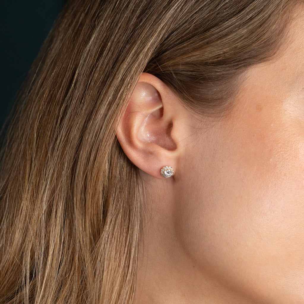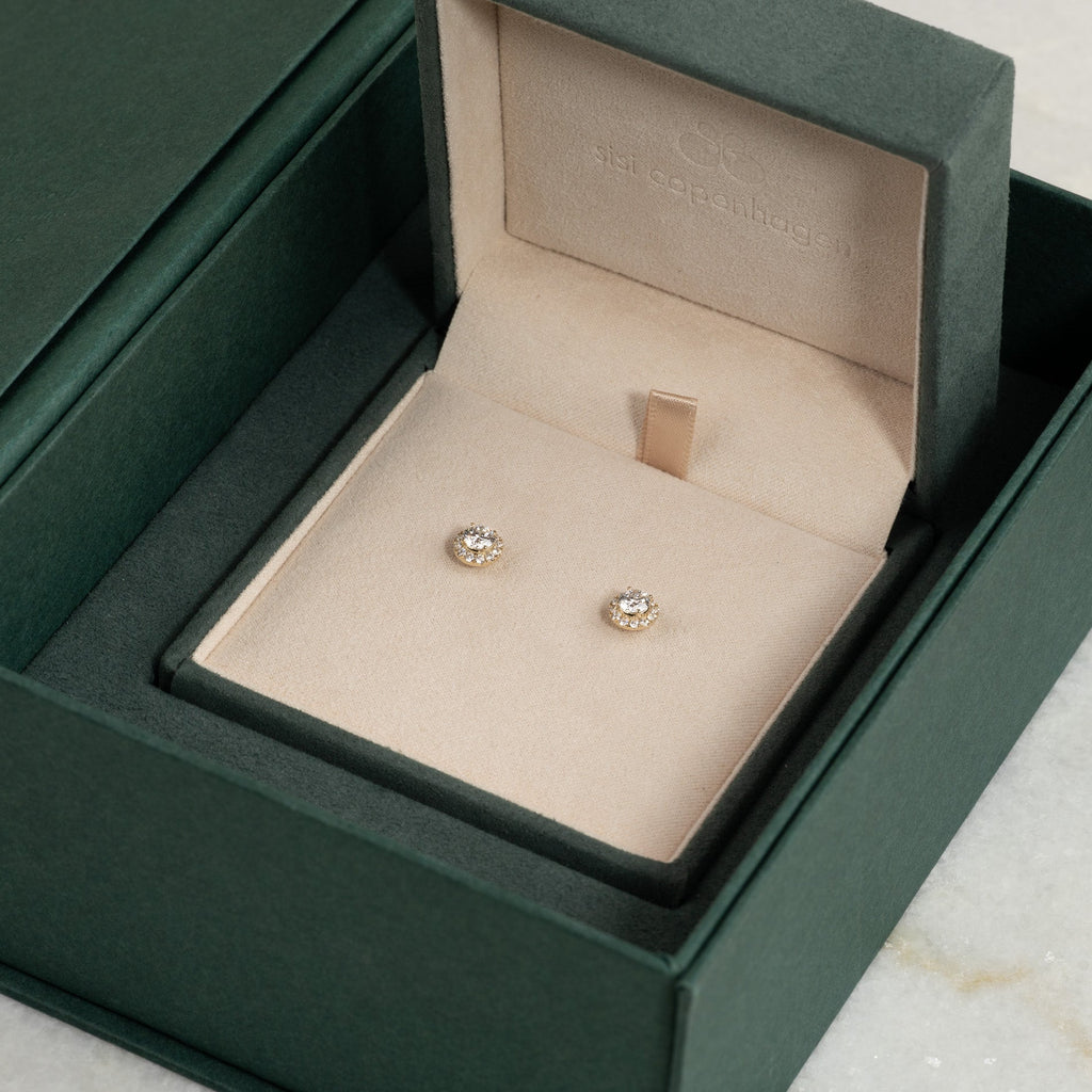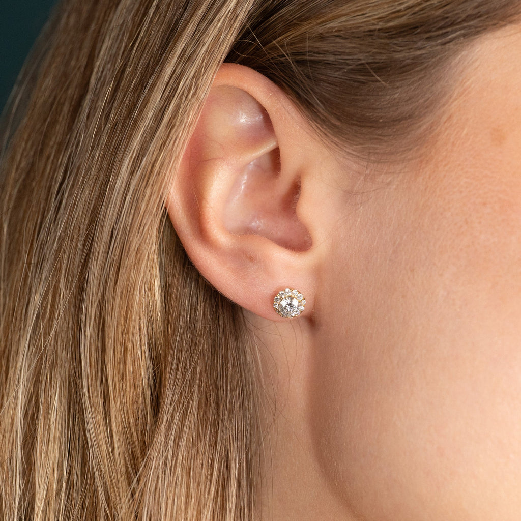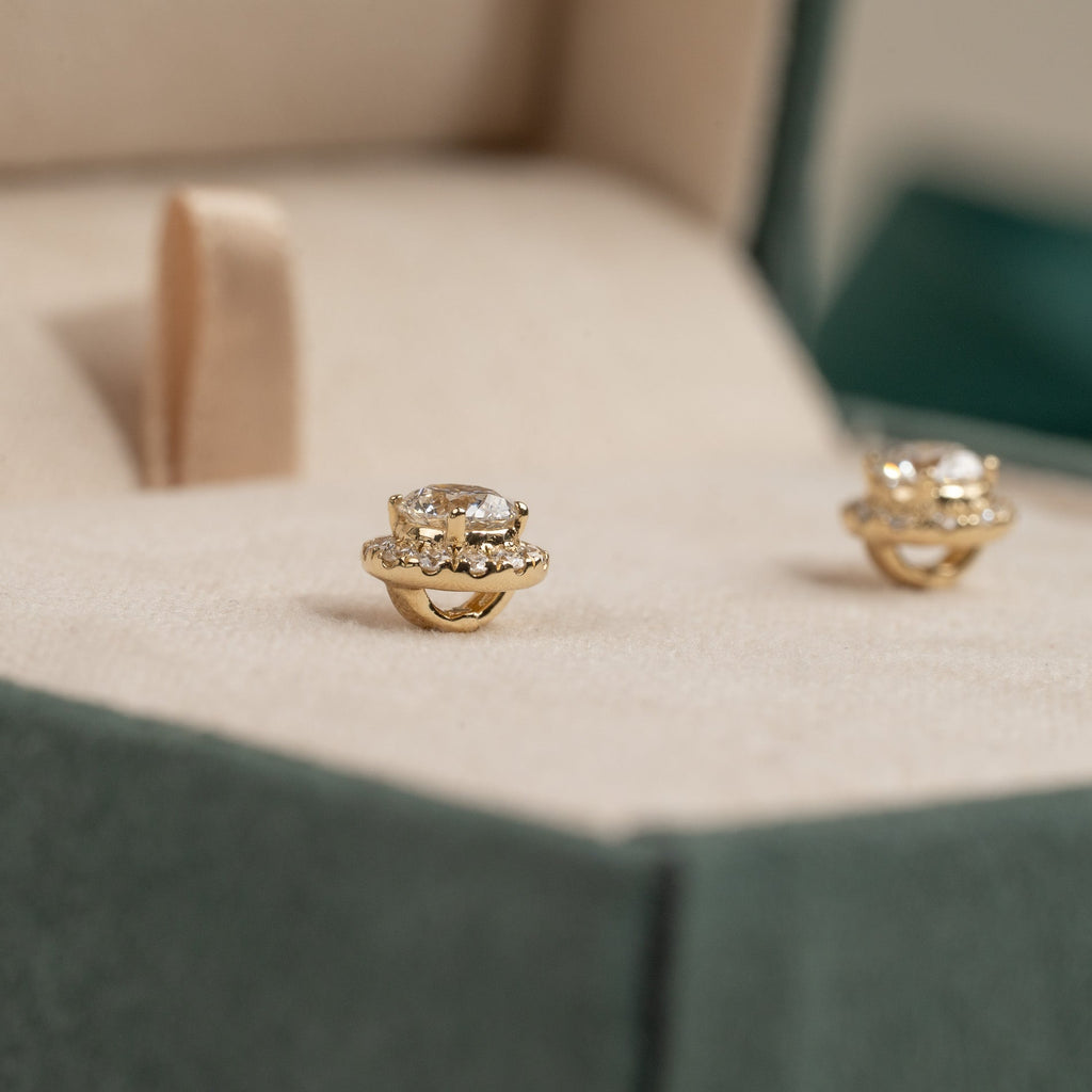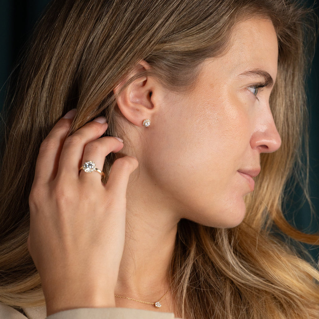 Diamantøreringer i 14 karat gull med en briljantslipt laboratoriediamant i midten, omgitt av 12 små briljantslipte diamanter i en glorie. Glorie-designet skaper et elegant og feminint smykke, som gir øreringene en vakker total diameter samtidig som de sitter tett inntil øret.