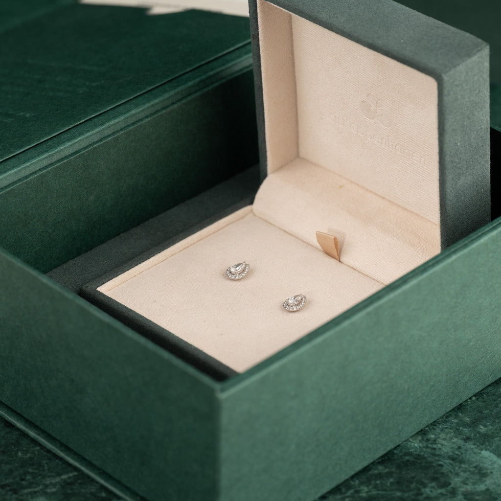Øredobbene leveres i vår eksklusive Diamond Collection-boks med gavebånd. I boksen finner du en smykkeeske, sertifikat og smykkepose.