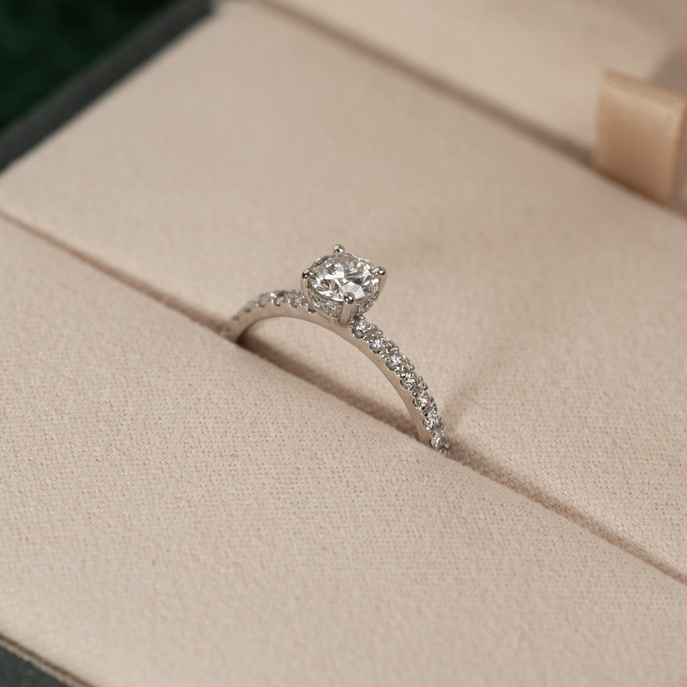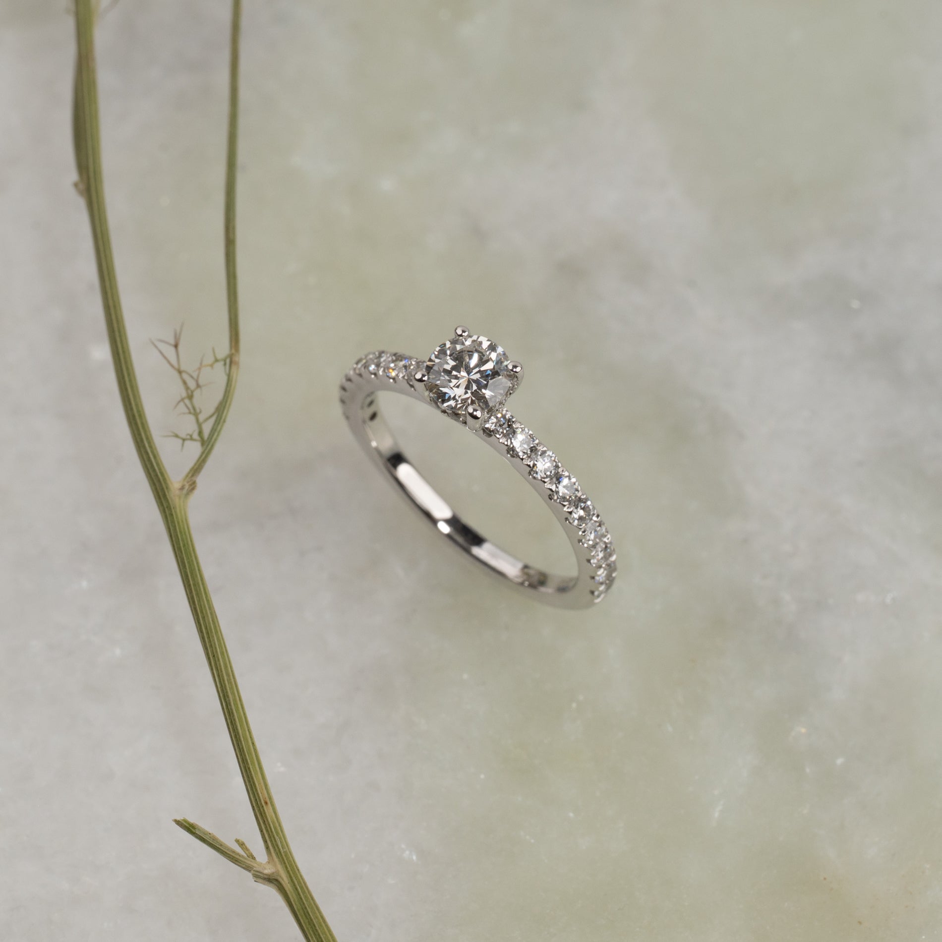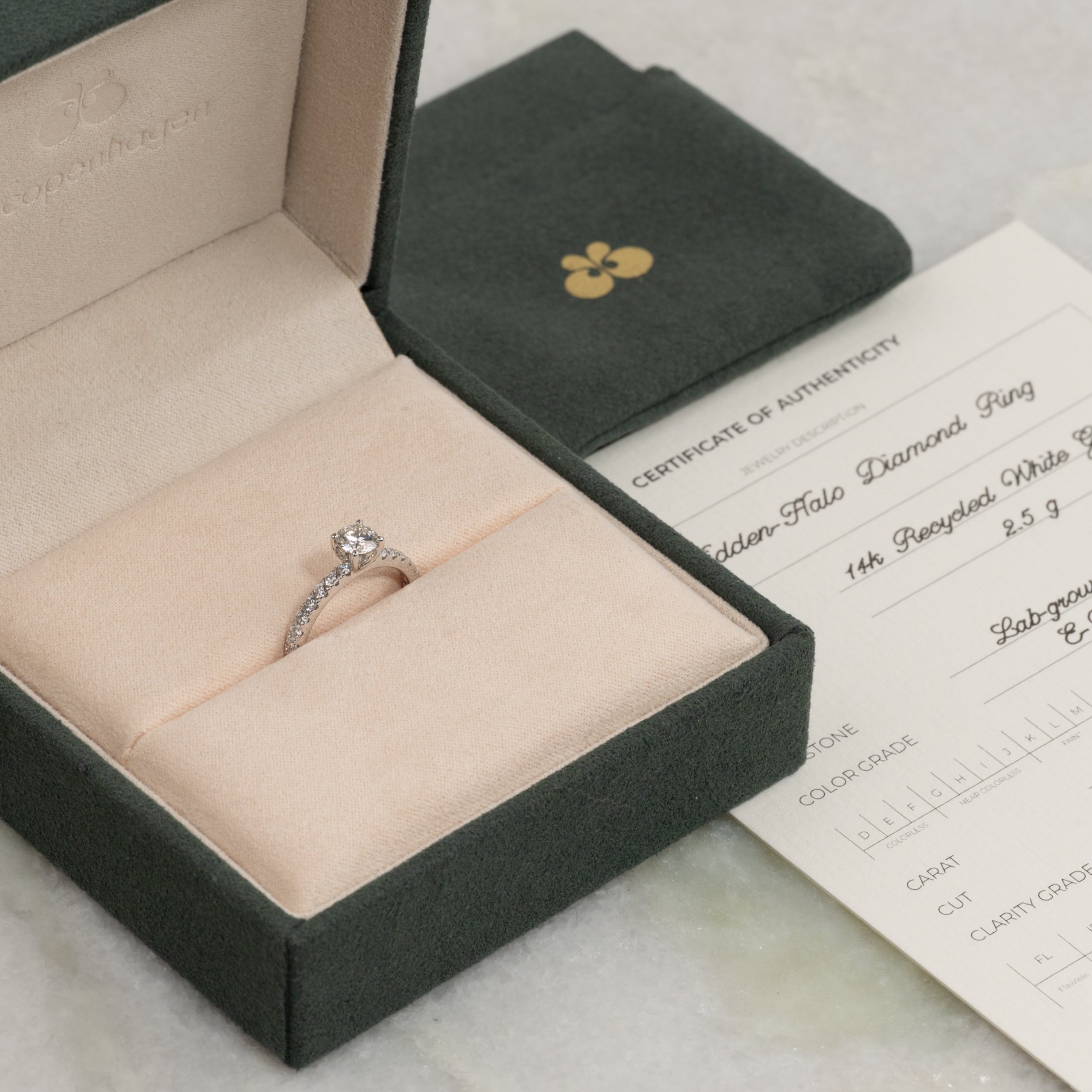 Nydelig ring i 14 karat massivt hvitt gull med laboratoriedyrkede diamanter. Ringen består av en 0,5 ct. briljant, klassisk satt i en hidden-halo - en liten krans av små diamanter rundt midtstenen i selve omfatningen. Ringen er også satt med diamanter på øvre halvdel av ringskinnen.