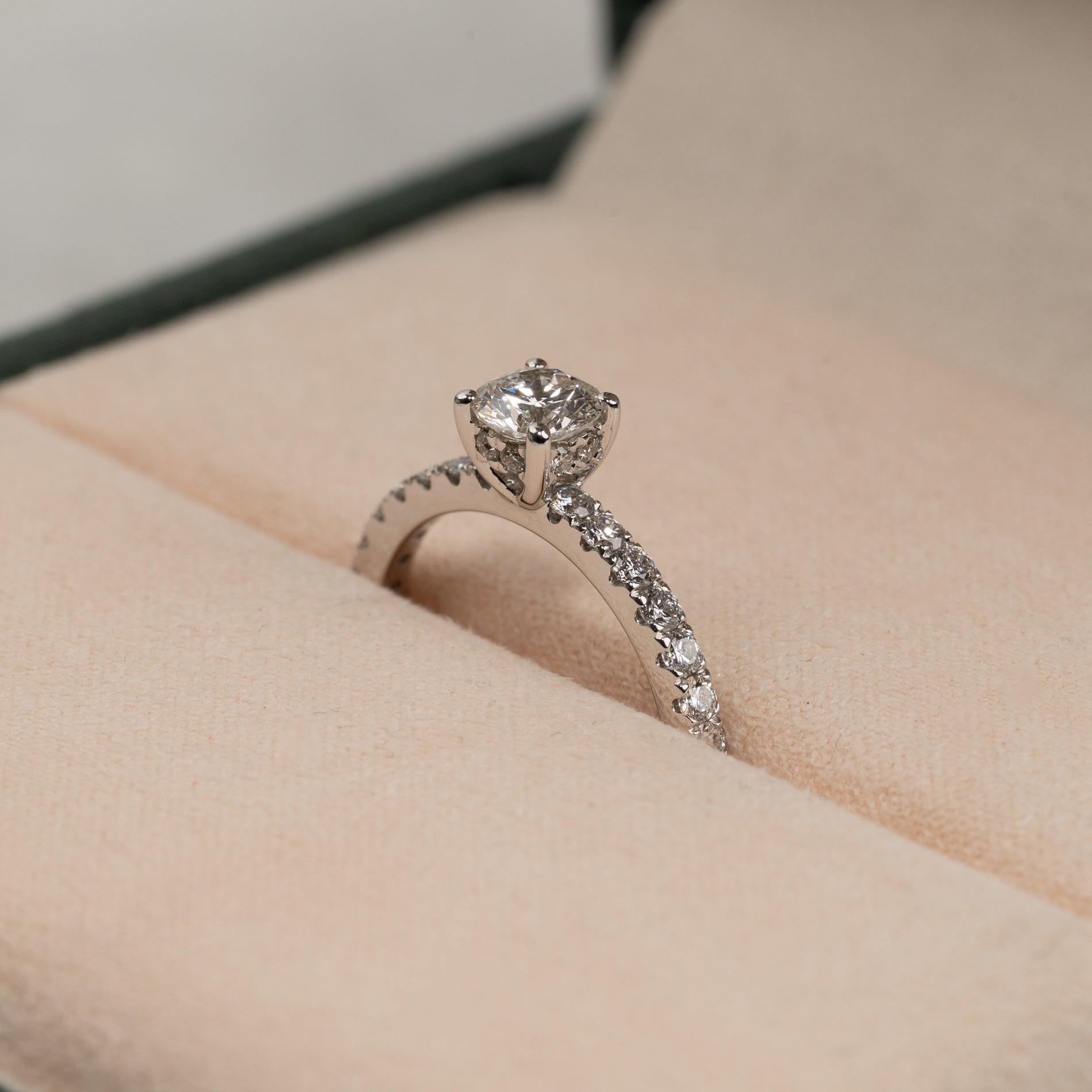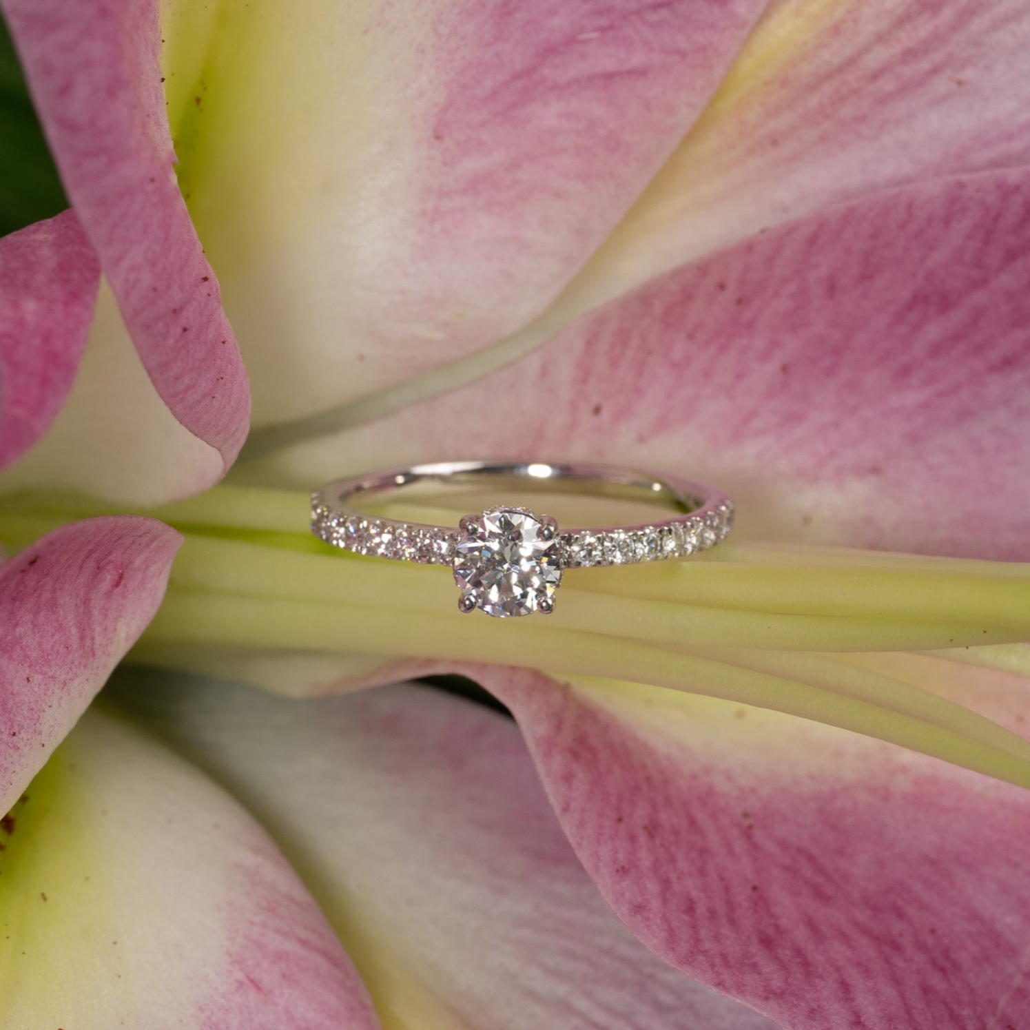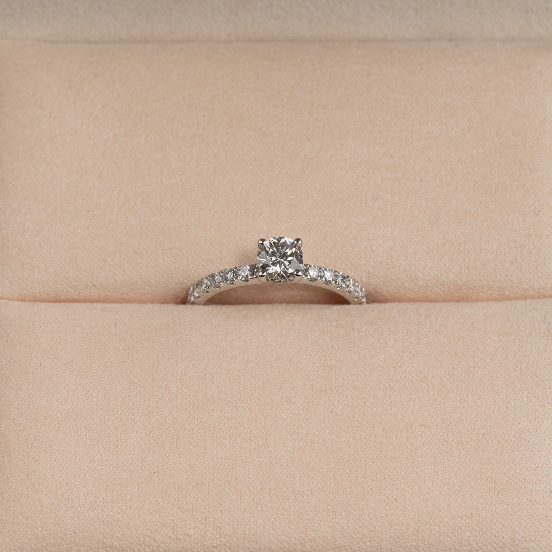 Nydelig ring i 14 karat massivt hvitt gull med laboratoriedyrkede diamanter. Ringen består av en 0,5 ct. briljant, klassisk satt i en hidden-halo - en liten krans av små diamanter rundt midtstenen i selve omfatningen. Ringen er også satt med diamanter på øvre halvdel av ringskinnen.