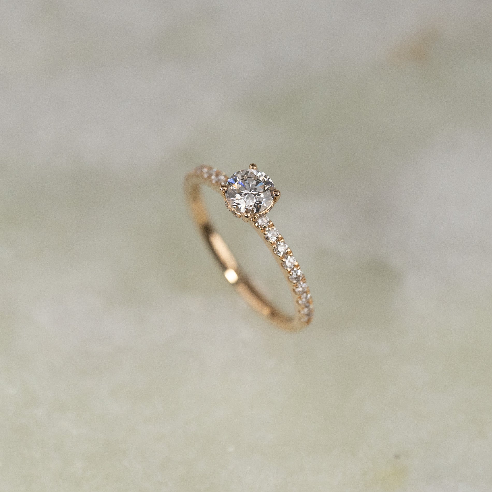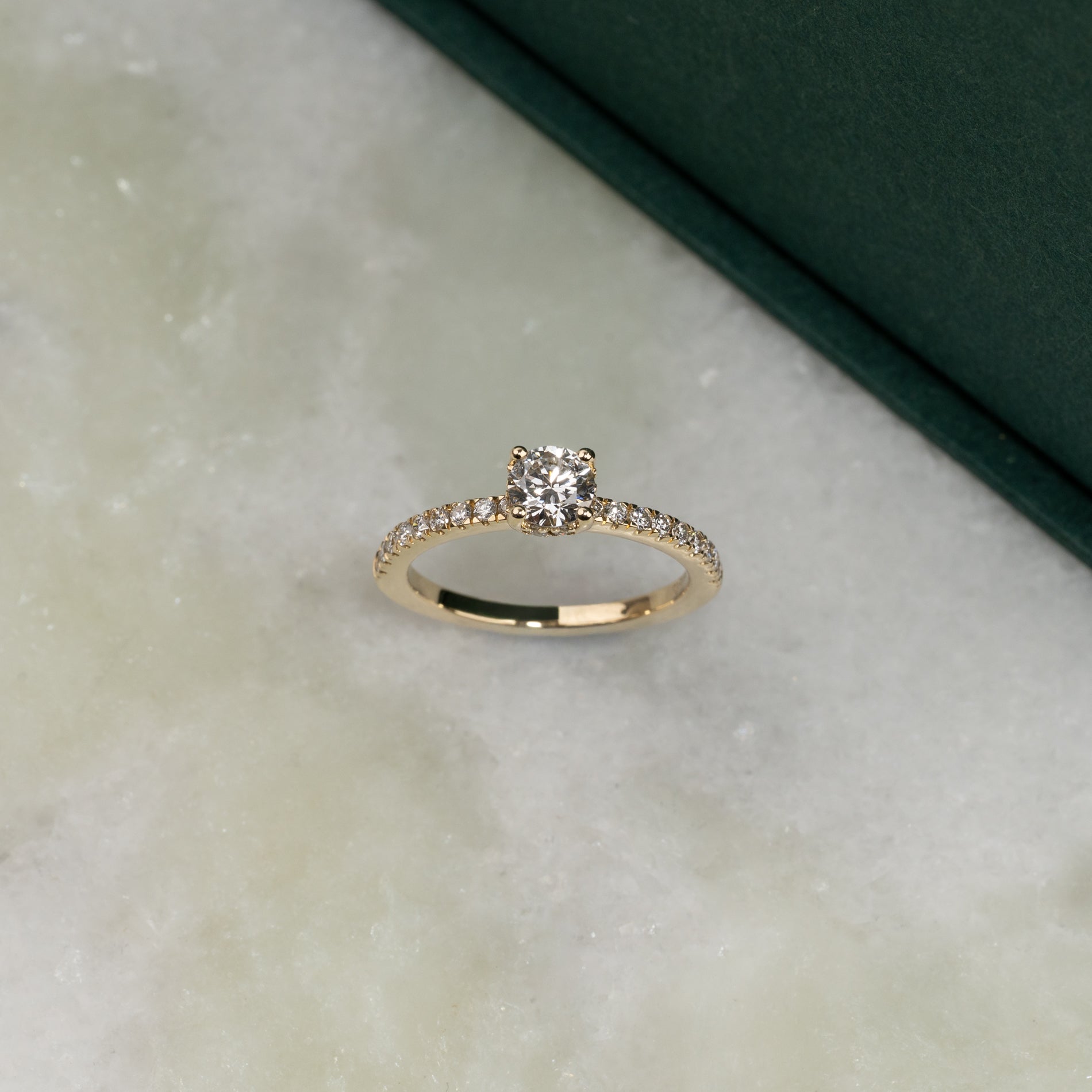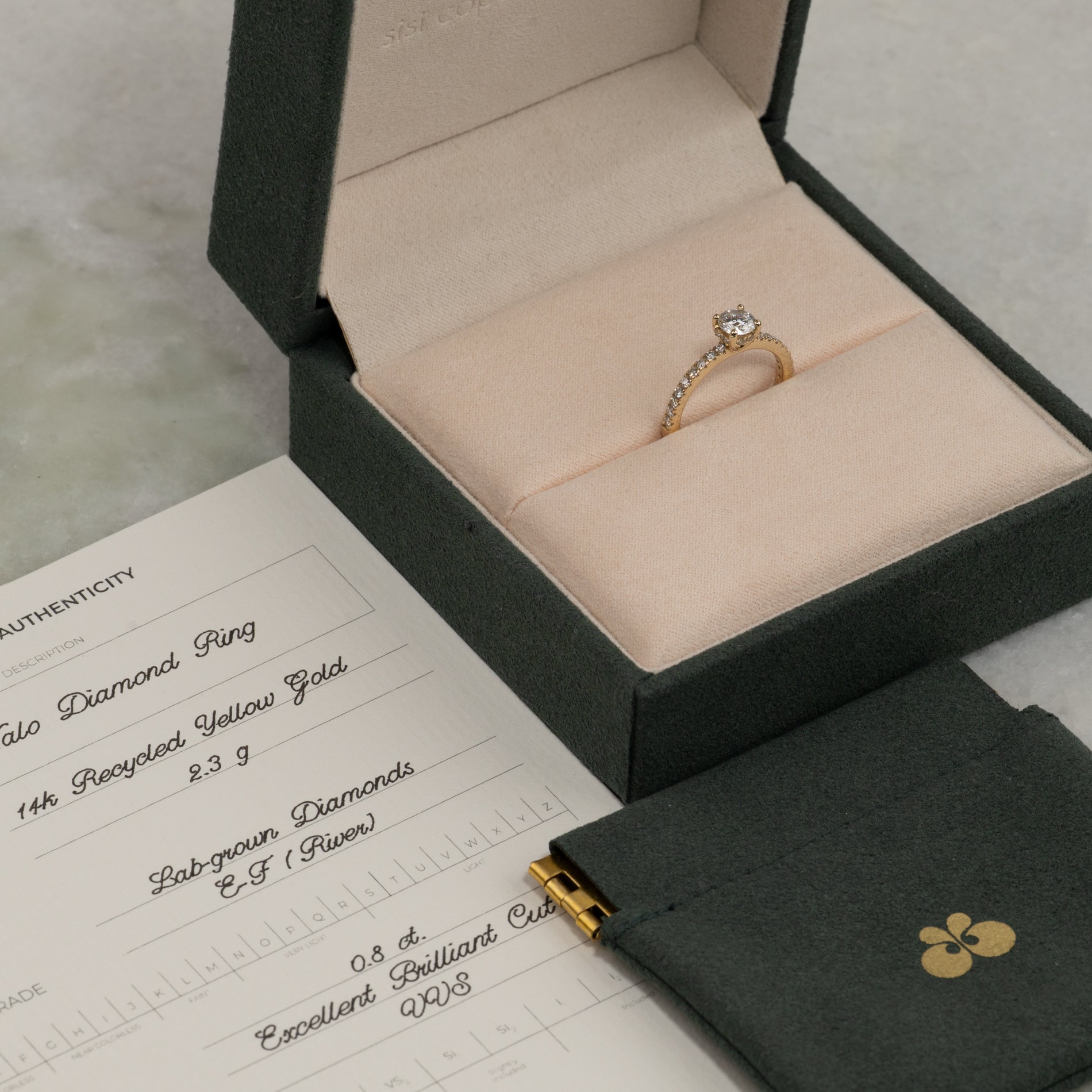 Ringen er laget av 14 karat massivt gull med lab-grown diamanter på totalt 0,8 ct. Diamantene har fargen E/F (River) og klarheten VVS. Smykket er skapt med omtanke; diamantene er produsert med blant annet solenergi, og guldet er 100% sertifisert resirkulert.