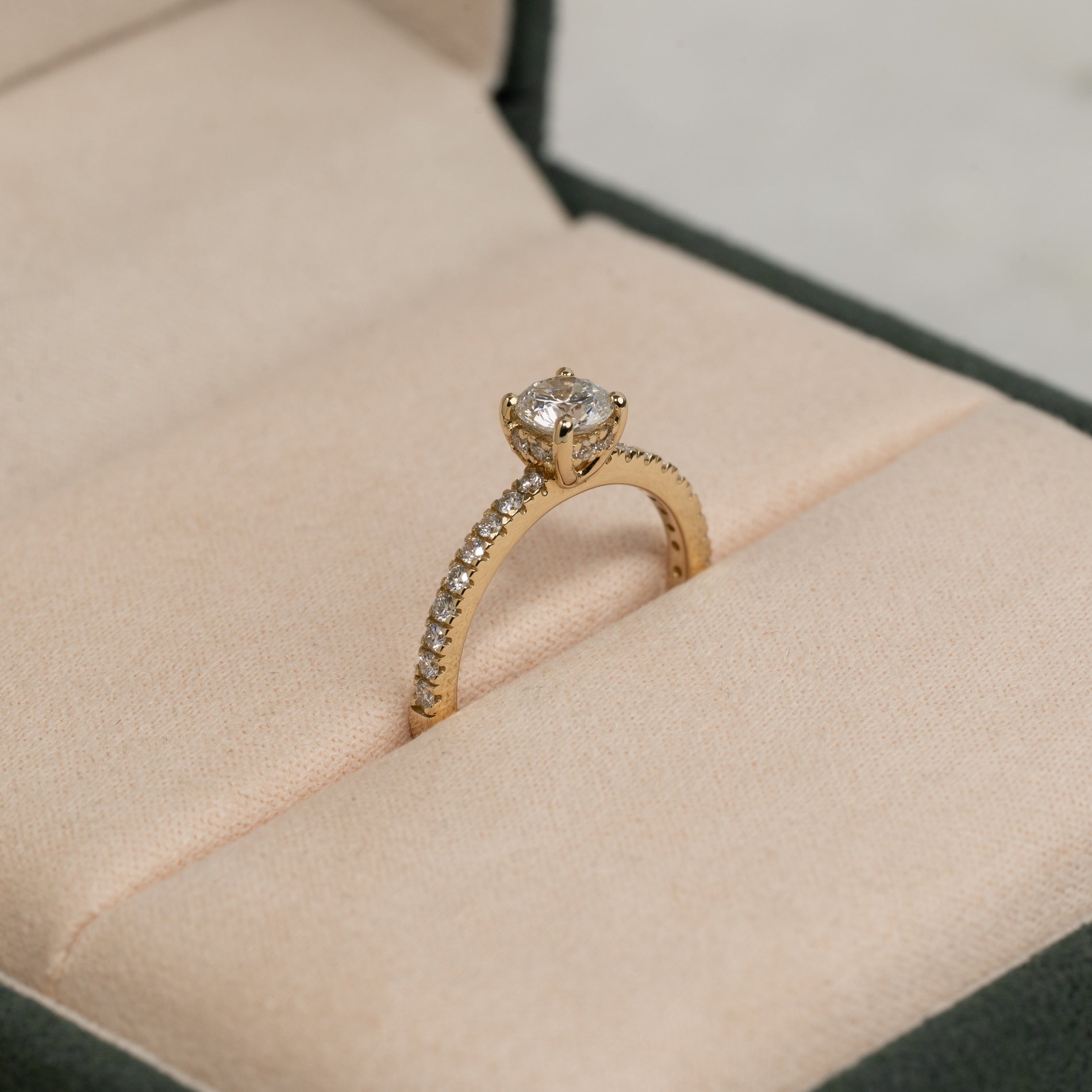 Vakker ring i 14 karat massivt gull med lab-grown diamanter. Ringen består av en 0,5 ct. briljant som er klassisk innfattet med hidden-halo – en krans av små diamanter som sitter rundt sentrumstenen på selve innfatningen. Ringen er dessuten besatt med diamanter på den øvre halvdelen av ringskinnen.