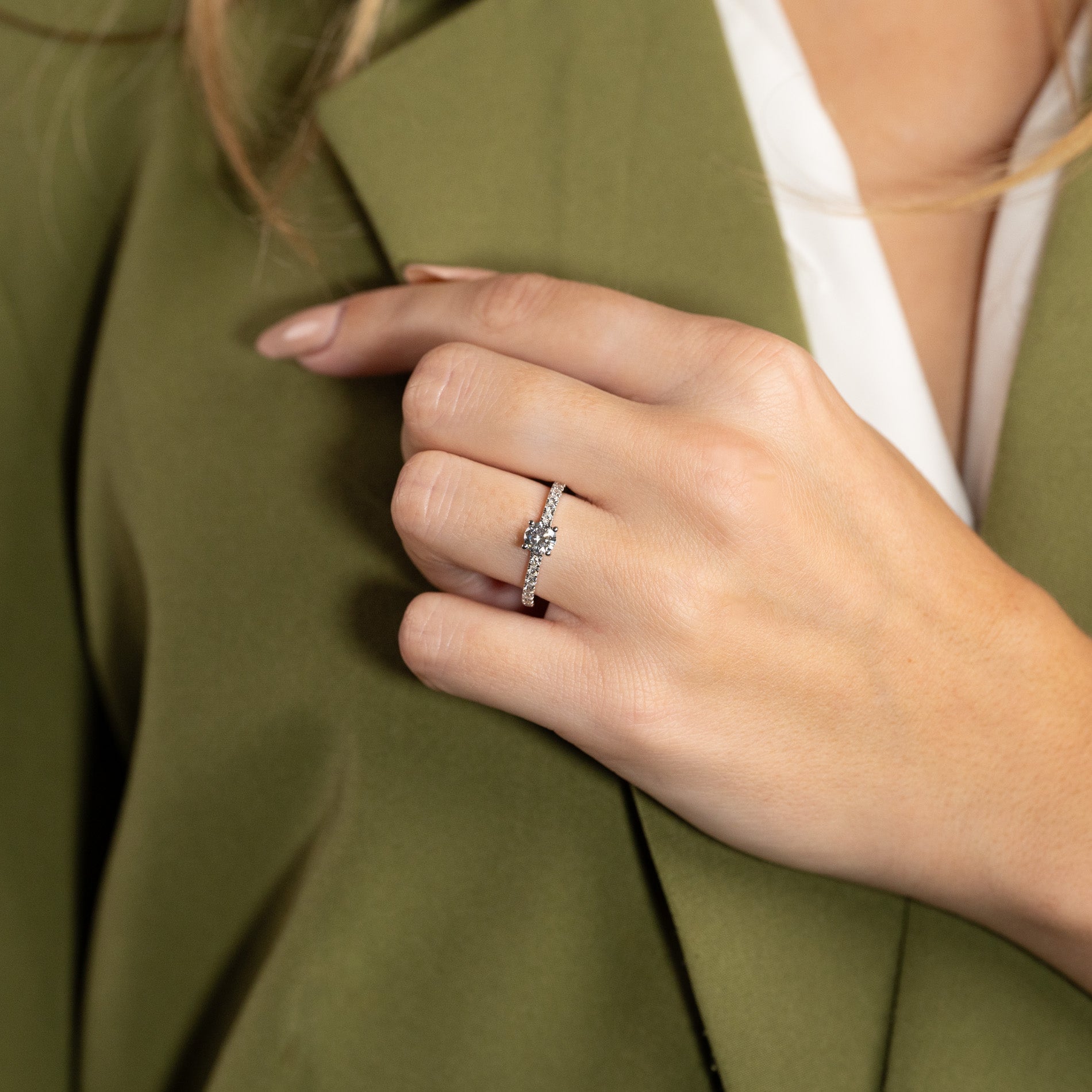 Ringen er i 14 karat hvitt gull med laboratorie-skapte diamanter på totalt 1,0 ct. Diamantene har fargen E/F (River) og klarheten VVS. Smykket er laget med omtanke; diamantene er produsert med blant annet solenergi, og gullet er 100% sertifisert resirkulert.