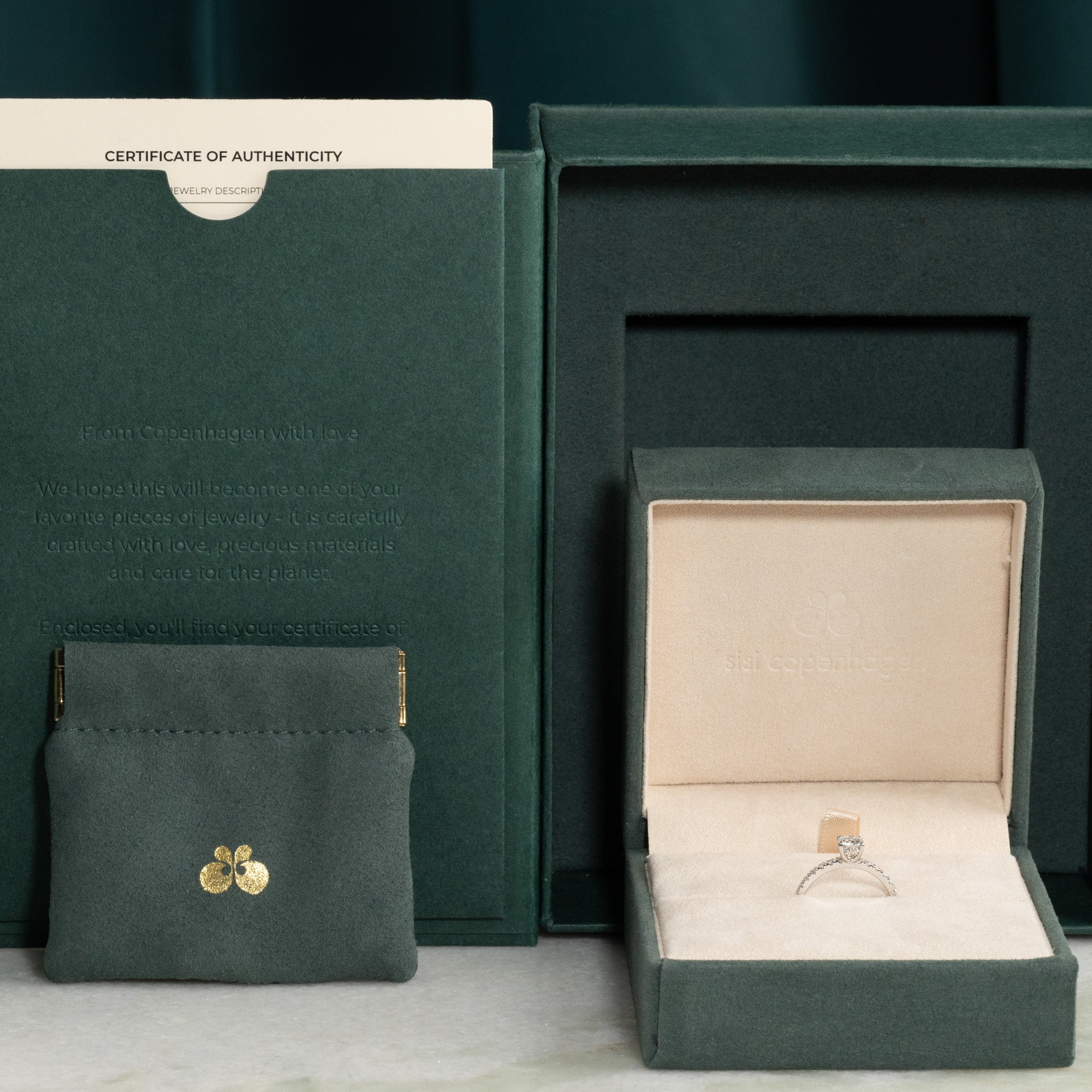 Når du mottar smykket, vil det være i vår gaveeske, bundet med et vakkert matchende silkebånd, klar til å gis som gave. Inne i esken finner du en smykkeboks, en pose og et ekthetsbevis.