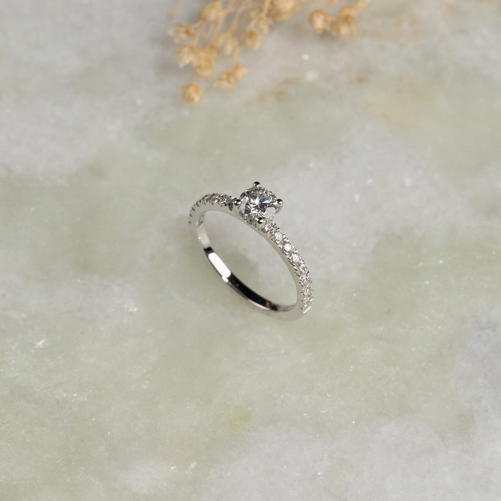 Nydelig ring i 14 karat hvitt gull med laboratorie-skapte diamanter. Ringen består av en 0,5 ct. briljant som en midtsten, klassisk besatt med en hidden-halo - en krans av små diamanter som sitter rundt midtstenen på selve omfatningen. Ringen er også besatt med diamanter på øvre halvdel av ringskinnen - totalt 0,5 ct. diamanter som sidestener.