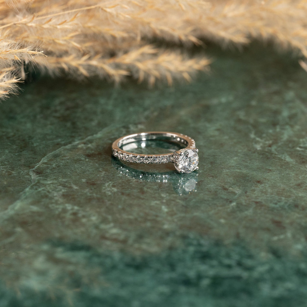 Ringen er i 14 karat hvitt gull med laboratorie-skapte diamanter på totalt 1,25 ct. Diamantene har fargen E/F (River) og klarheten VVS. Smykket er laget med omtanke; diamantene er produsert med blant annet solenergi, og gullet er 100% sertifisert resirkulert.