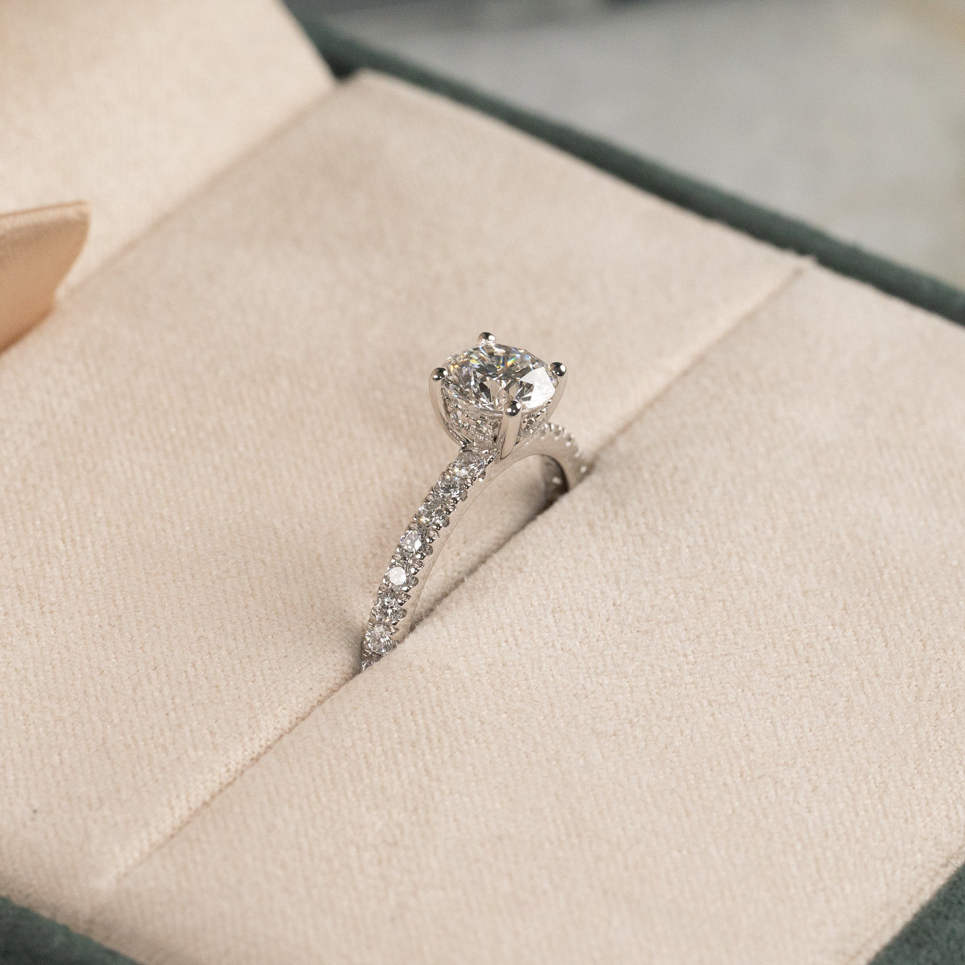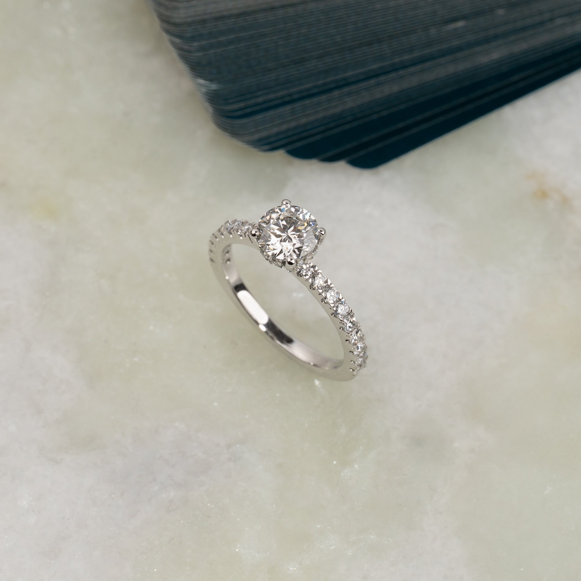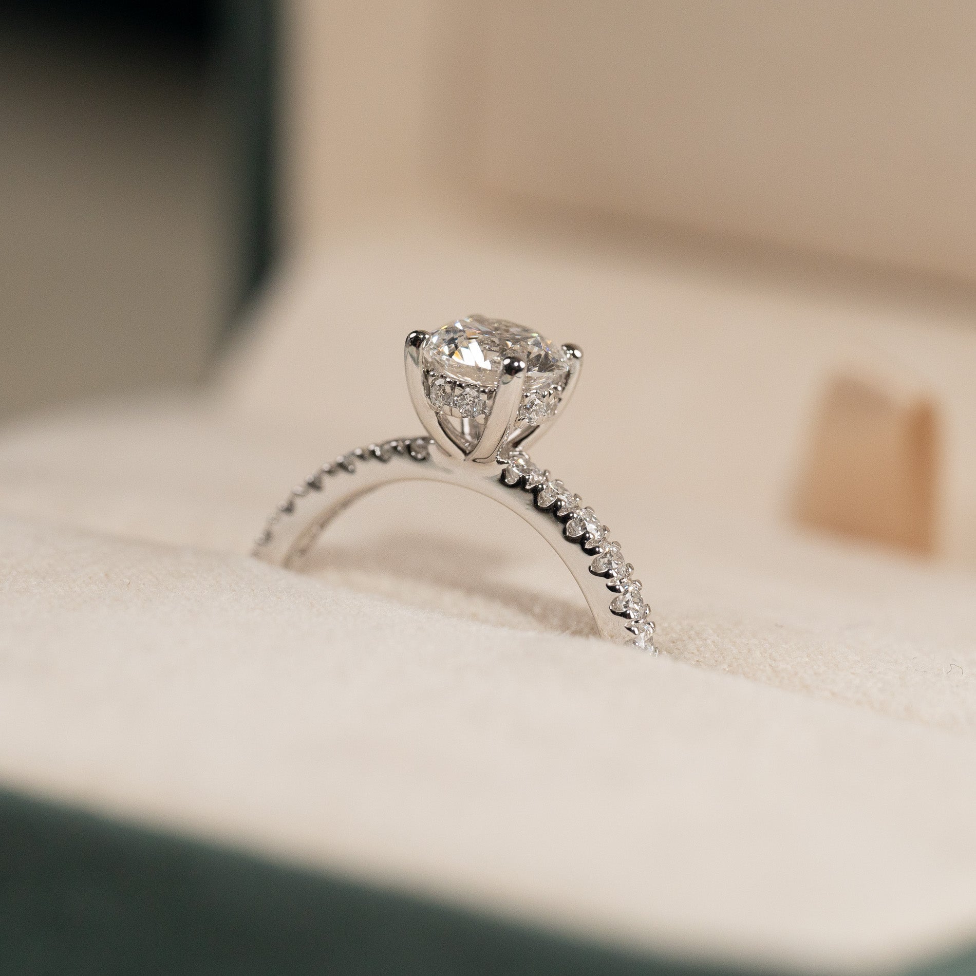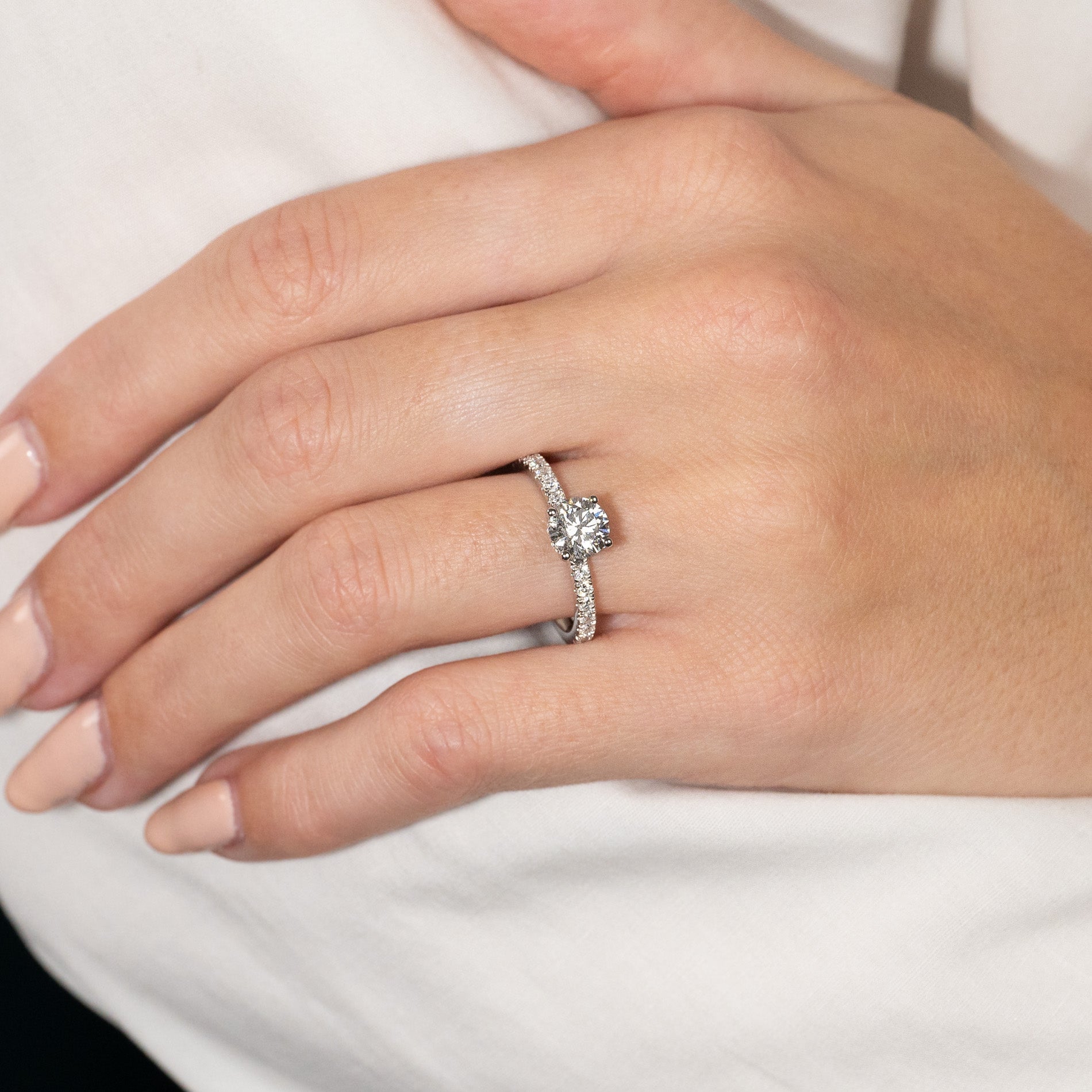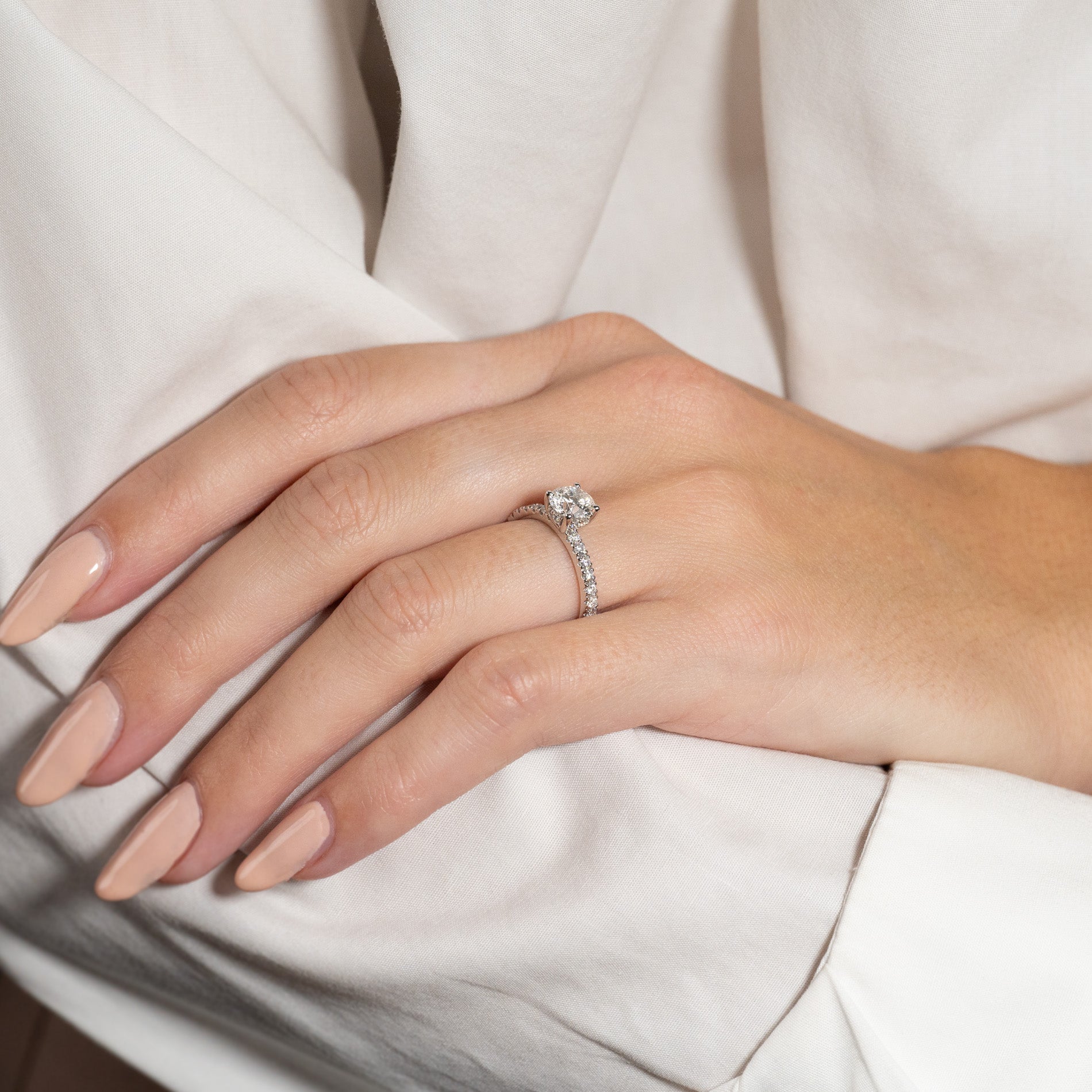 Ringen er i 14 karat hvitt gull med laboratorie-skapte diamanter på totalt 1,50 ct. Diamantene har fargen E/F (River) og klarheten VVS. Smykket er laget med omtanke; diamantene er produsert med blant annet solenergi, og gullet er 100% sertifisert resirkulert.