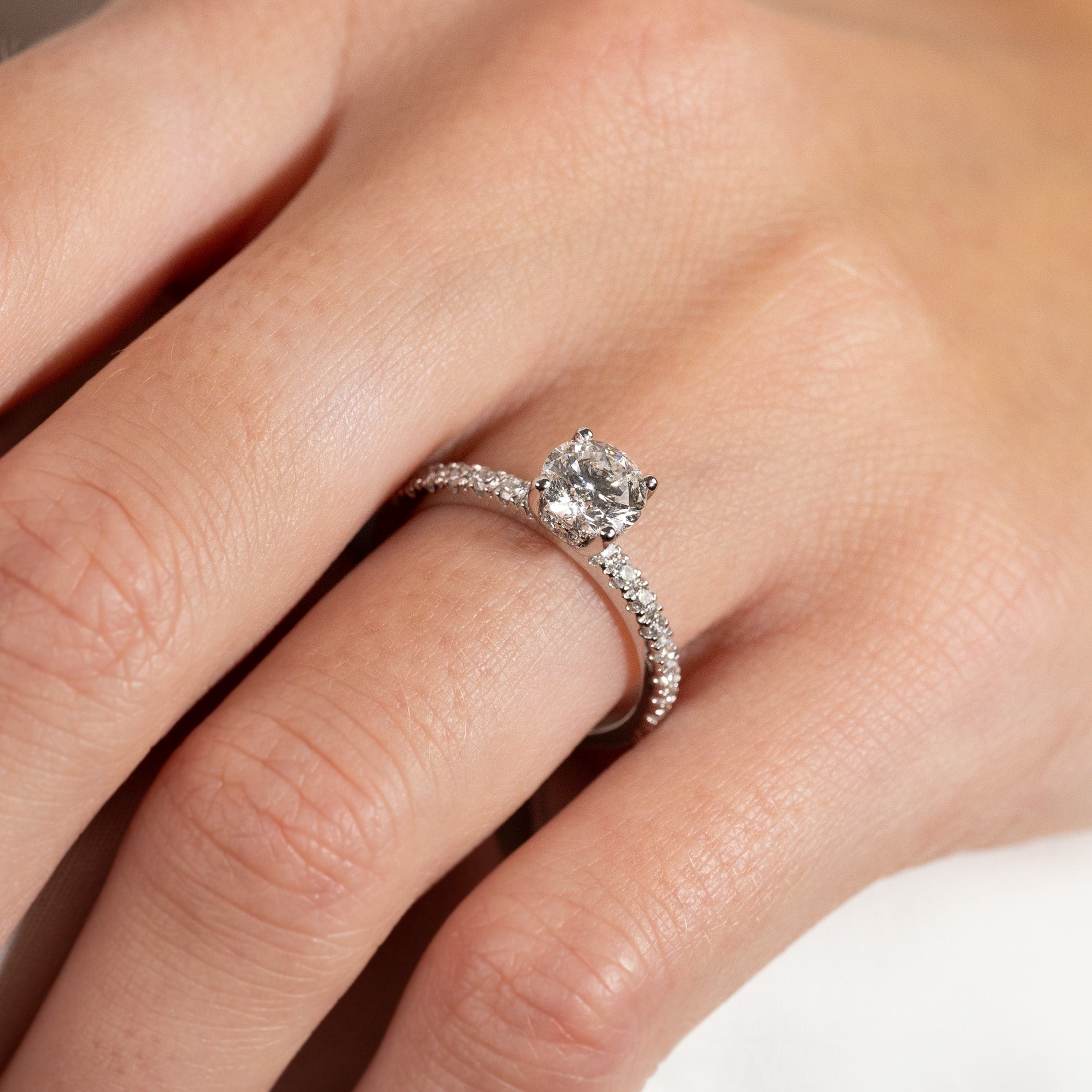 Nydelig ring i 14 hvitt karat gull med laboratorie-skapte diamanter. Ringen består av en 1,0 ct. briljant som en midtsten, klassisk besatt med en hidden-halo - en krans av små diamanter som sitter rundt midtstenen på selve omfatningen. Ringen er også besatt med diamanter på øvre halvdel av ringskinnen - totalt 0,5 ct. diamanter som sidestener.
