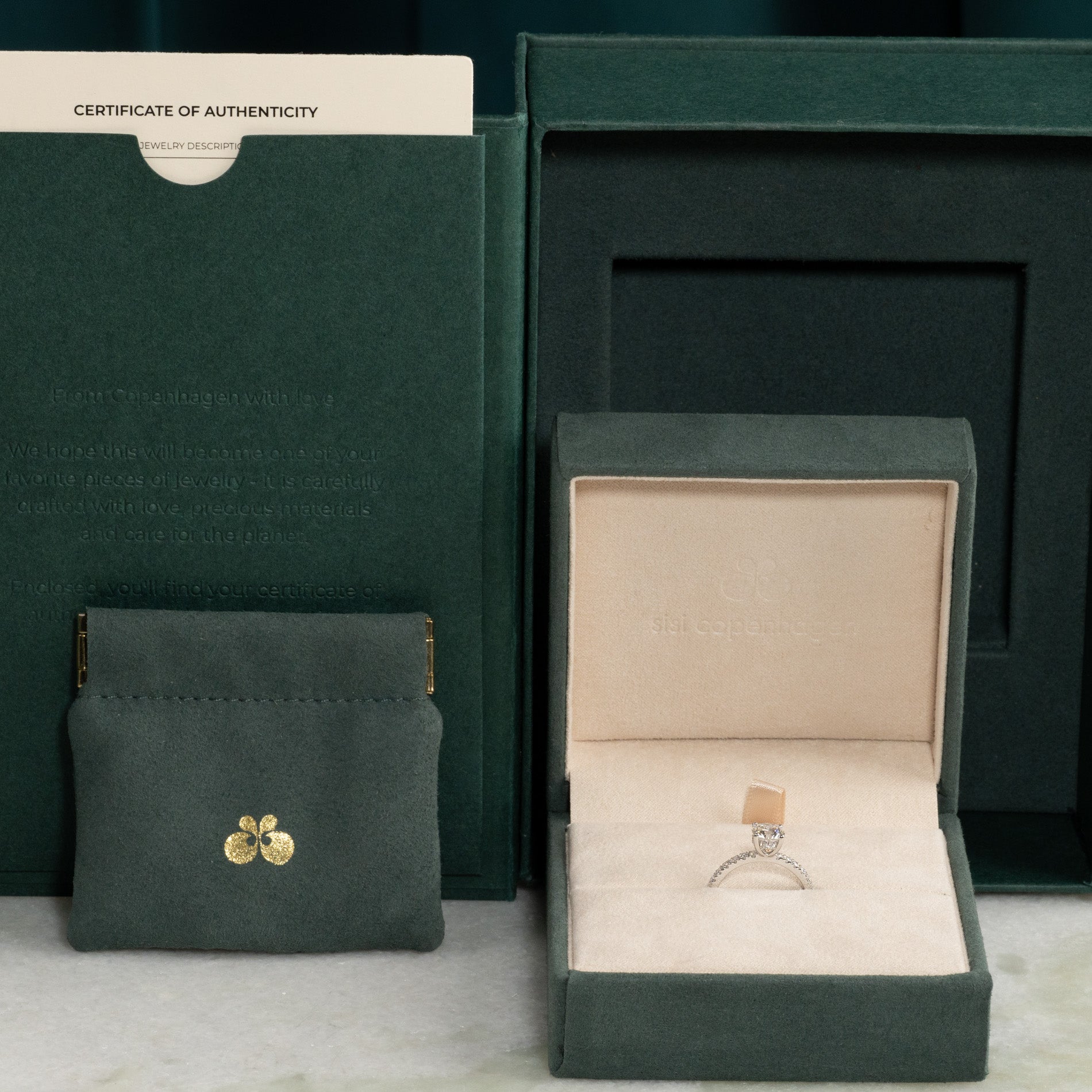Når du mottar smykket, vil det være i vår gaveeske, bundet med et vakkert matchende silkebånd, klar til å gis som gave. Inne i esken finner du en smykkeboks, en pose og et ekthetsbevis.