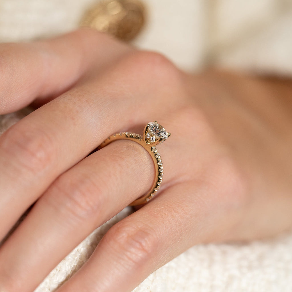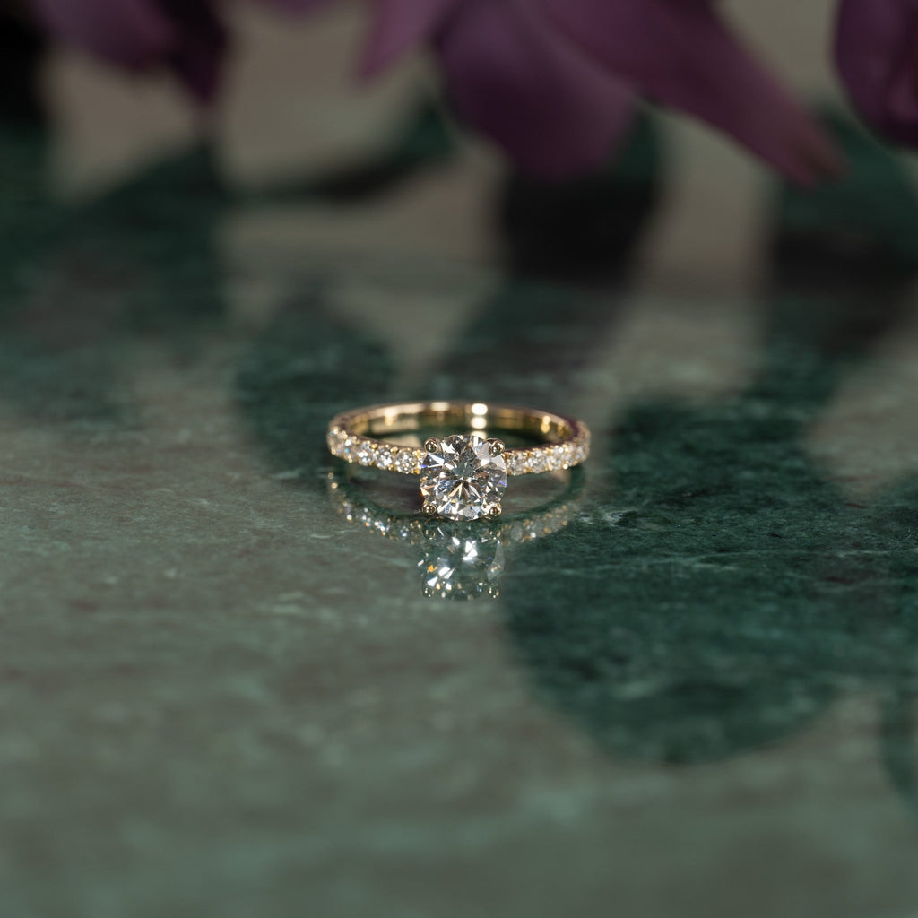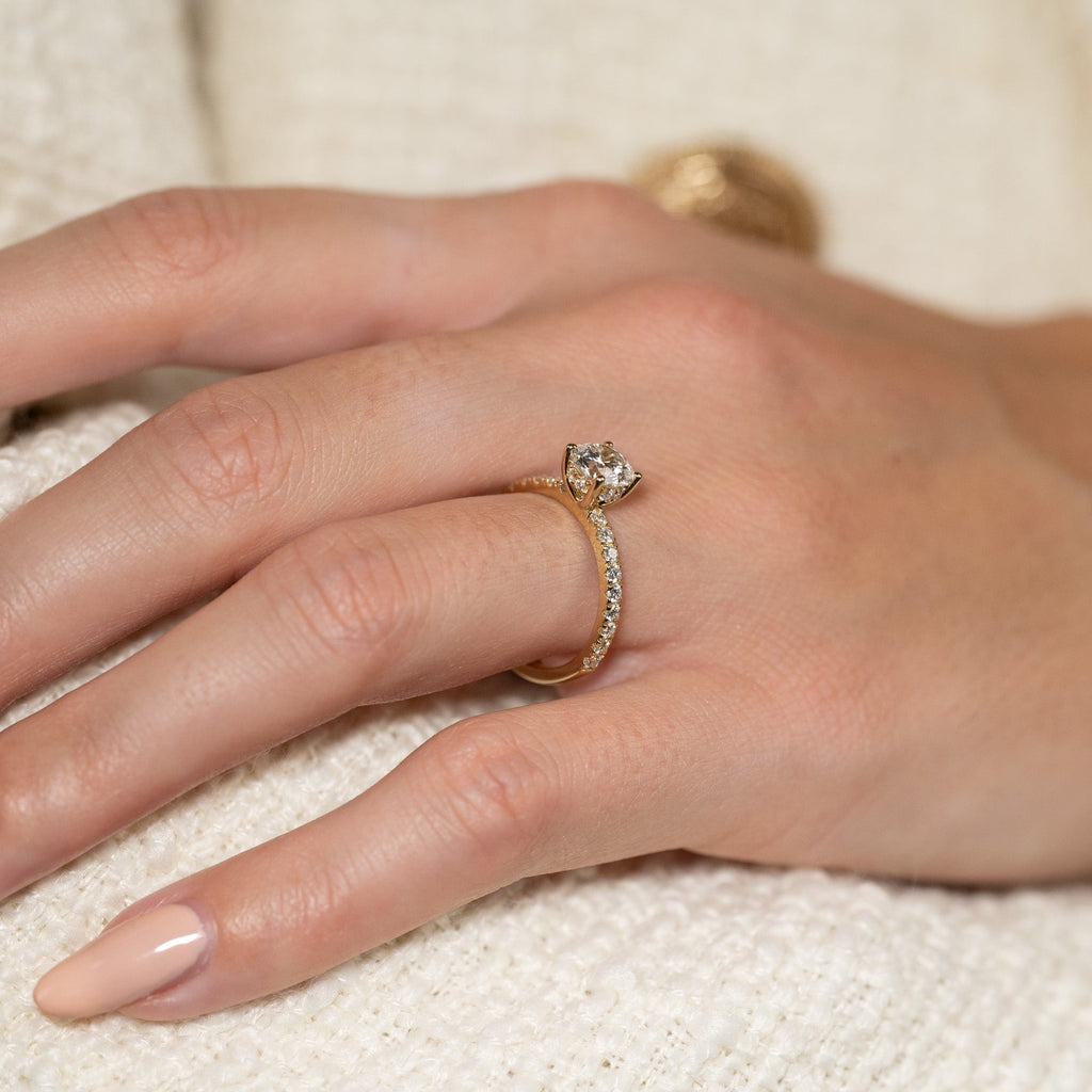 Ringen er i 14 karat gull med lab-dyrkede diamanter på totalt 1,5 ct. Diamantene har fargen E/F (River) og klarheten VVS. Smykket er laget med omhu; diamantene er produsert med blant annet solenergi, og gullet er 100% sertifisert resirkulert.